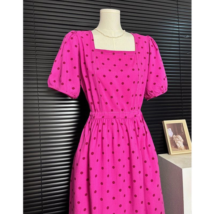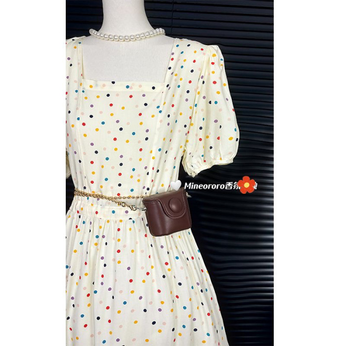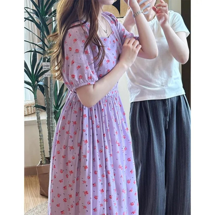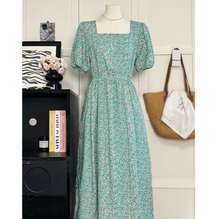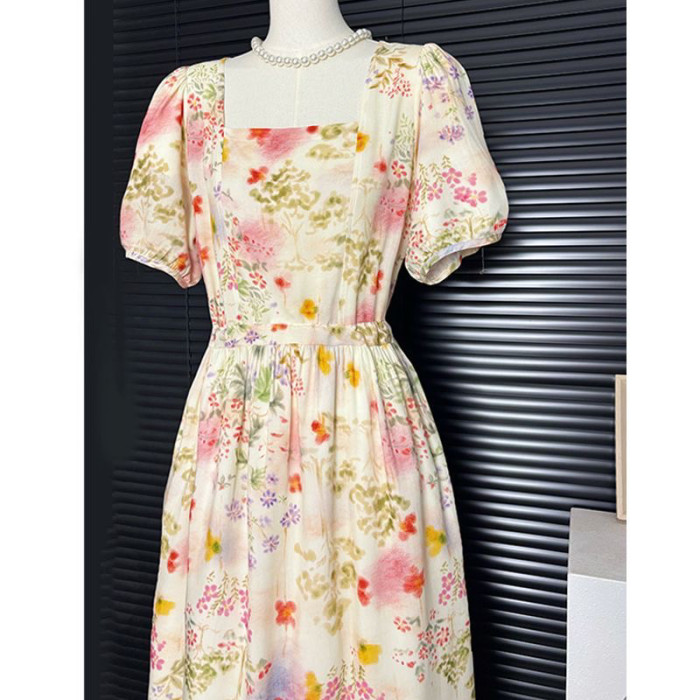 韓版棉綢連衣裙法式高級泡泡袖田園風甜美中長款大碼裙子顯瘦遮肉