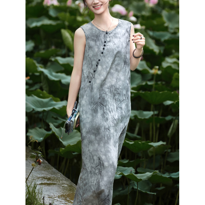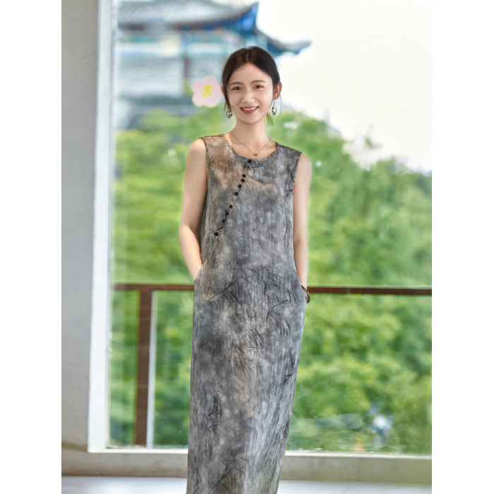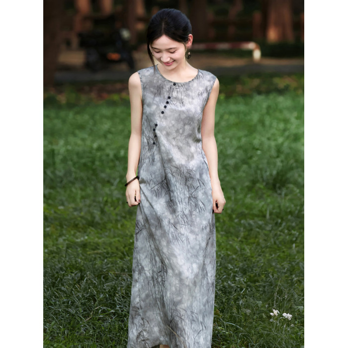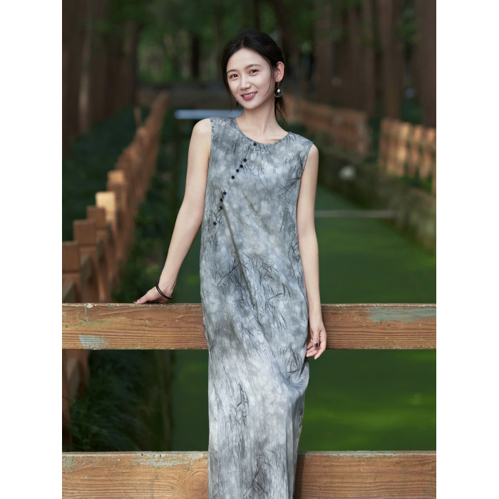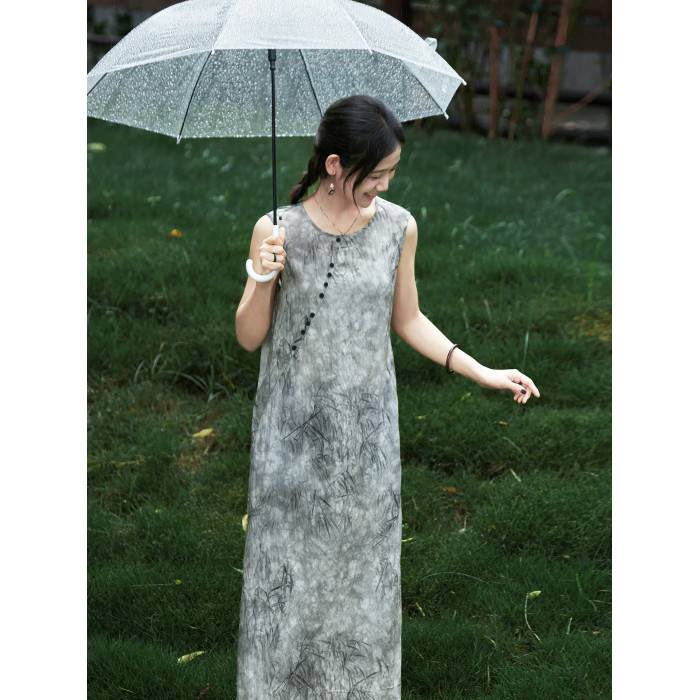 漿果“竹影”雲菸灰青雅水墨畫般輕中式人棉圓領無袖直身連衣裙