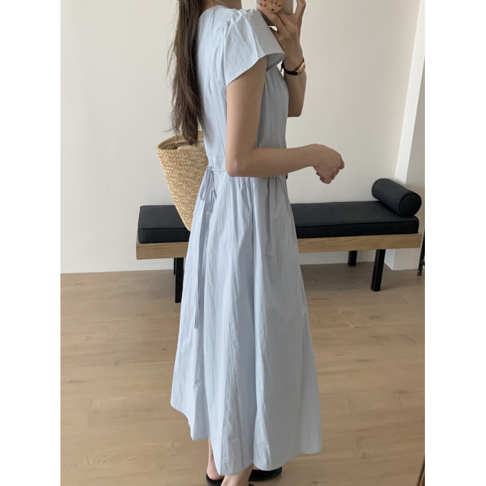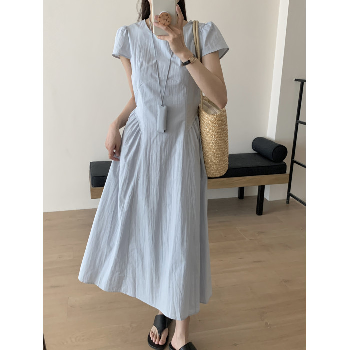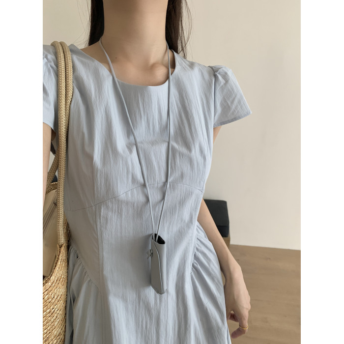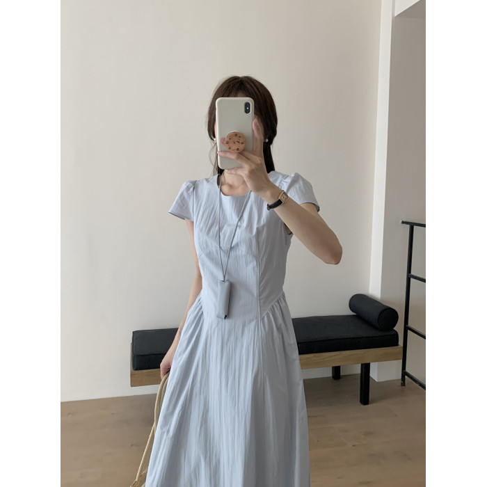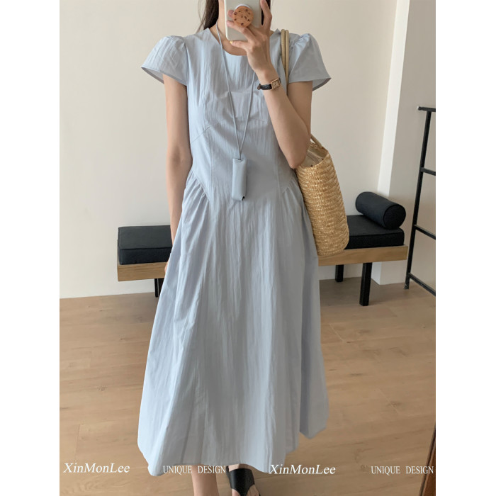 高級感氣質海邊度假風減齡連衣裙夏季短袖拼接顯瘦小衆收腰長裙女