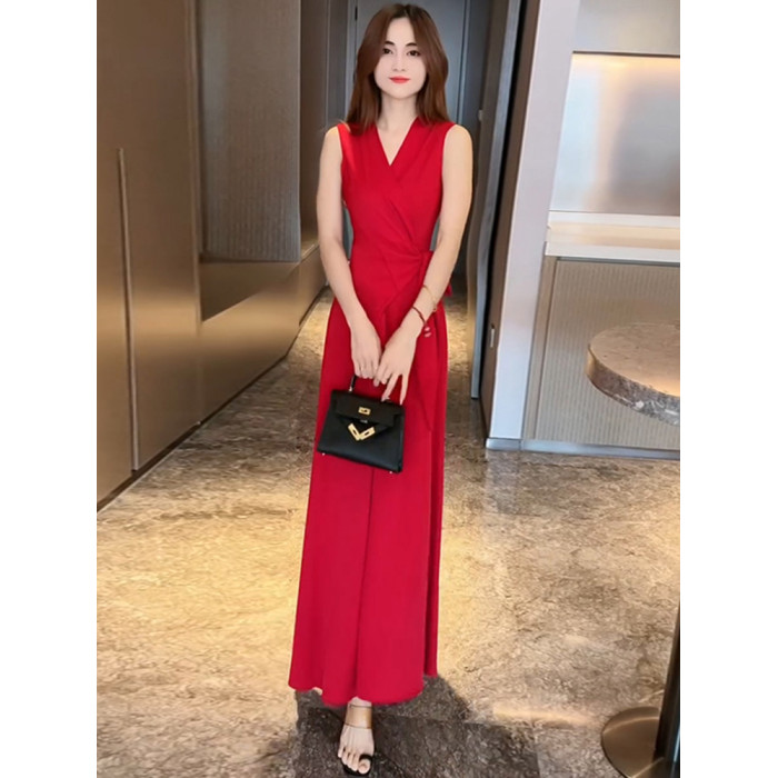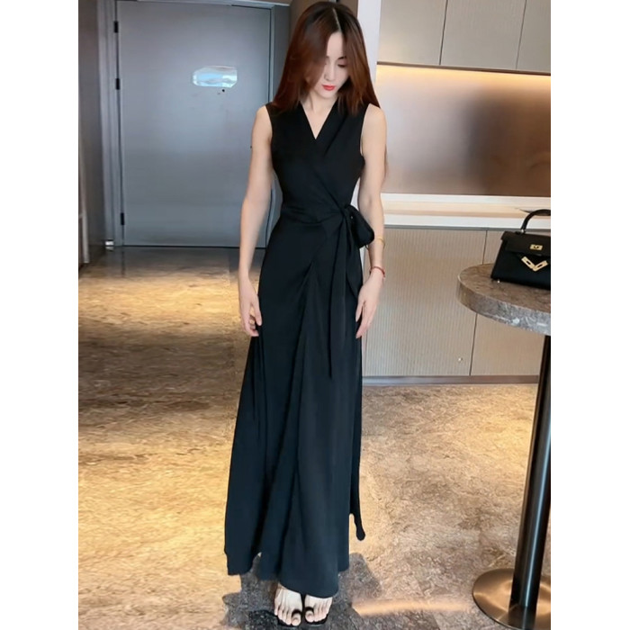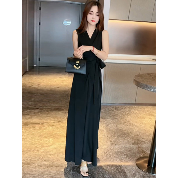 赫本風無袖v領黑色連衣裙女夏季新款高級感法式綁帶收腰絕美長裙
