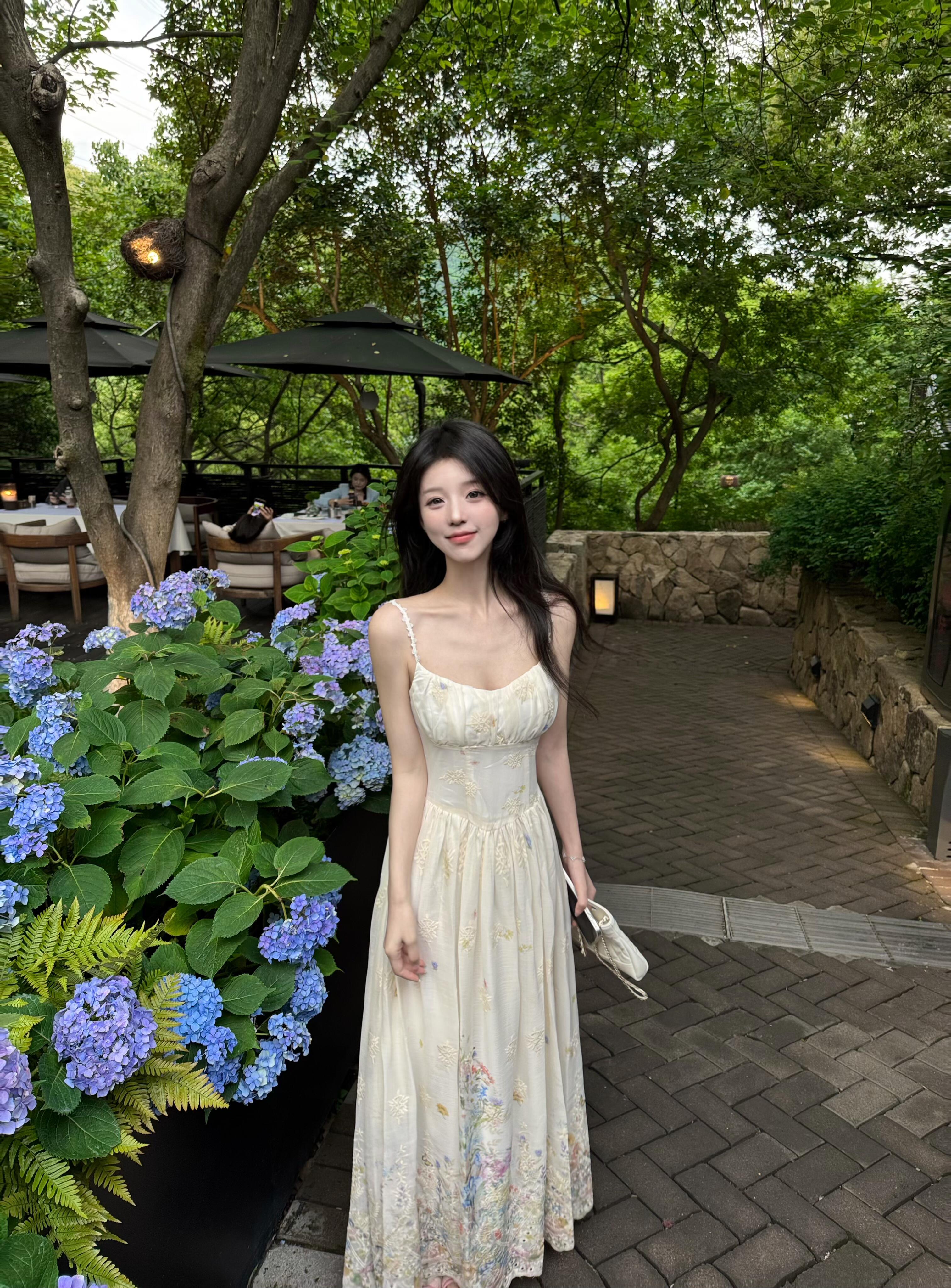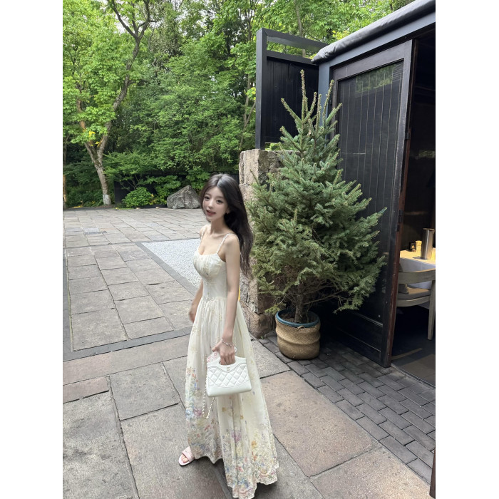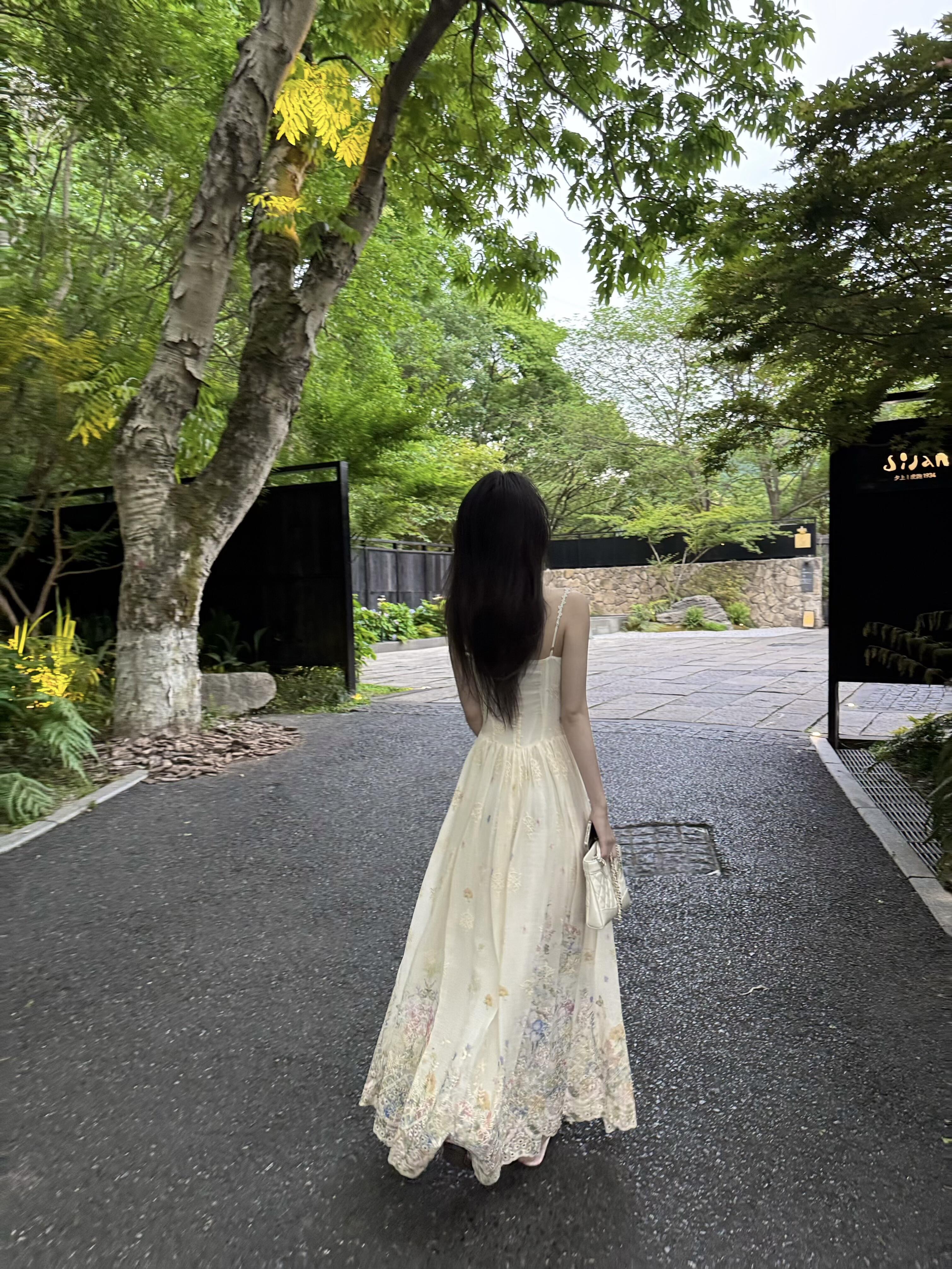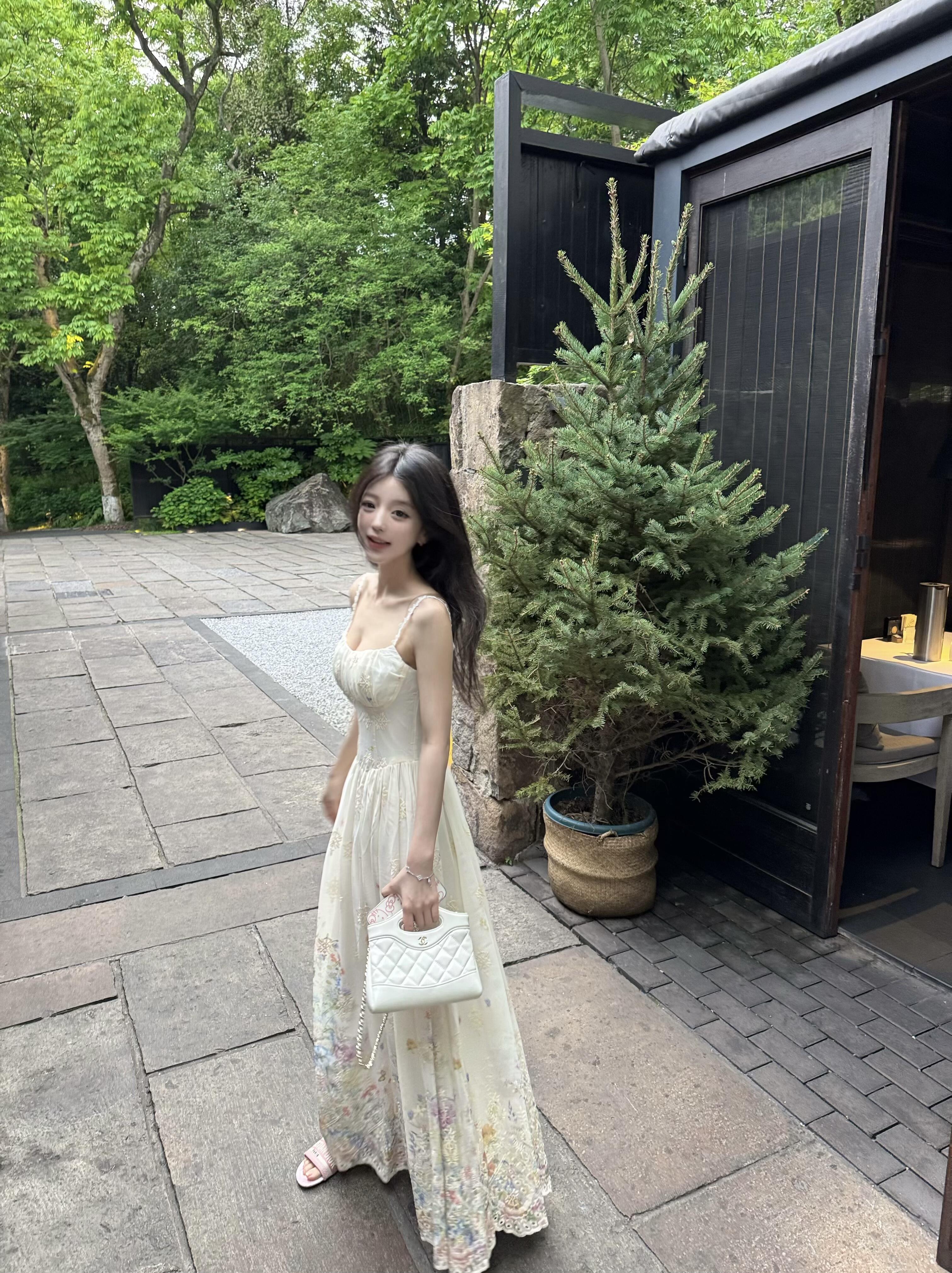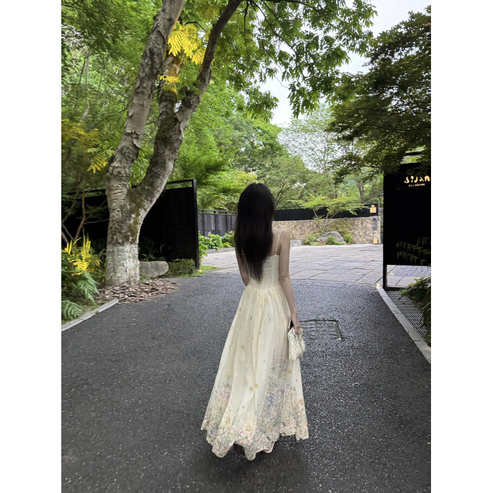 【秘鏡花園】重工刺綉吊帶連衣裙女度假風收腰顯瘦海邊絕美長裙子