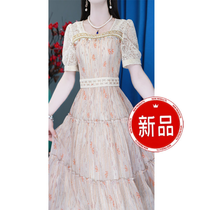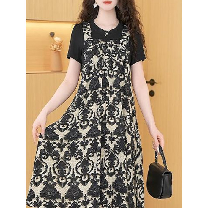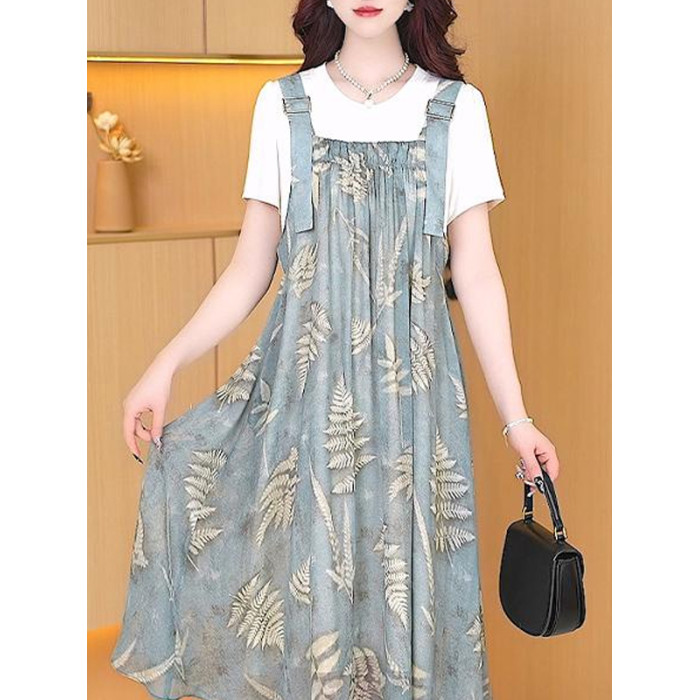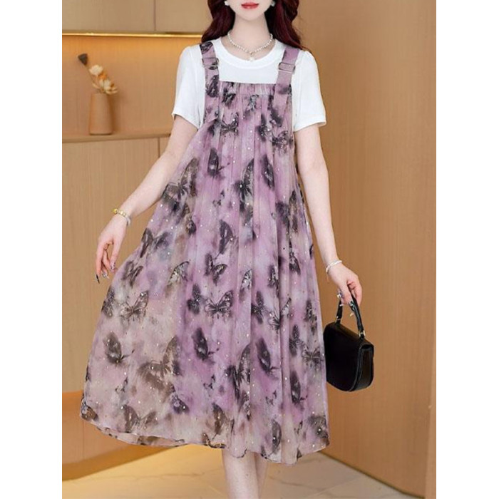 晨芷蝴蝶印花連衣裙女夏季2025新款寬松遮肚假兩件通勤中長a字裙