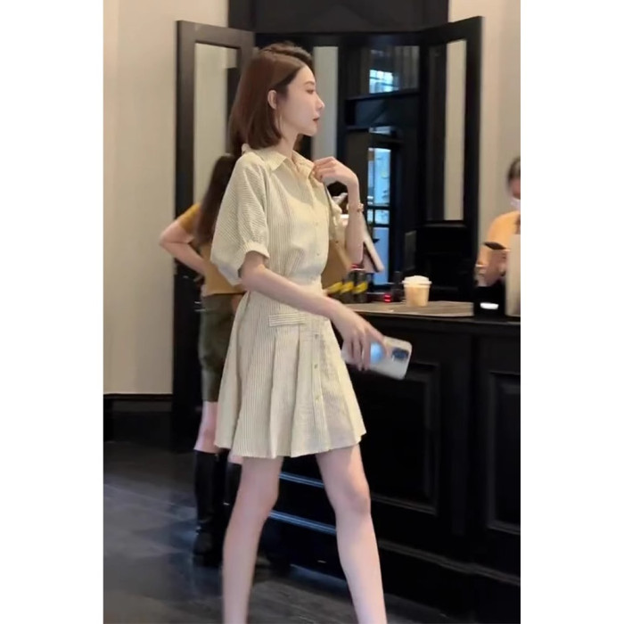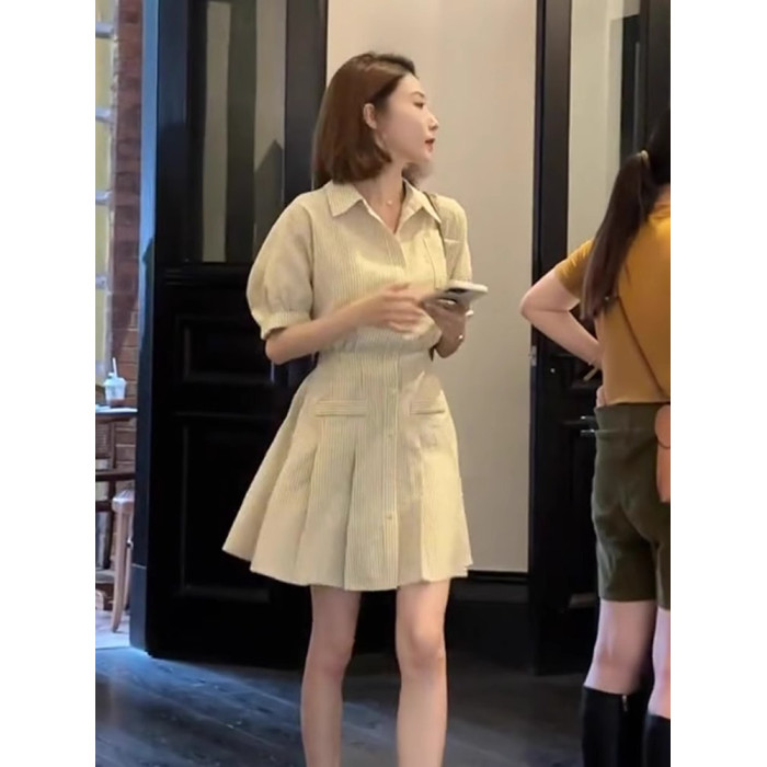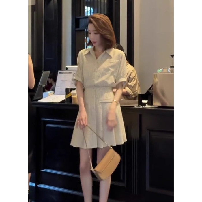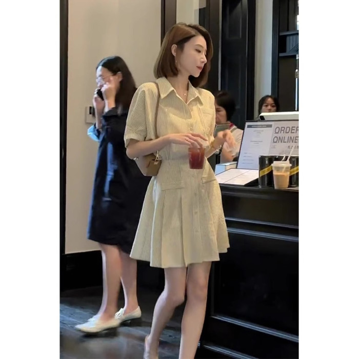歐洲站法式短裙女夏季款精緻氣質淑女小香風條紋Polo襯衫連衣裙子