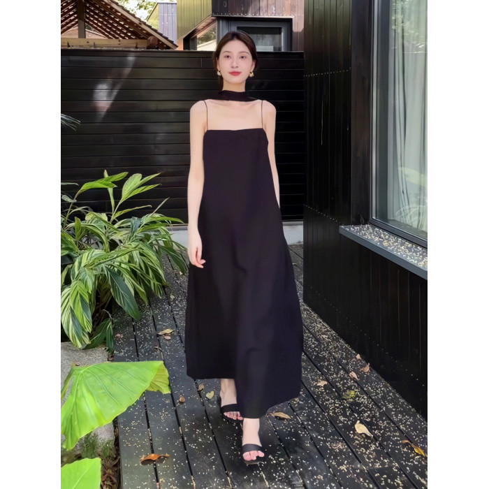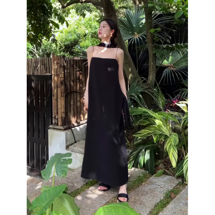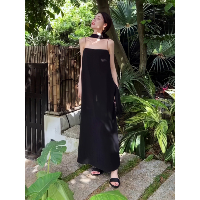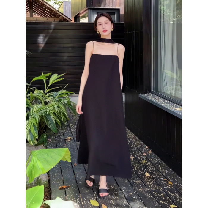 赫本風小黑裙2025夏季配飄帶法式氣質度假風a字黑色吊帶連衣裙女