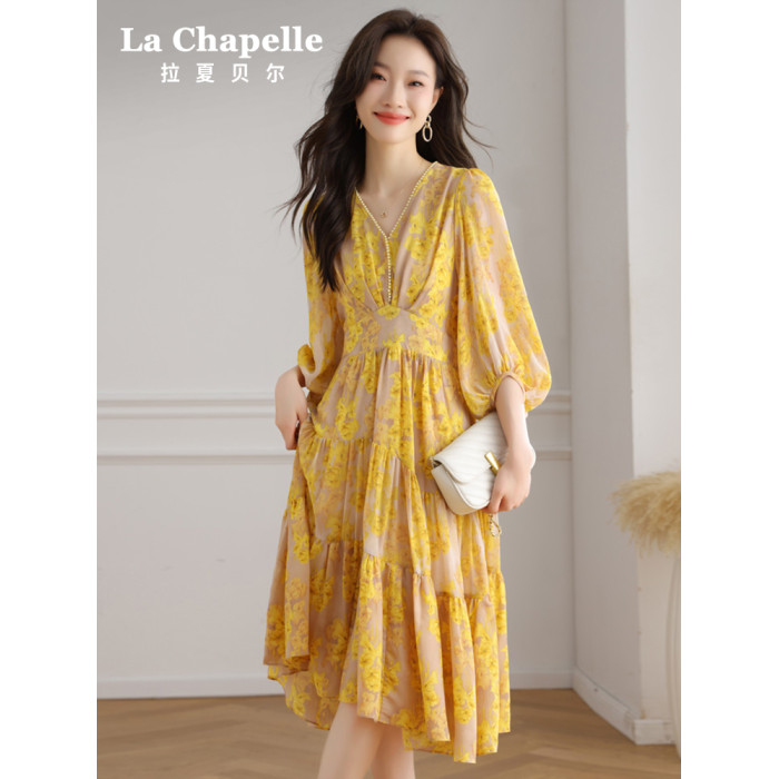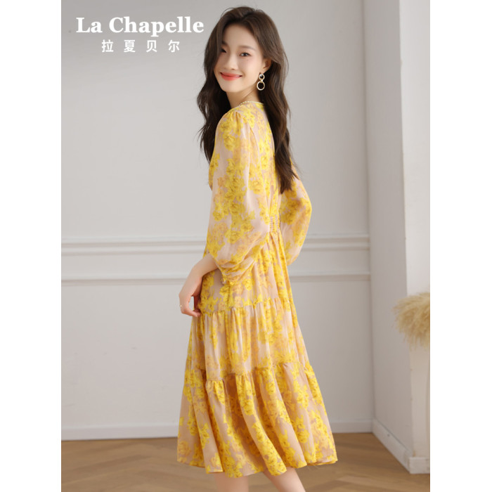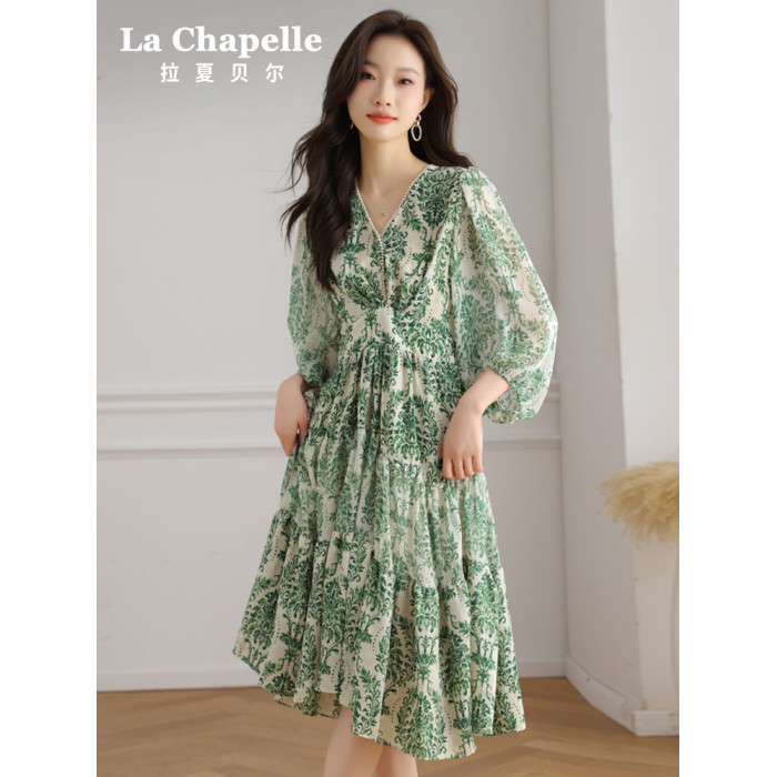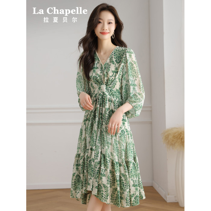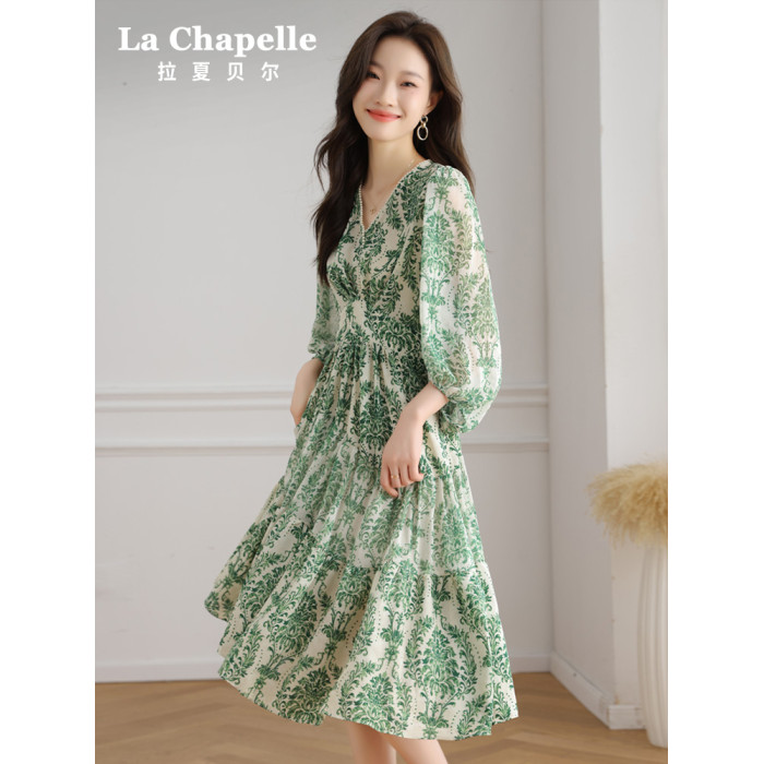 拉夏貝爾官方碎花雪紡連衣裙女2025年春季新款高腰顯瘦V領中長裙