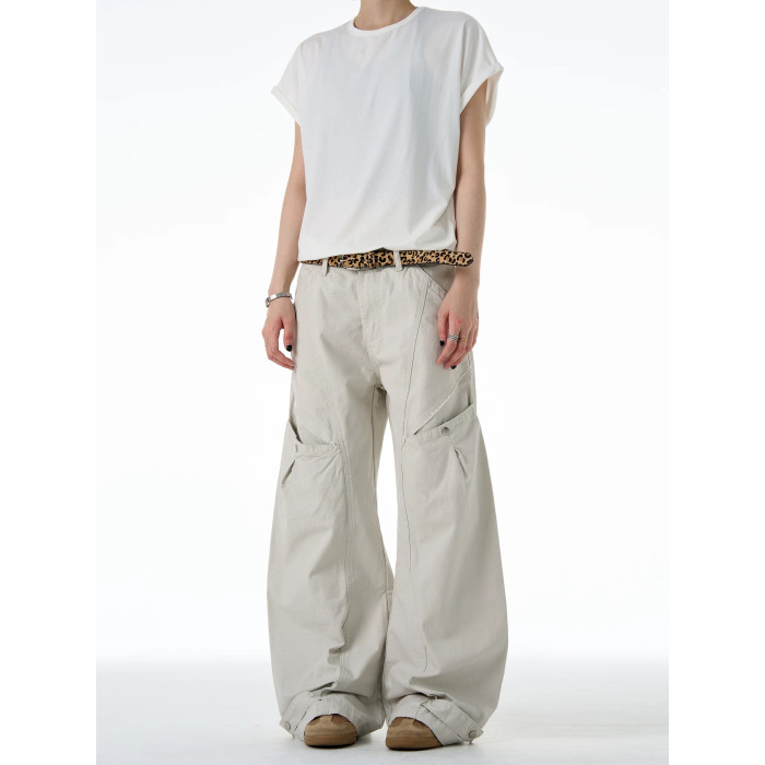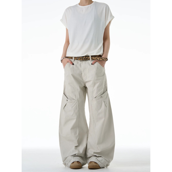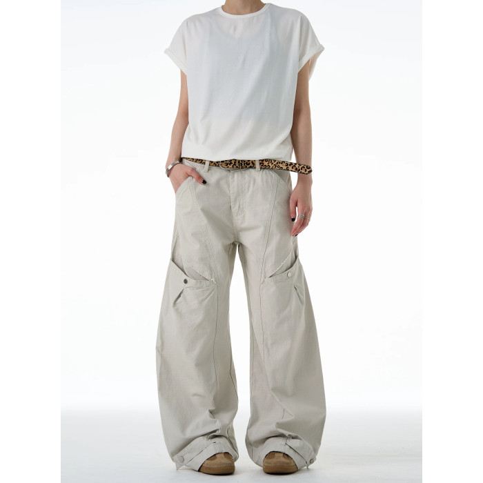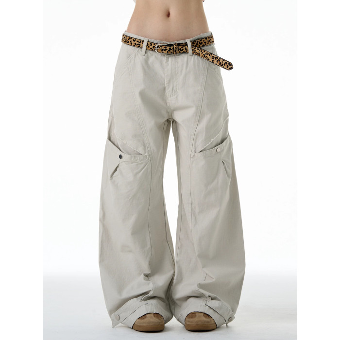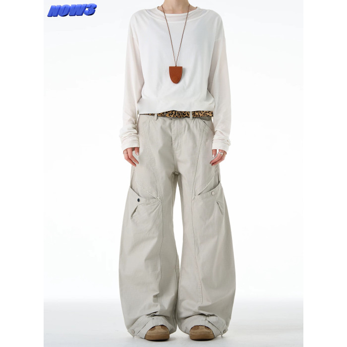 NOW3美式復古直筒彎刀工裝褲女潮牌褶皺寬松休閒褲水洗廓形濶腿褲