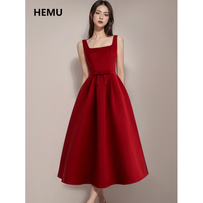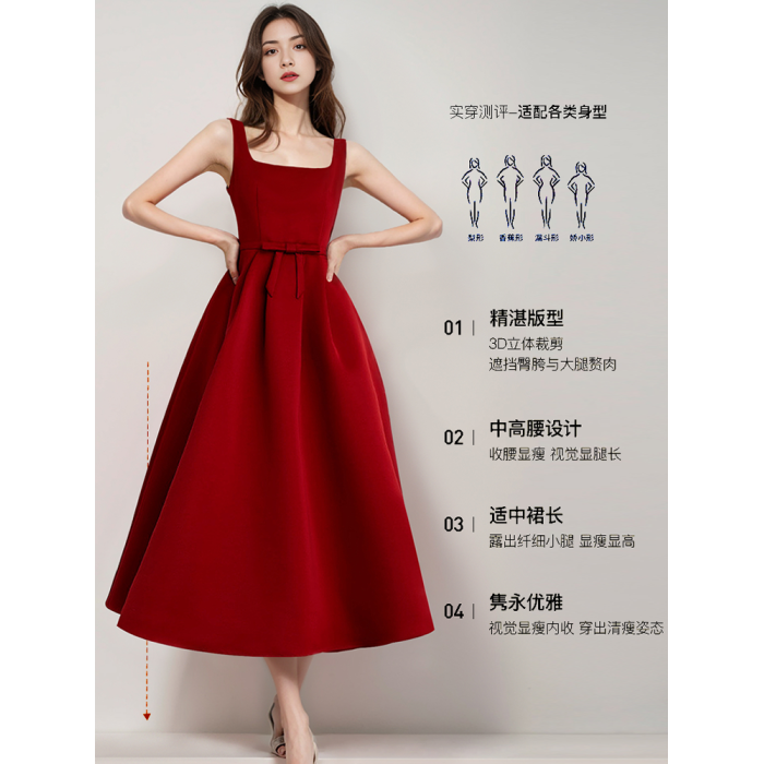 紅色吊帶連衣裙女法式訂婚宴會禮服高級感大方得體穿搭蓬蓬公主裙