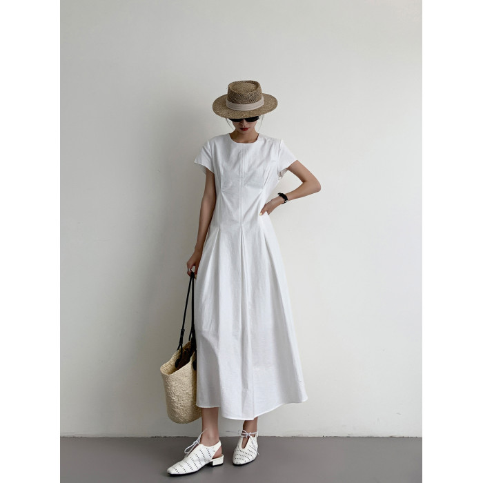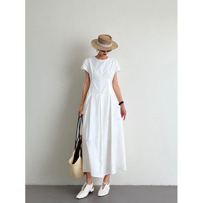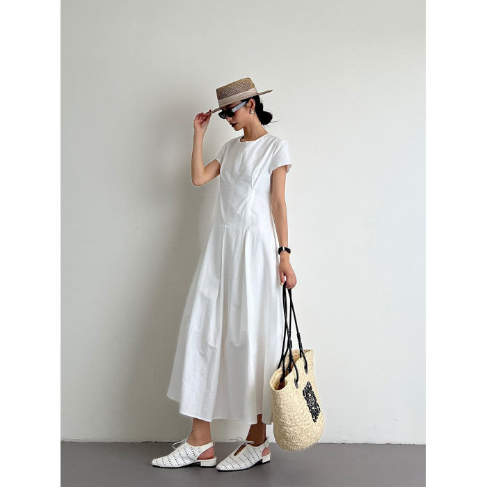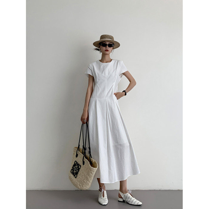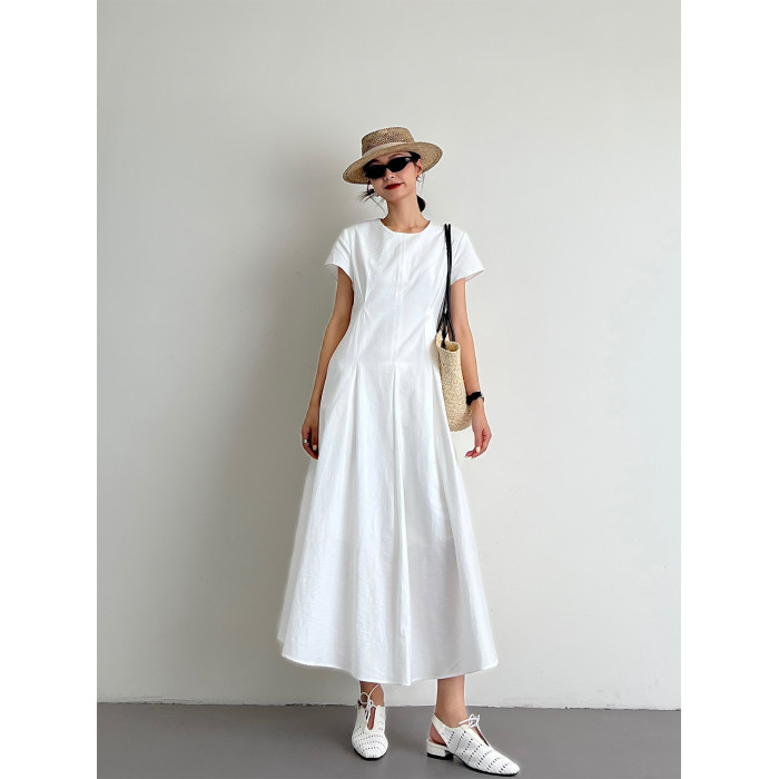 夏季新款法式氣質圓領白色短袖a字收腰高腰大擺裙長裙子連衣裙女
