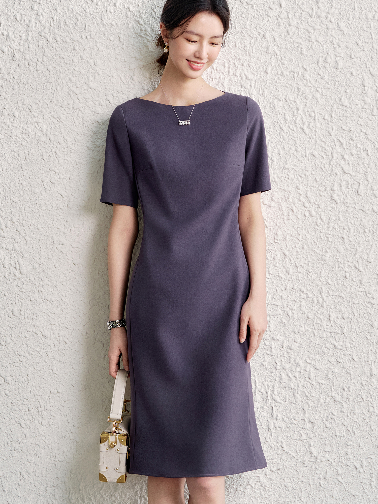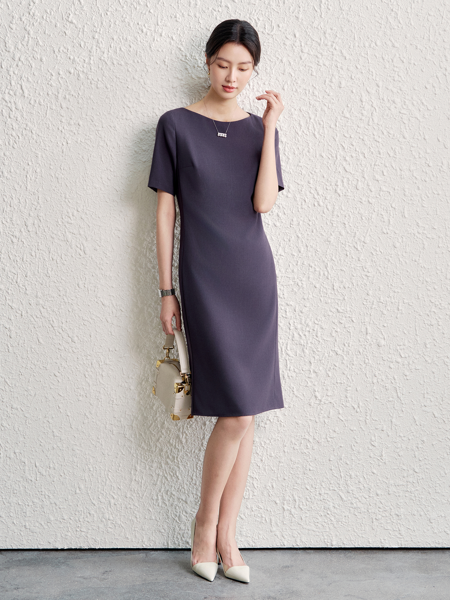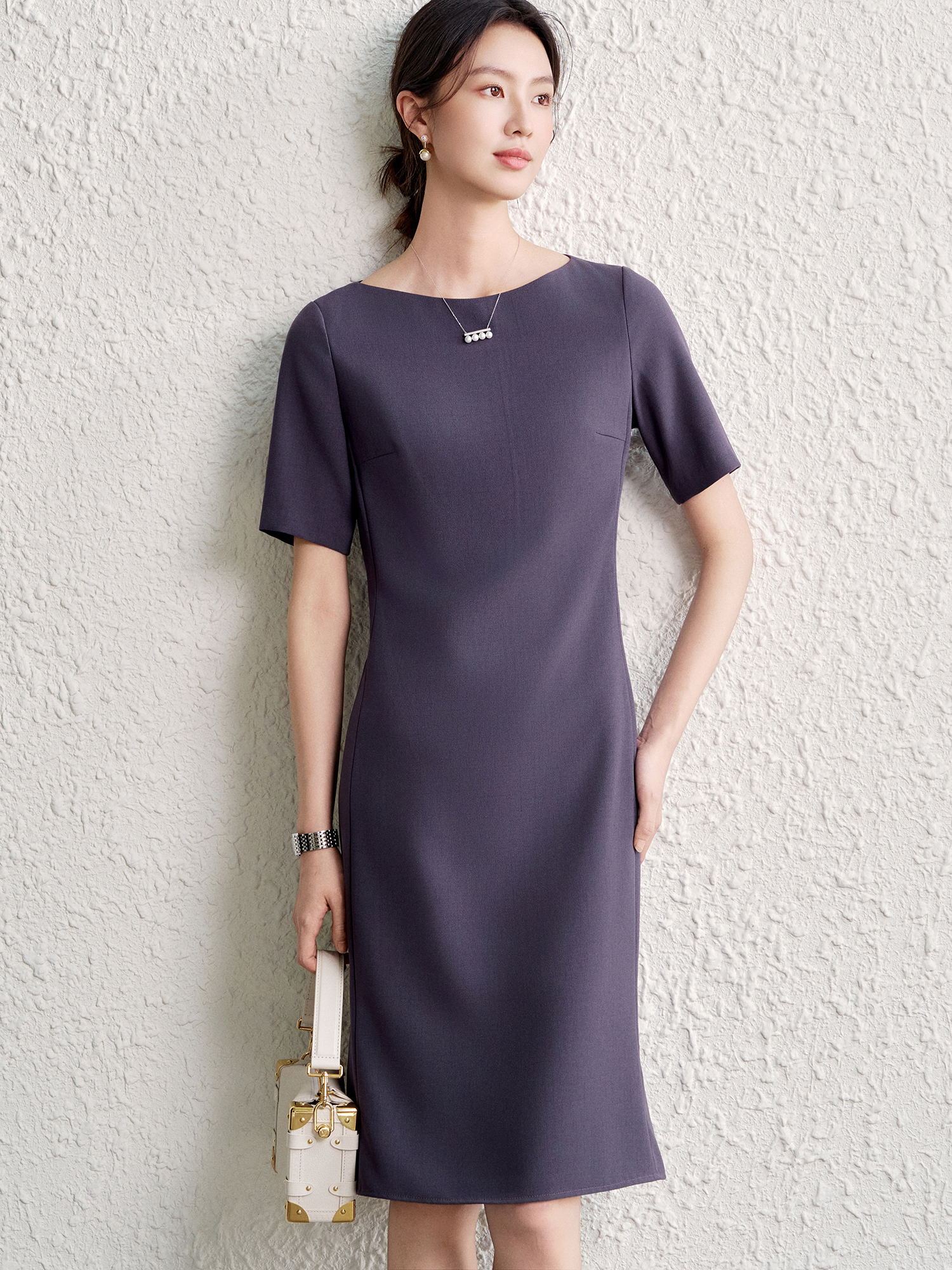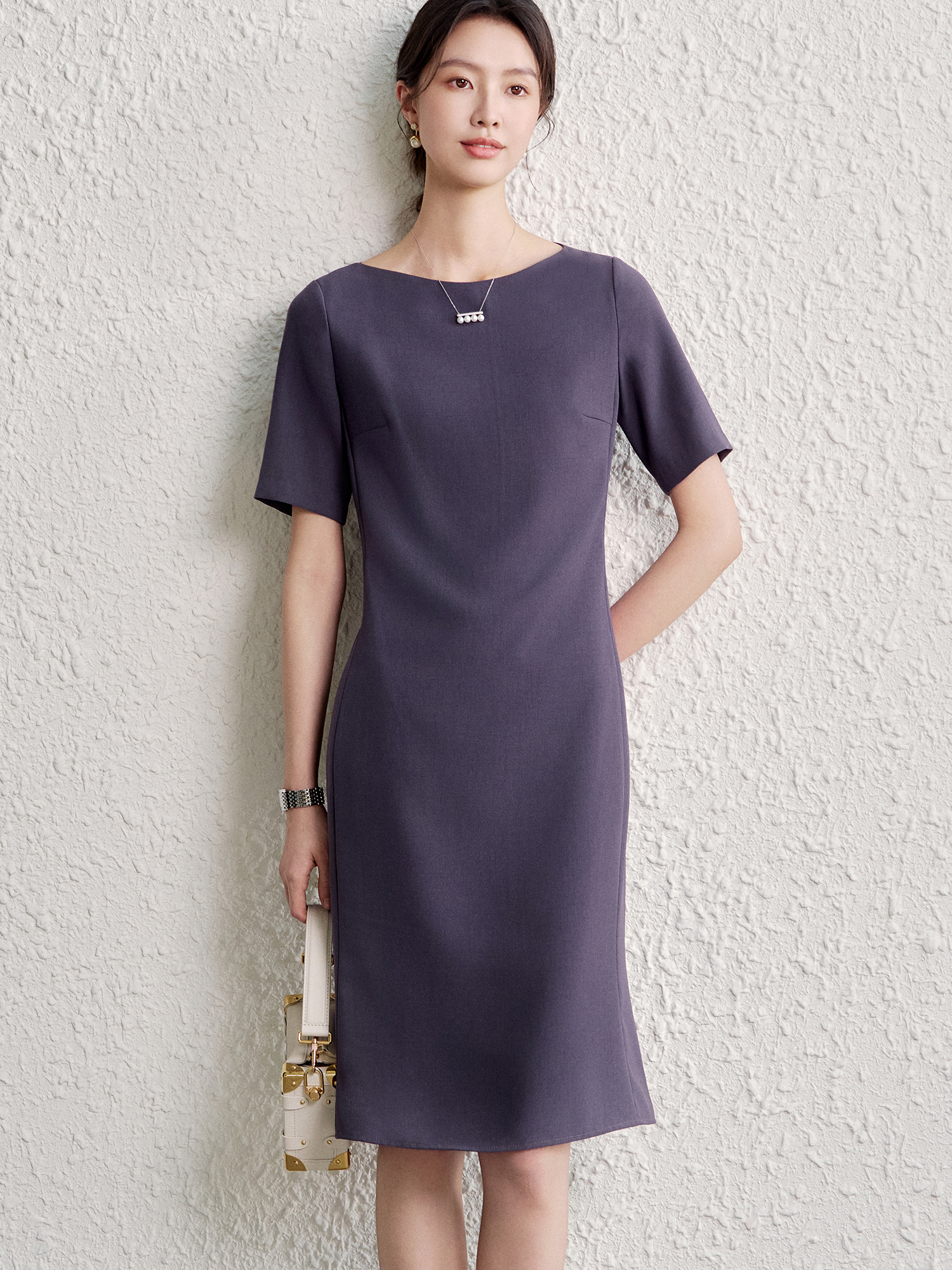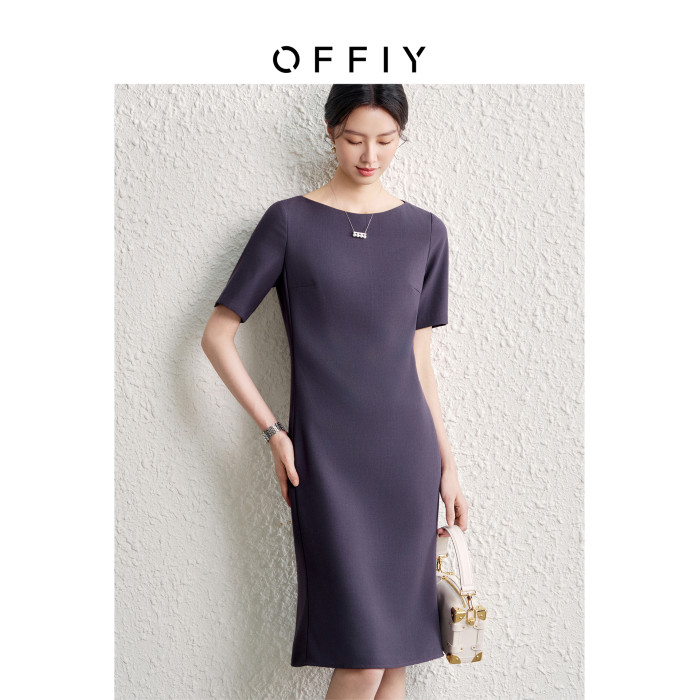 OFFIY-暗紫葡萄 經典TH醋酸短袖修身商務職業通勤氣質連衣裙春夏