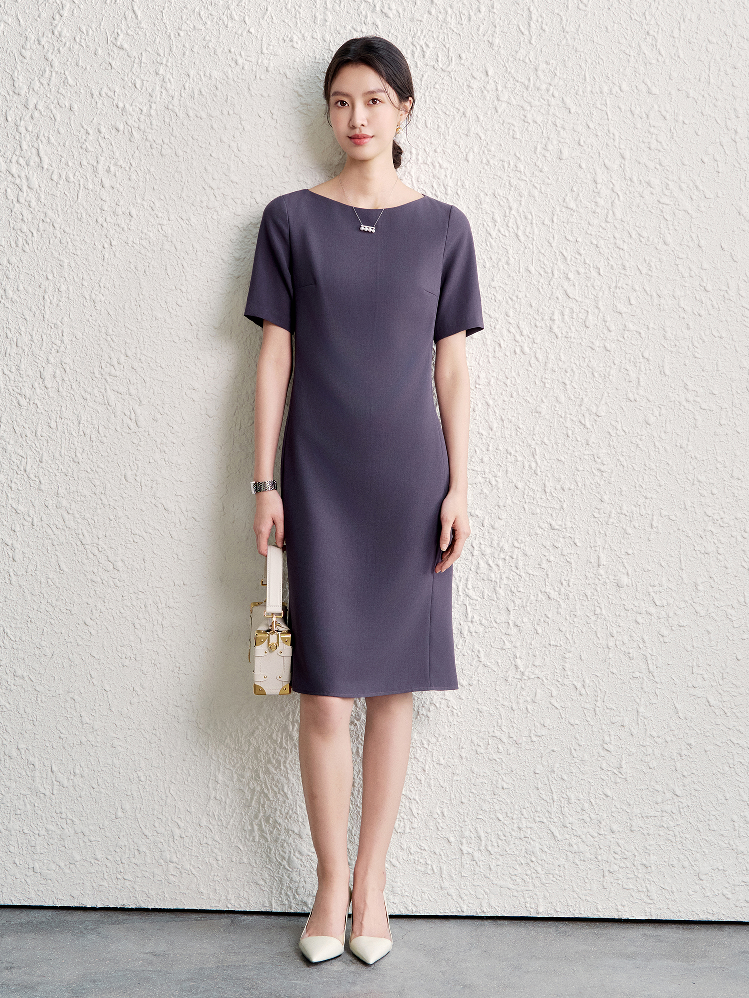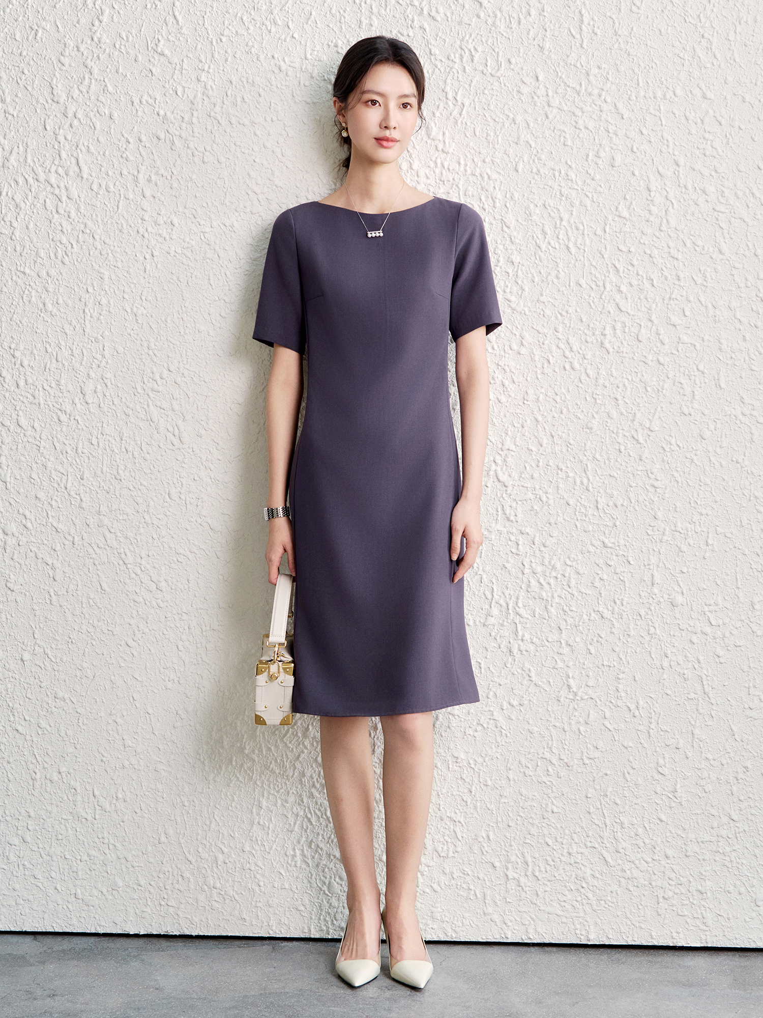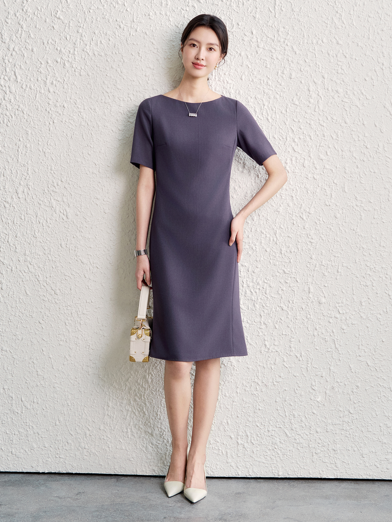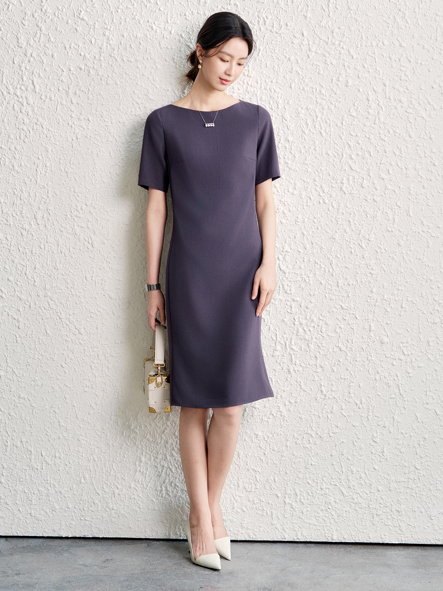OFFIY-暗紫葡萄 經典TH醋酸短袖修身商務職業通勤氣質連衣裙春夏