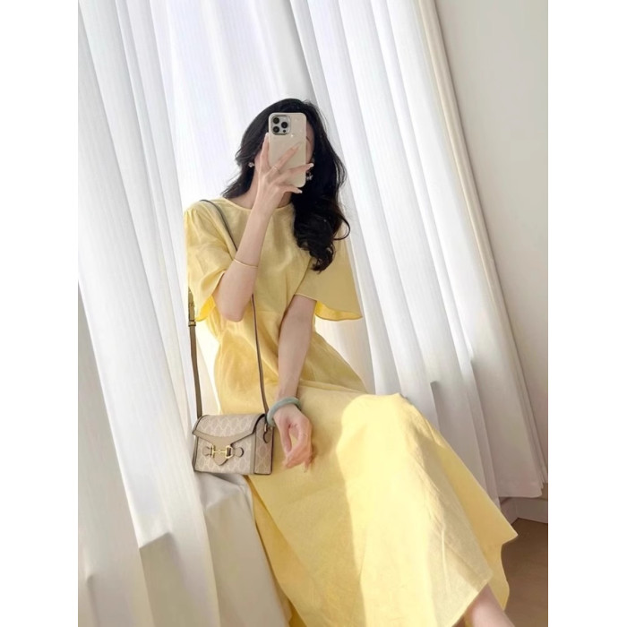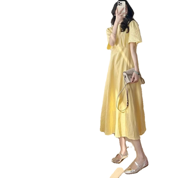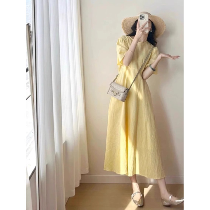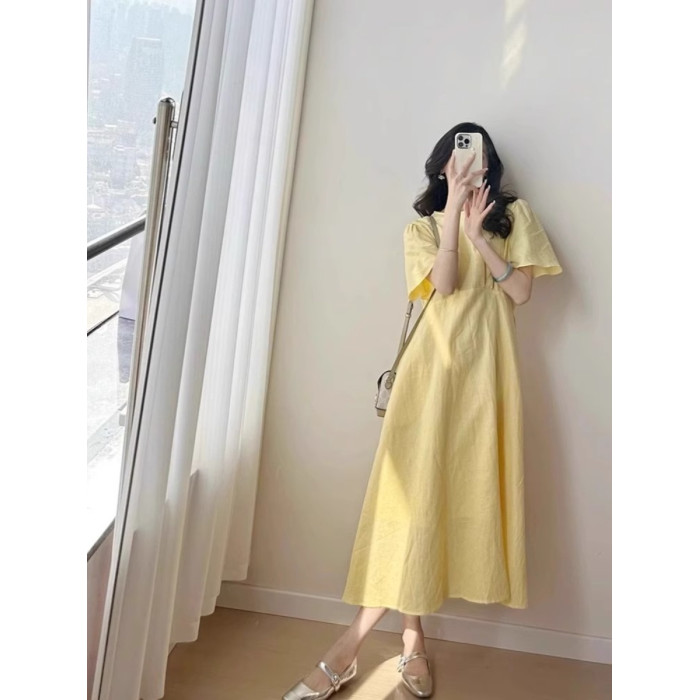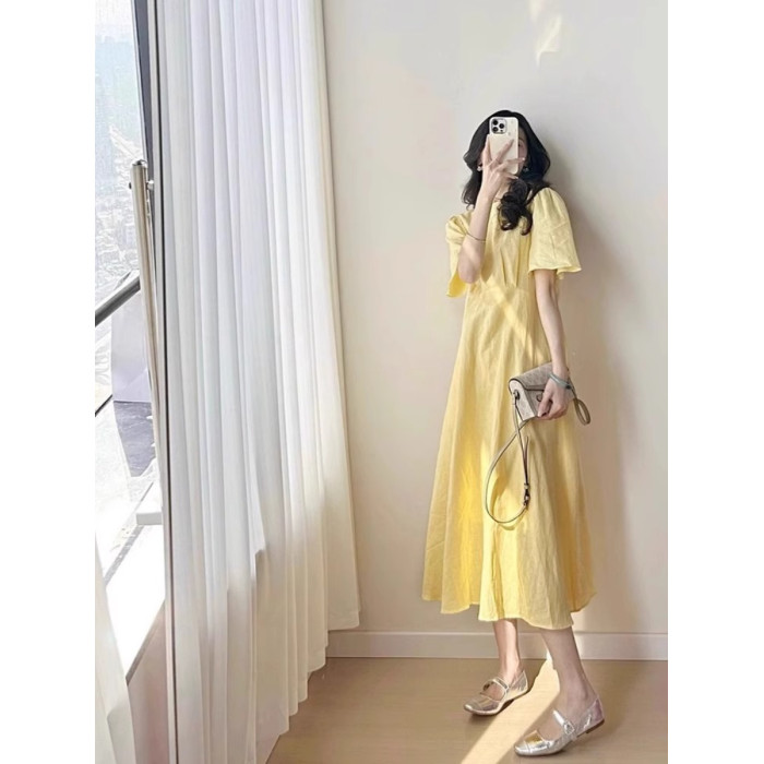 歐洲站夏季女裝2025新款茶歇法式桔梗長裙遮肚子顯瘦黃色連衣裙