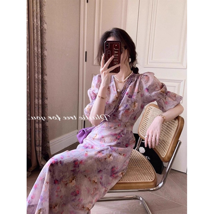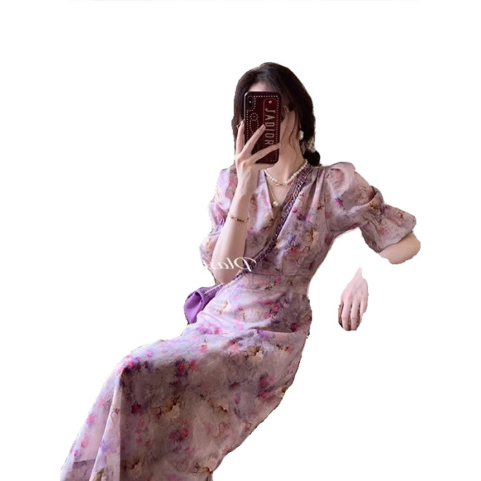 歐洲站夏季女裝2025新款法式高級感氣質v領碎花長裙子紫色連衣裙
