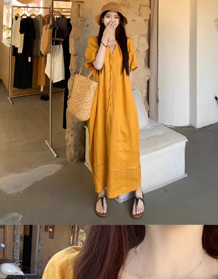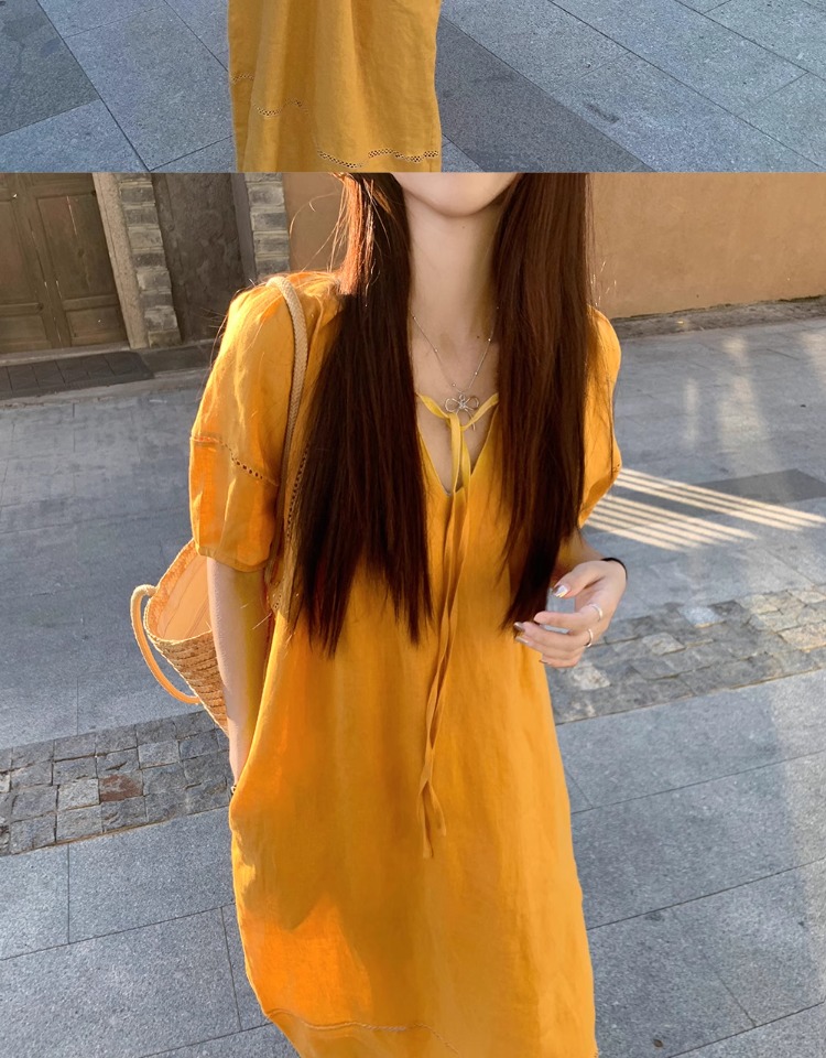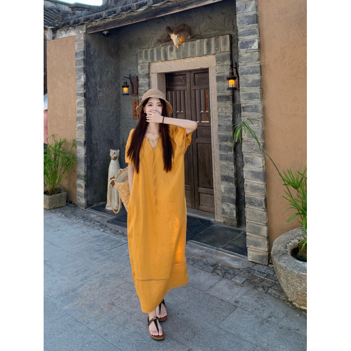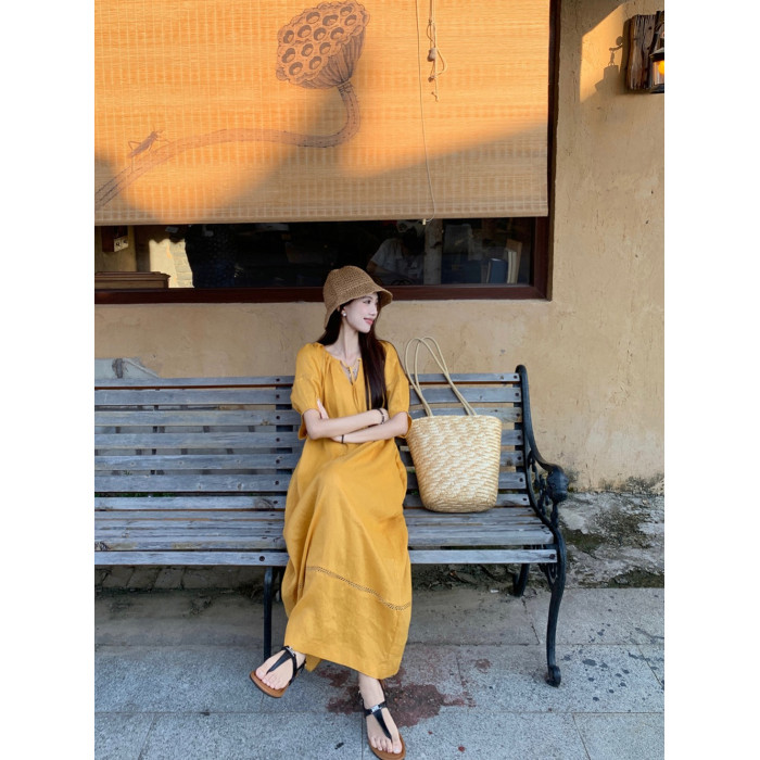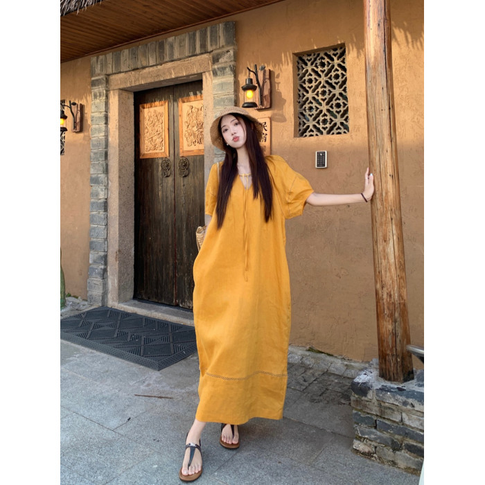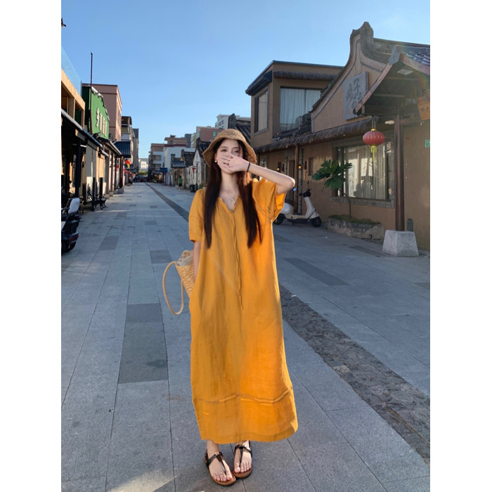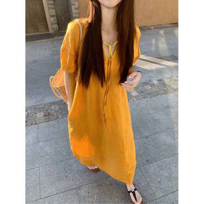 2025夏季新款多巴胺黃色寬松V領燈籠袖亞麻連衣裙女簡約休閒長裙