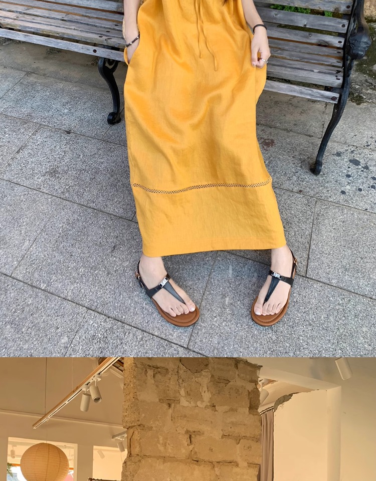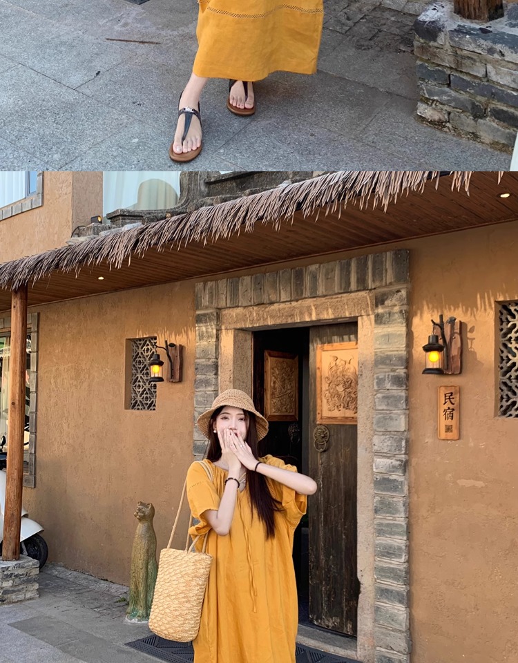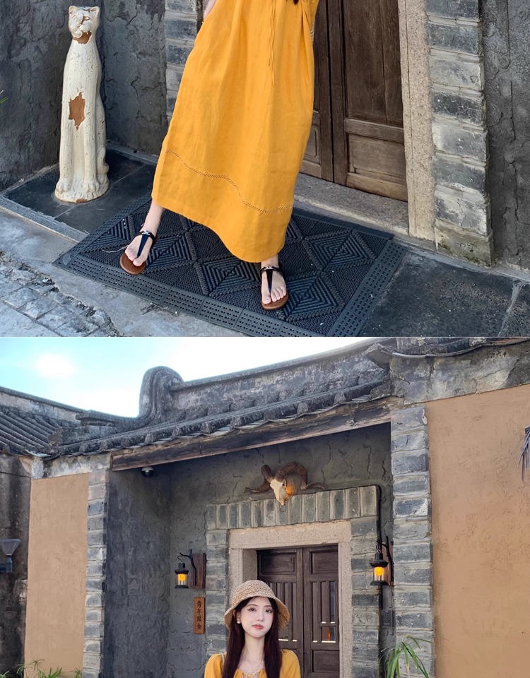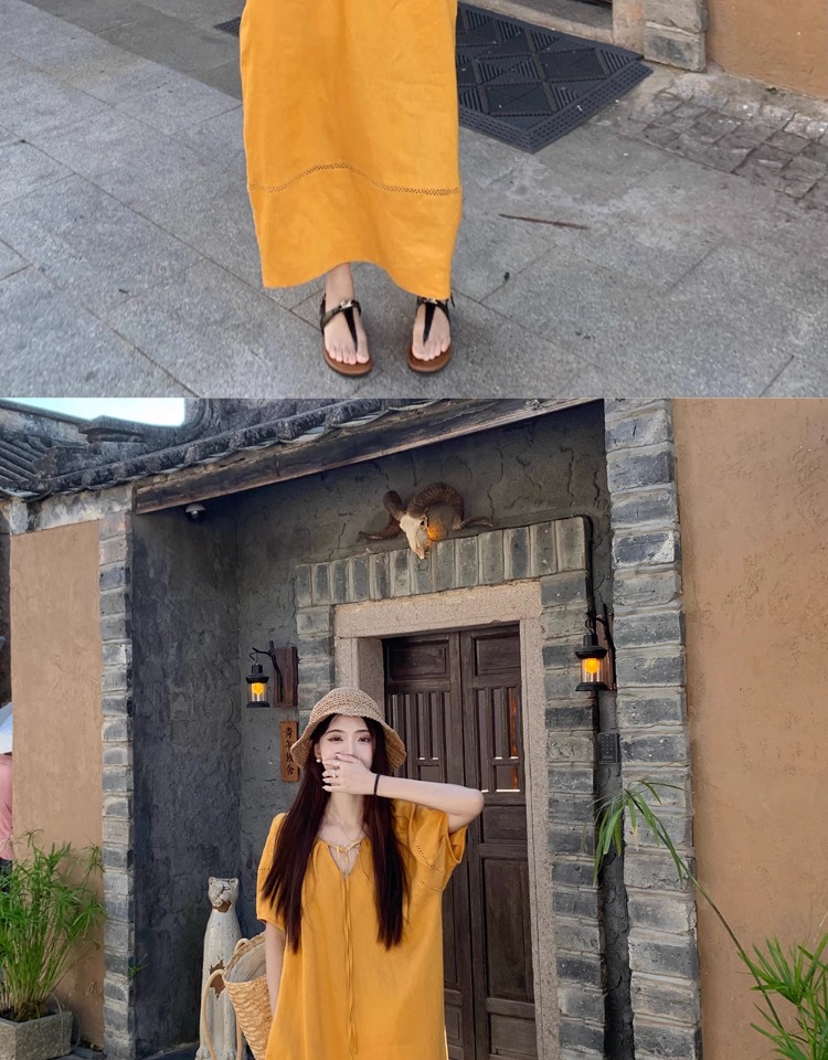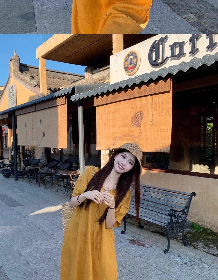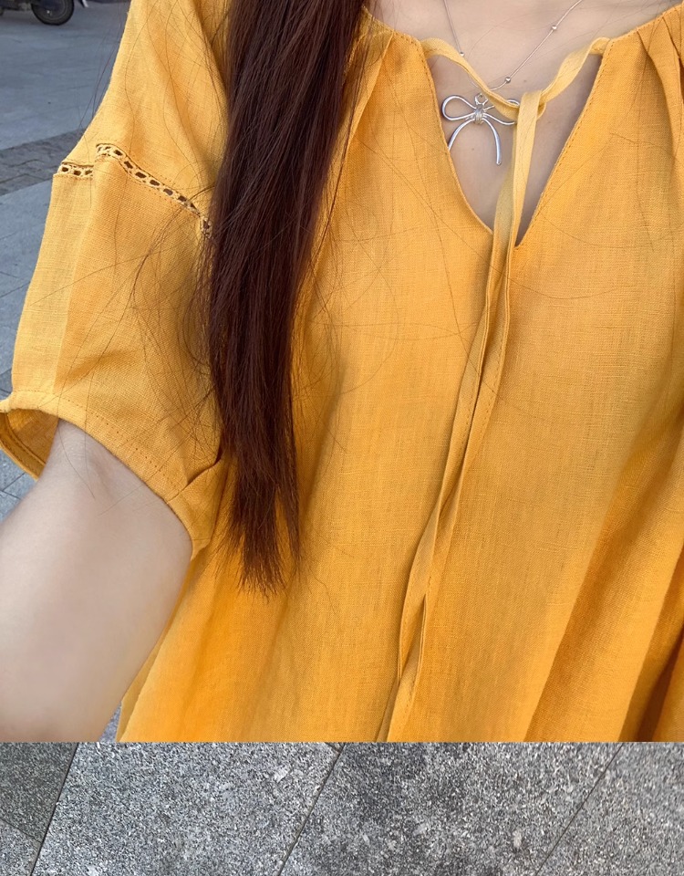 2025夏季新款多巴胺黃色寬松V領燈籠袖亞麻連衣裙女簡約休閒長裙