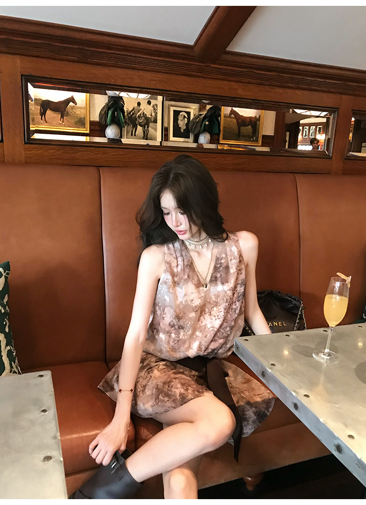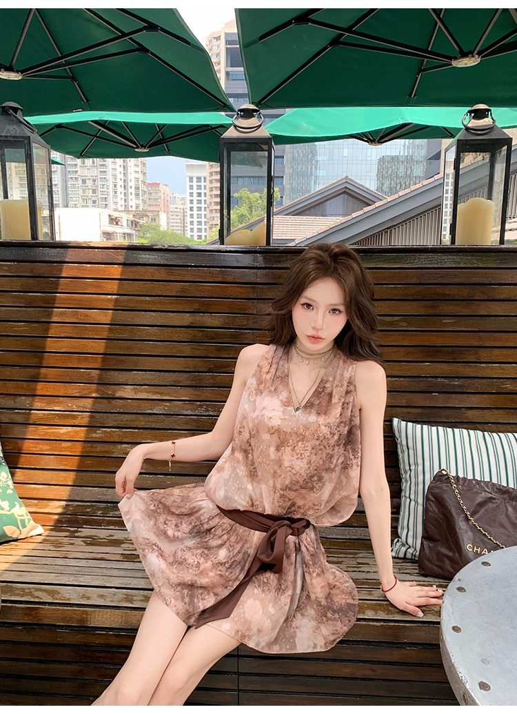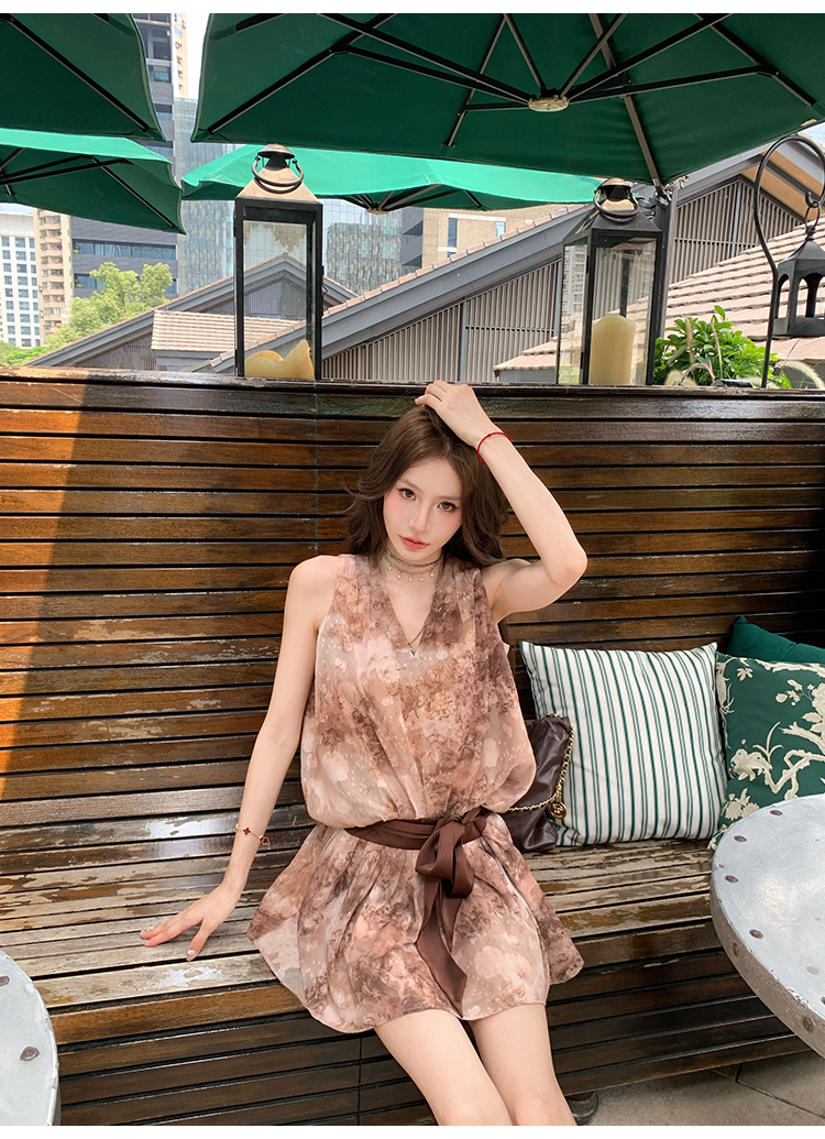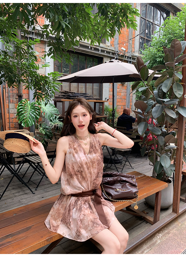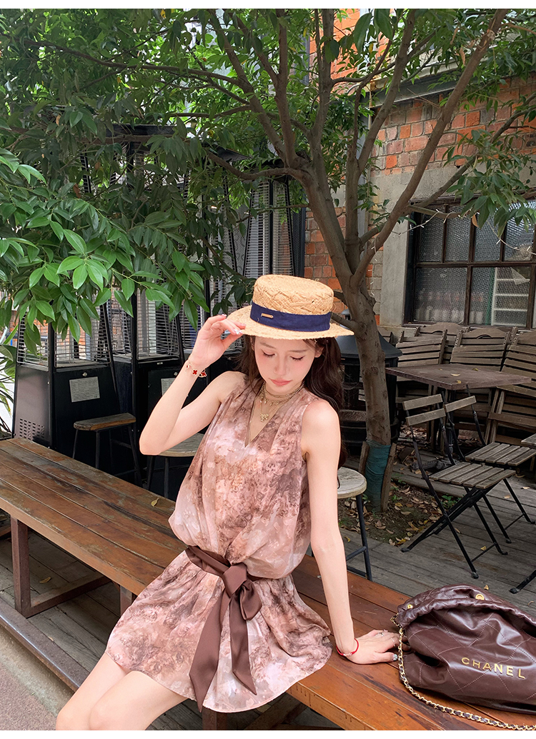 八蓋pinky piggy 盛夏日暮 復古v領收腰系帶連衣裙女無袖顯瘦短裙