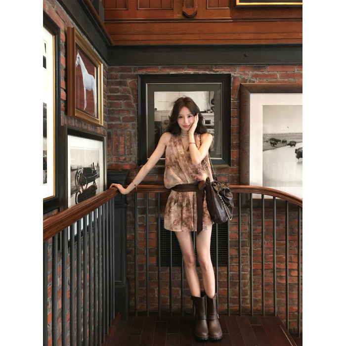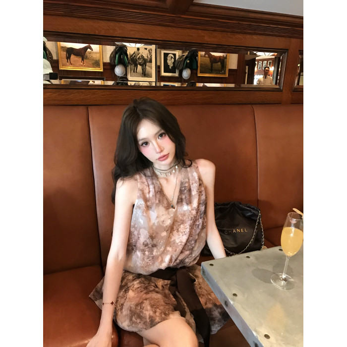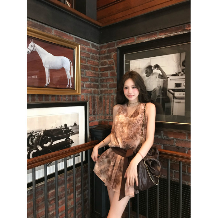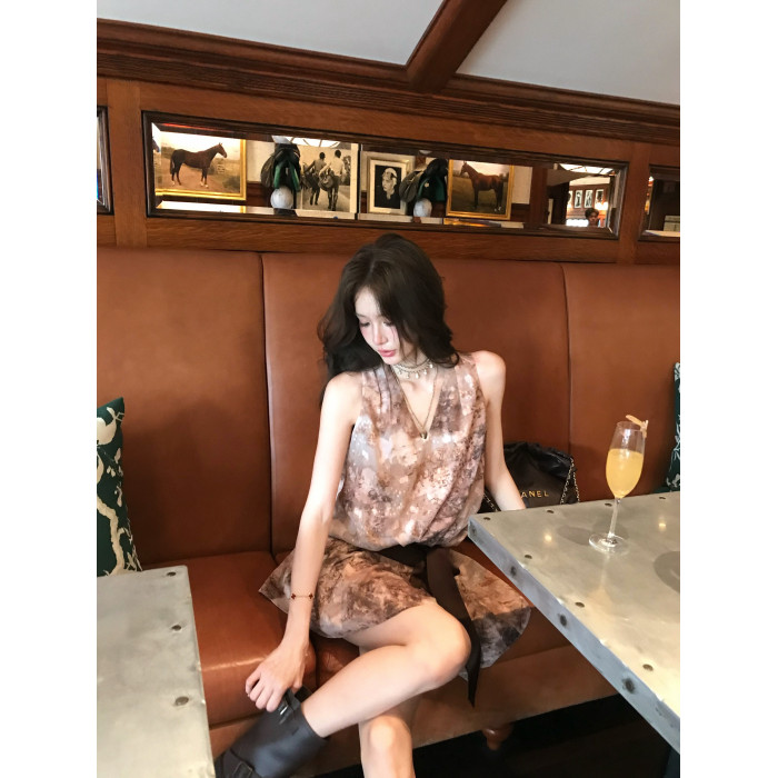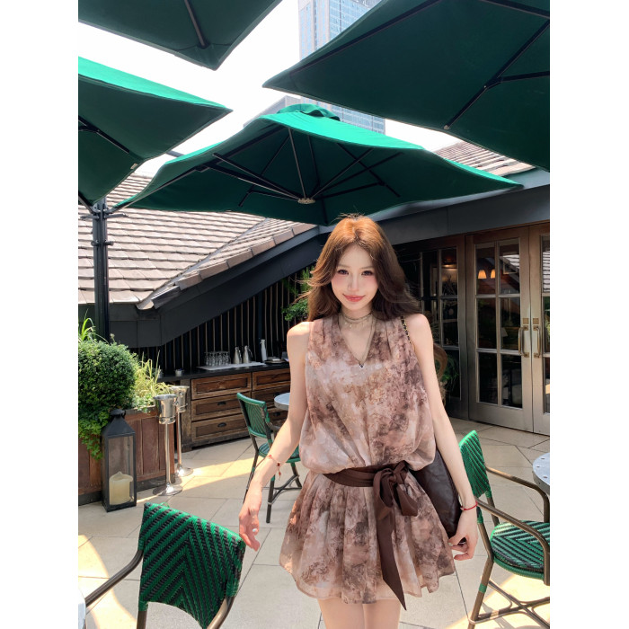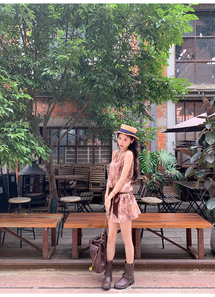 八蓋pinky piggy 盛夏日暮 復古v領收腰系帶連衣裙女無袖顯瘦短裙