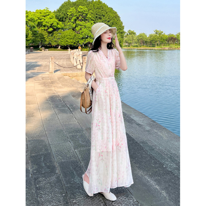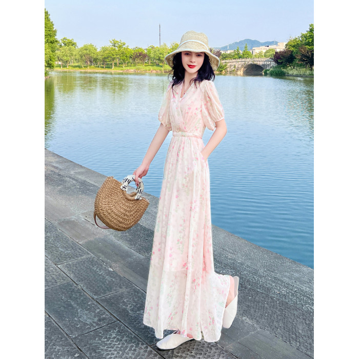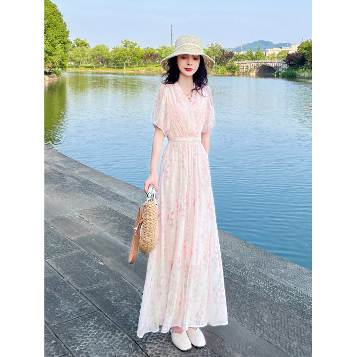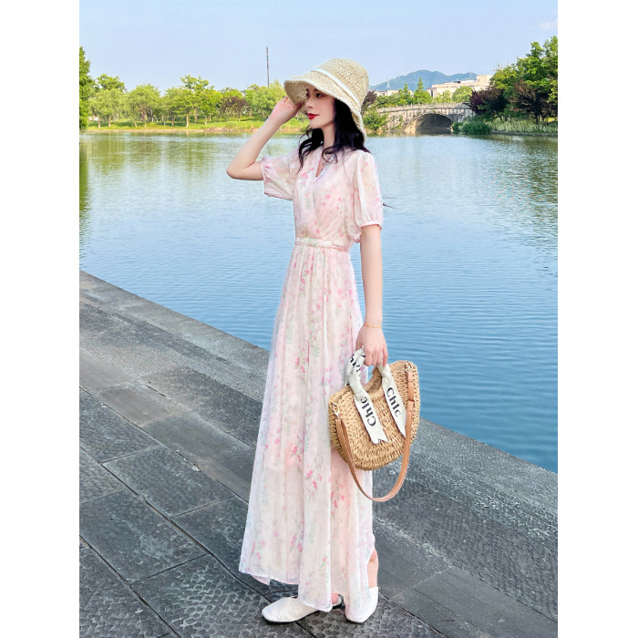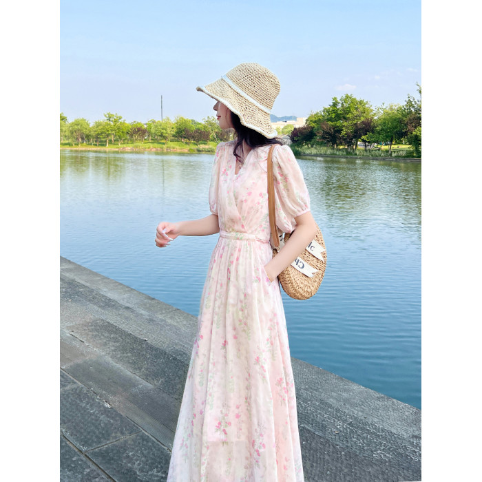 夏季小衆設計氣質碎花連衣裙女新款收腰顯瘦法式小個子長款裙子女