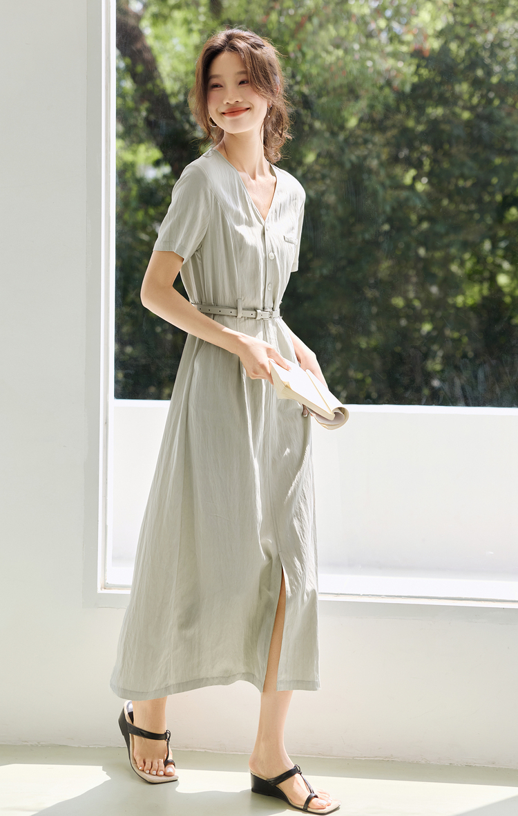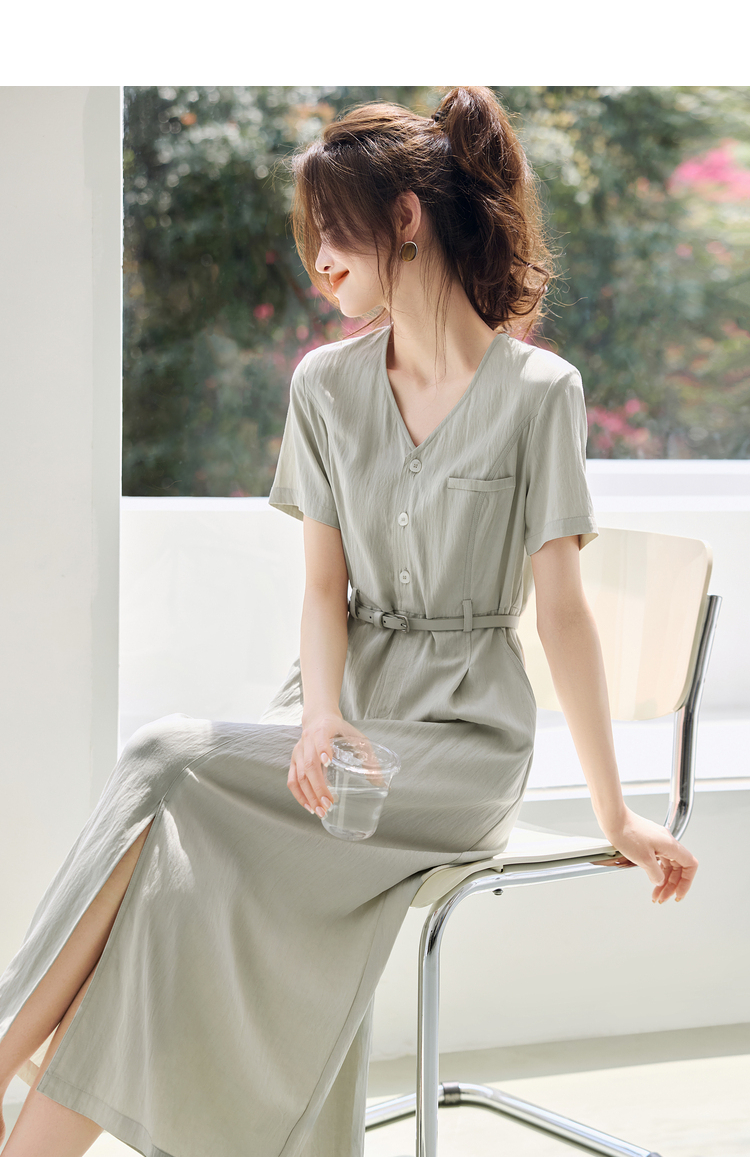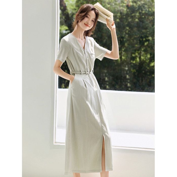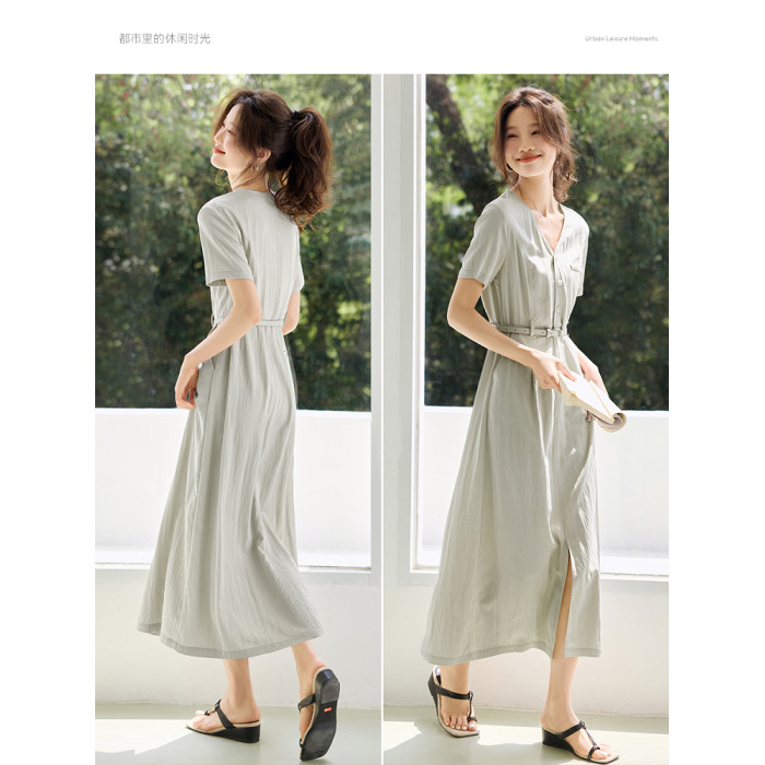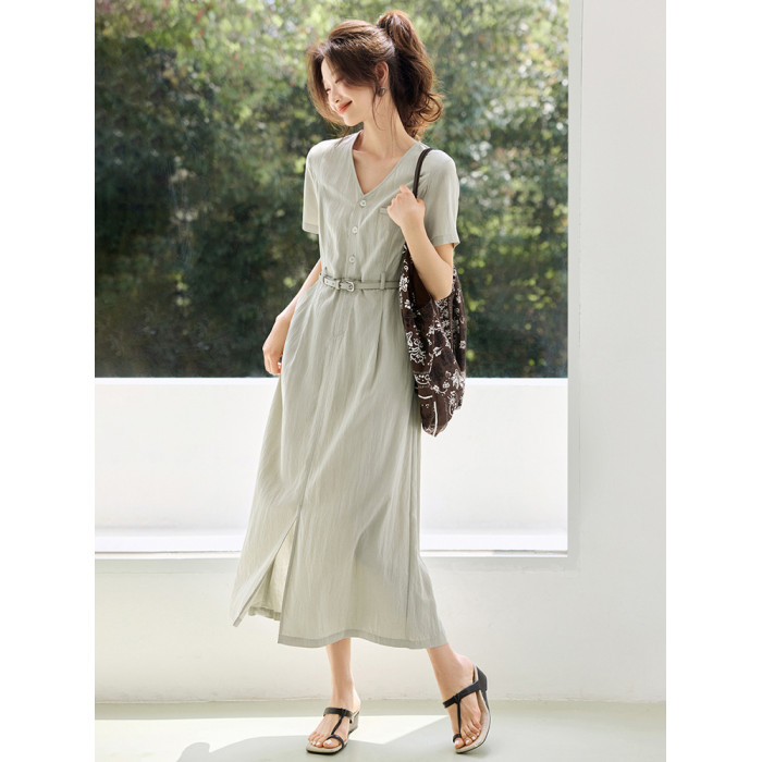 沫晗依美隨性高級感氣質連衣裙2025春季新款V領顯瘦短袖連衣裙女