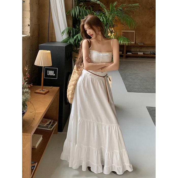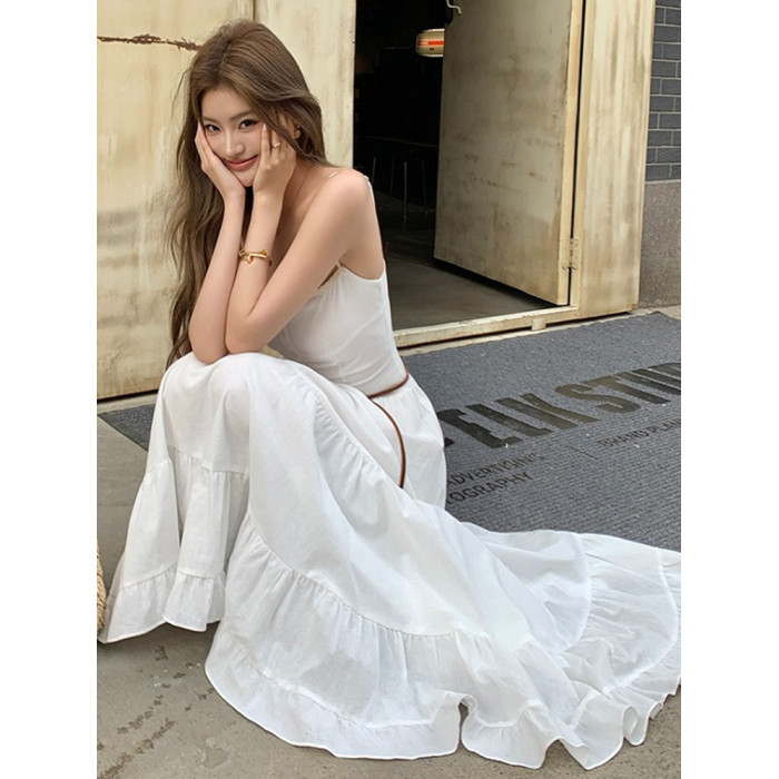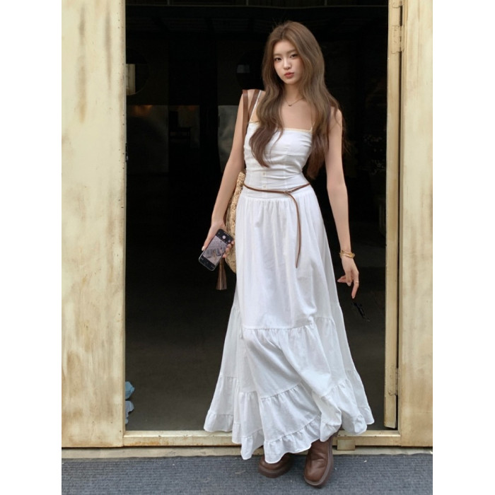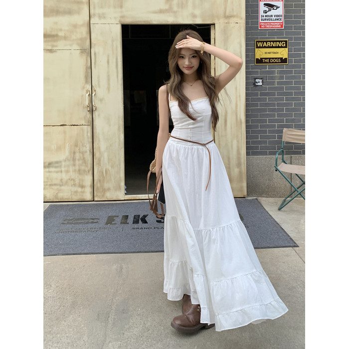 2025夏季新款純棉小白裙修身大擺長裙寬松顯瘦吊帶連衣裙蛋糕裙女