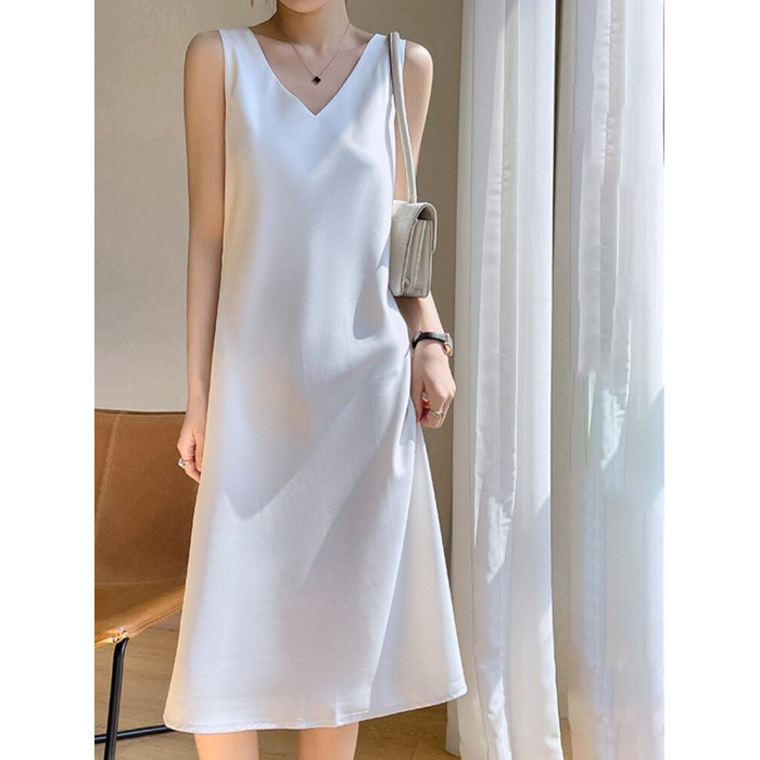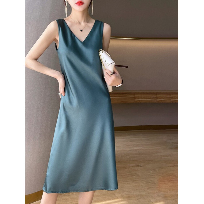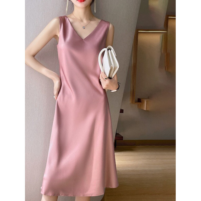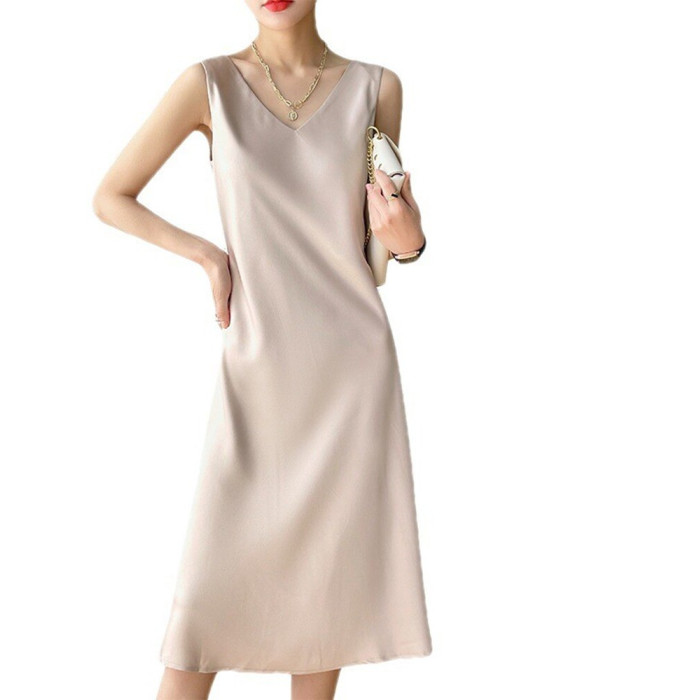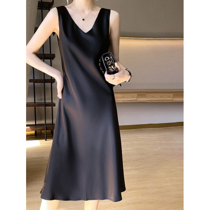 醋酸緞面吊帶裙女夏季外穿無袖內搭顯瘦a字裙黑色長款過膝連衣裙