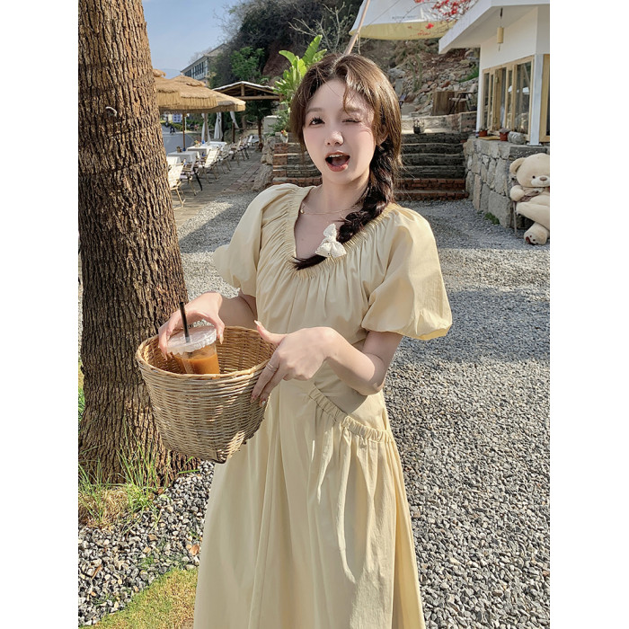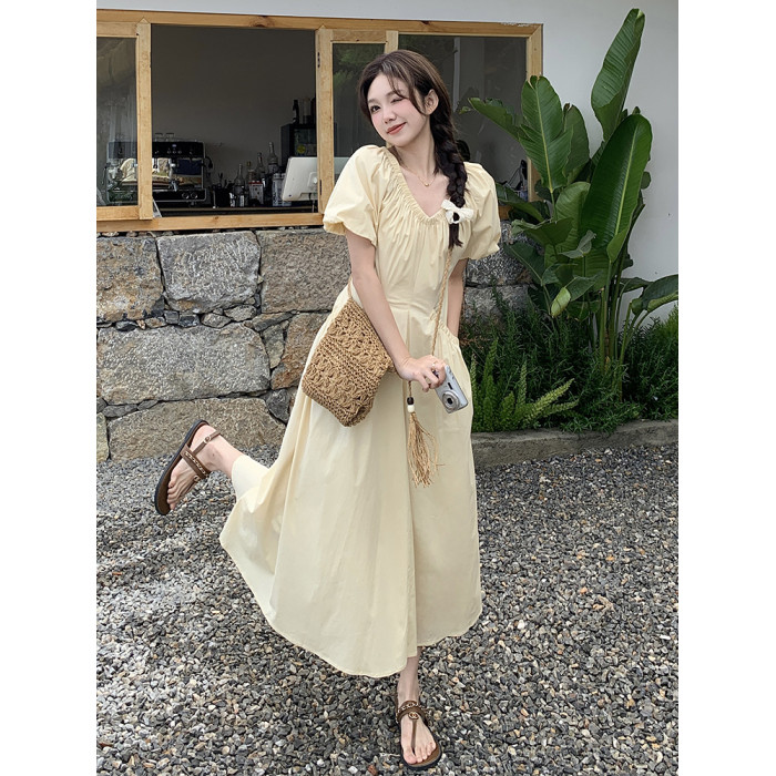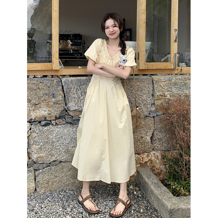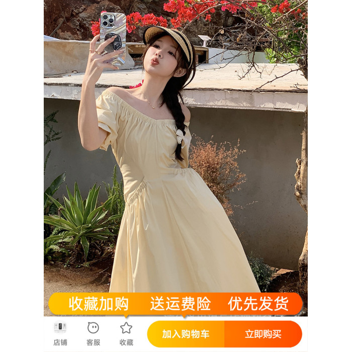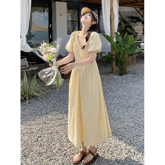 黃色絕美連衣裙夏2025新款氣質溫柔風泡泡袖V領別致收腰顯瘦裙子