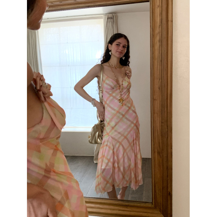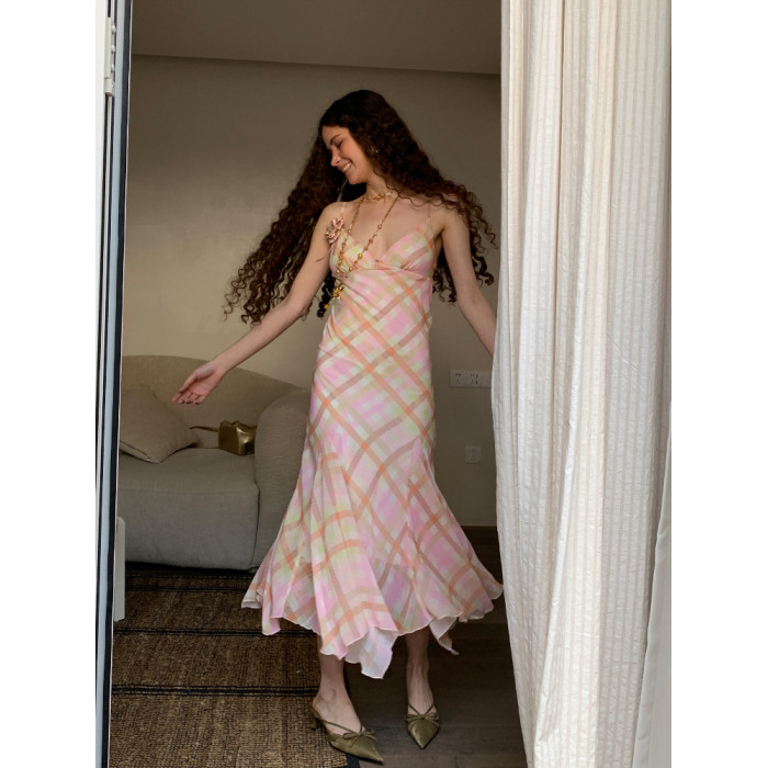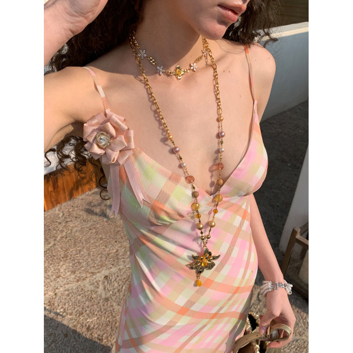花筏NOTJUSTHIM《甜芒冰茶》夏日度假感v領收腰格子吊帶連衣裙