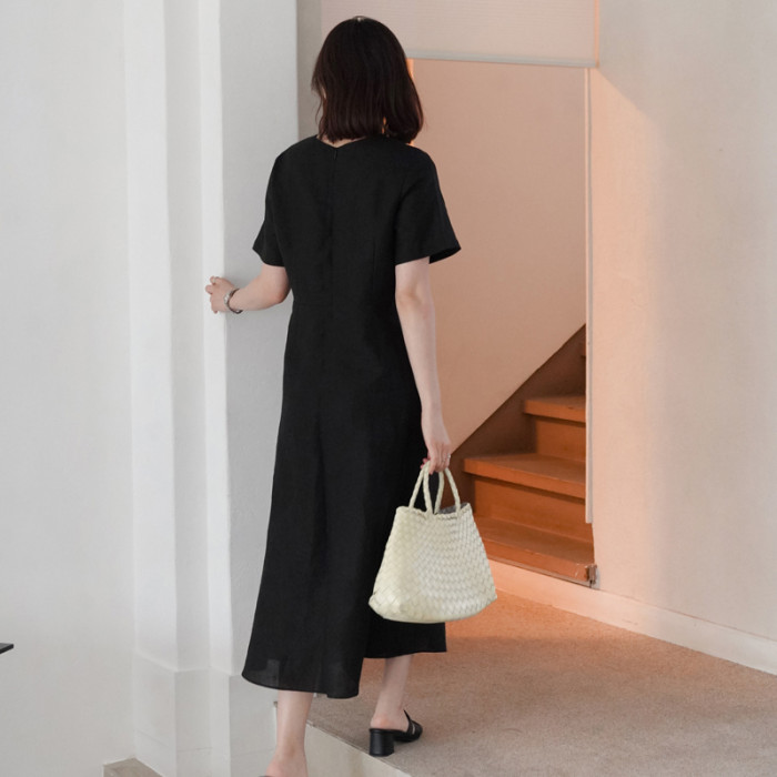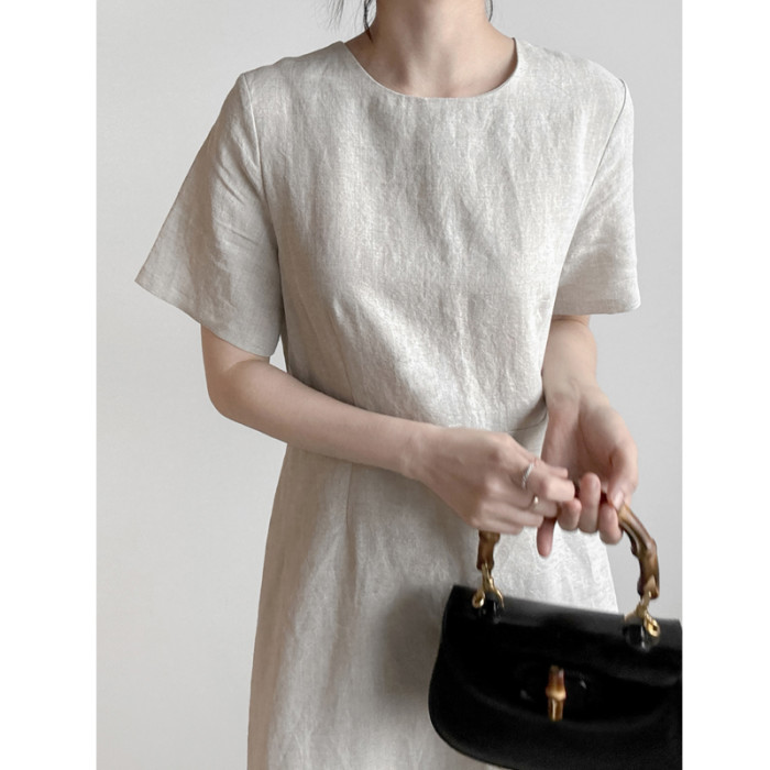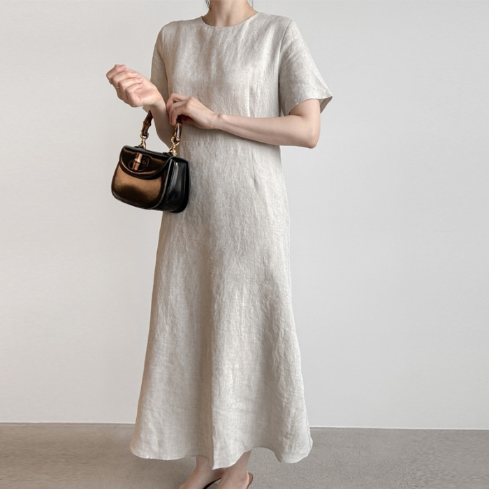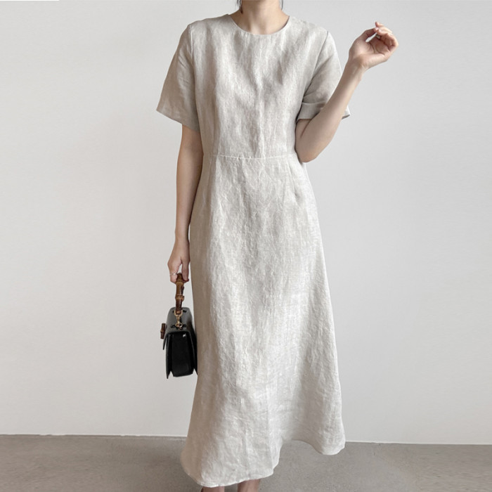 2025夏裝新款韓版中長款過膝亞麻連衣裙短袖圓領大擺棉麻裙大碼女