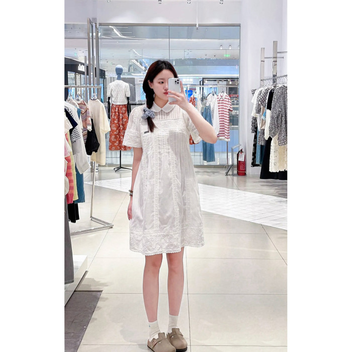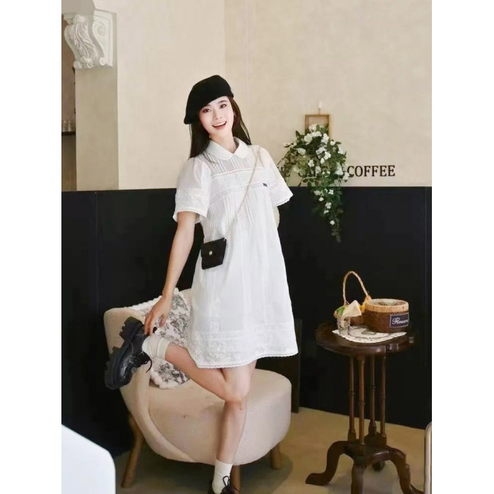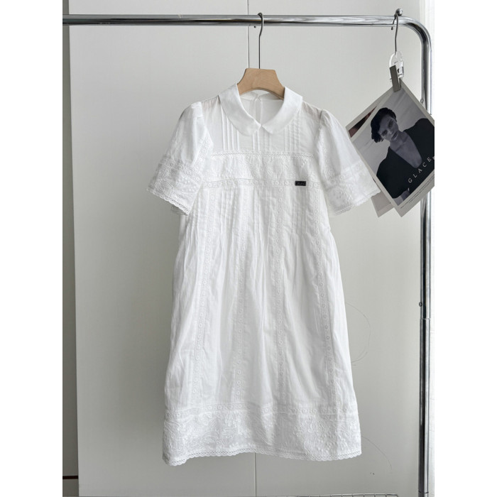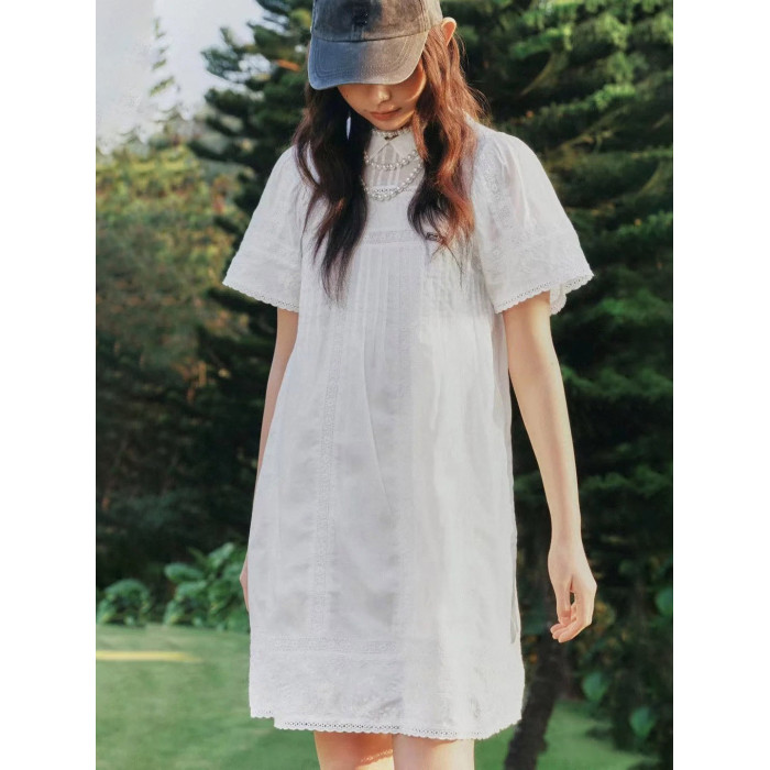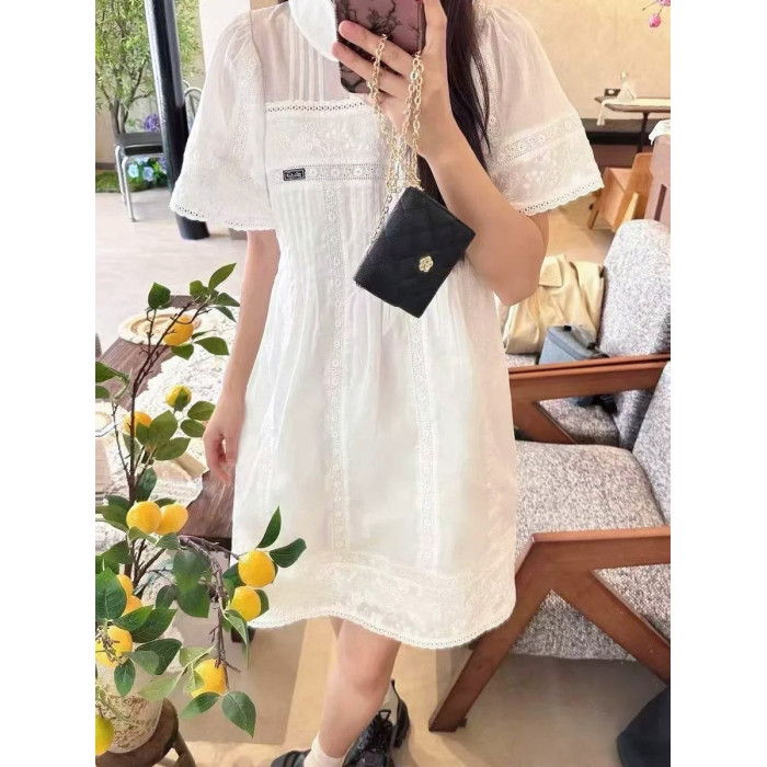 【高版本】2025夏季新款短袖裙子蕾絲花邊刺綉甜美風白色連衣裙