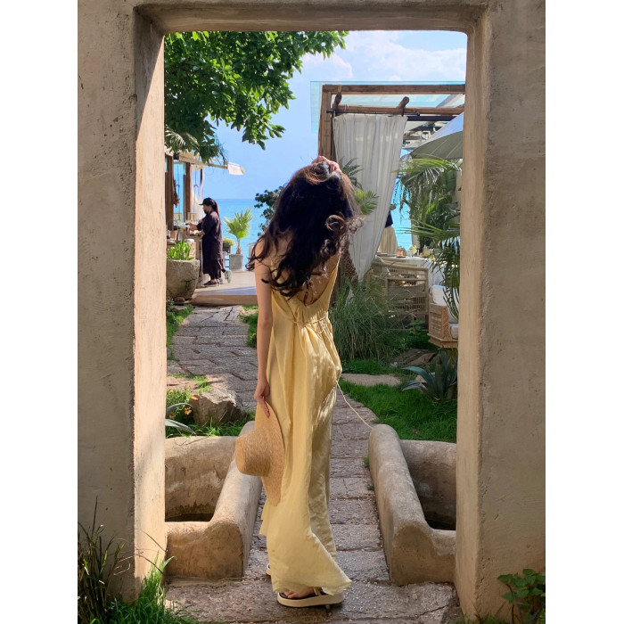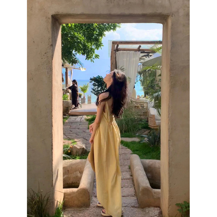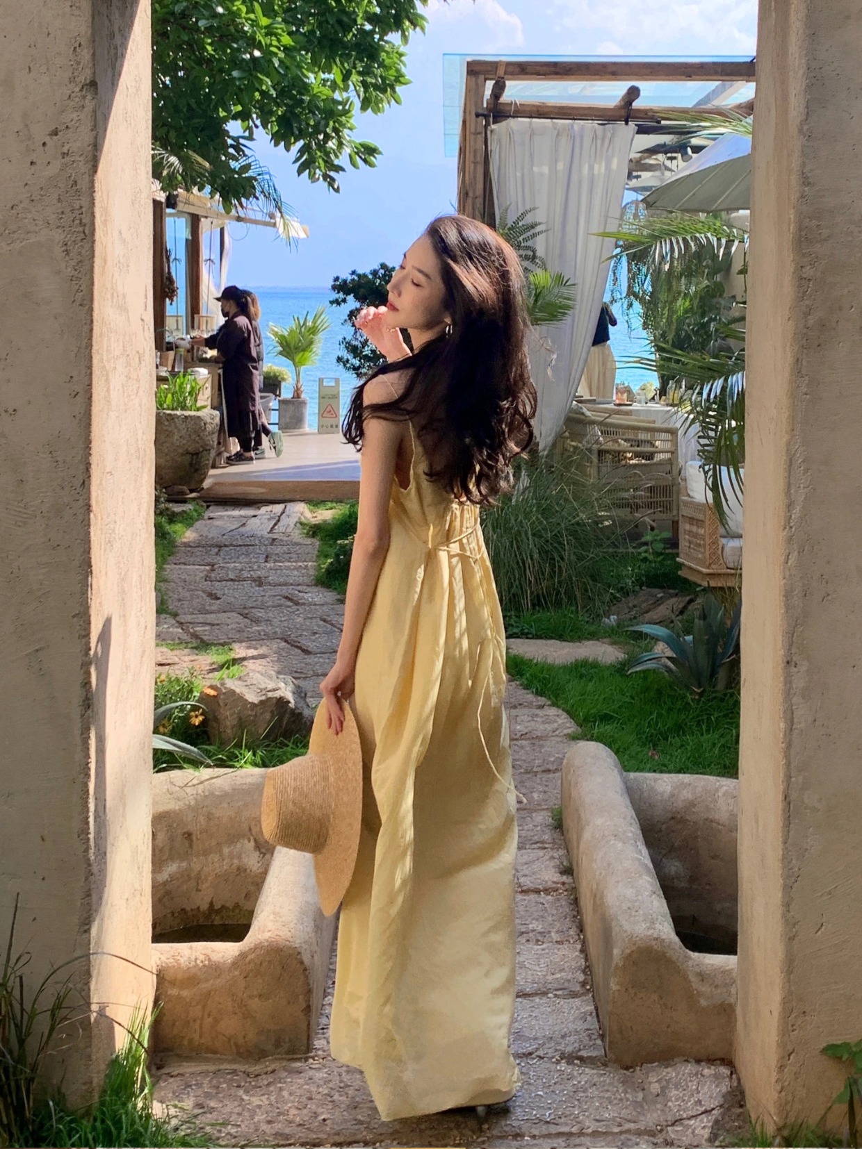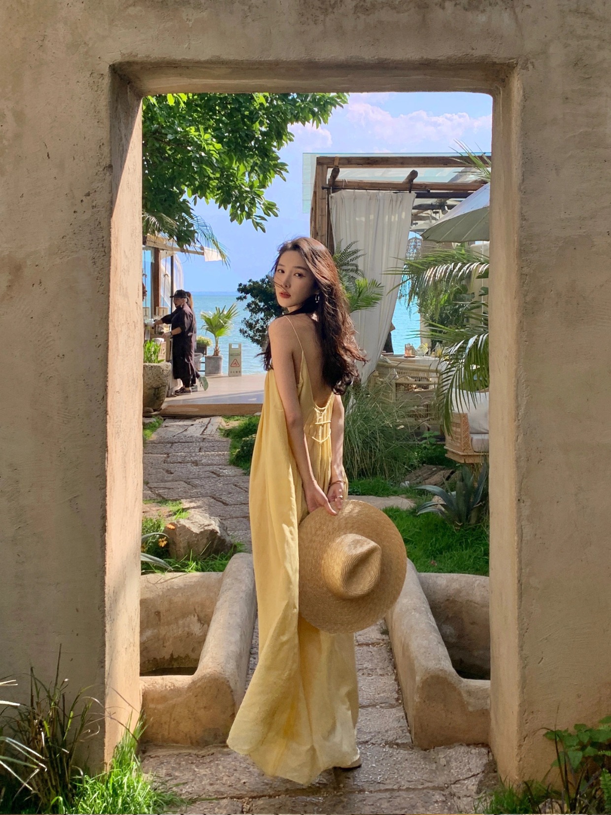 大理洱海法式拍照裙子西雙版納長裙女海南三亞度假沙灘吊帶連衣裙