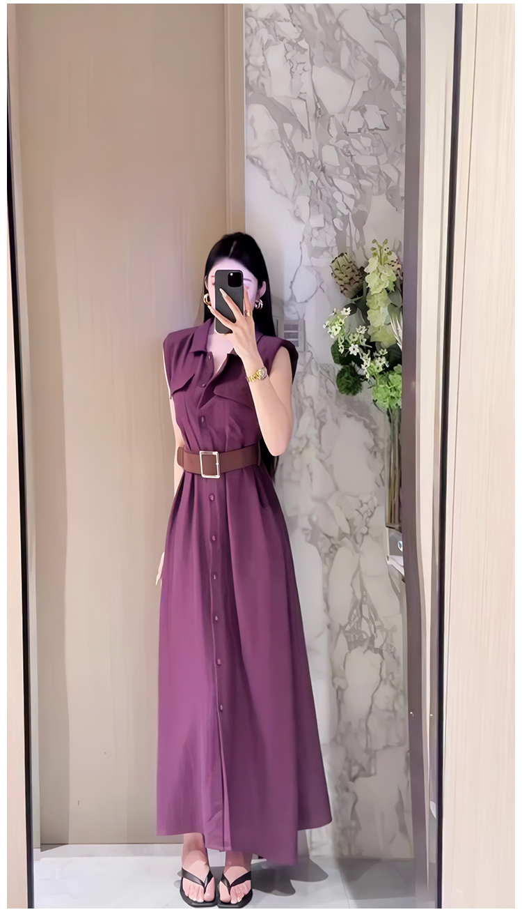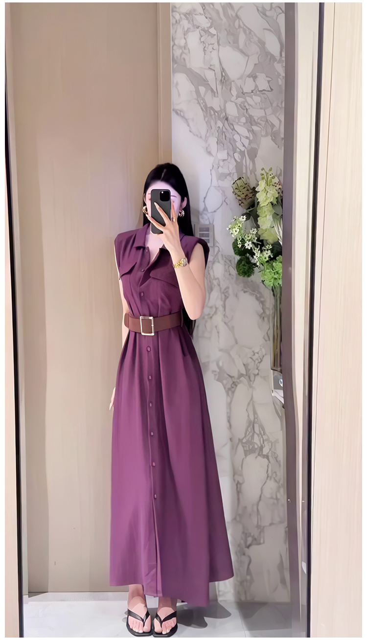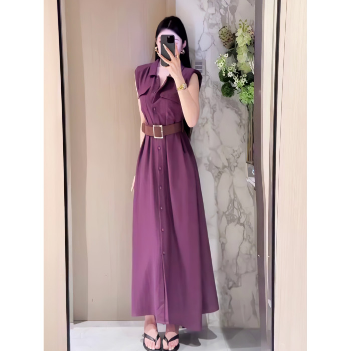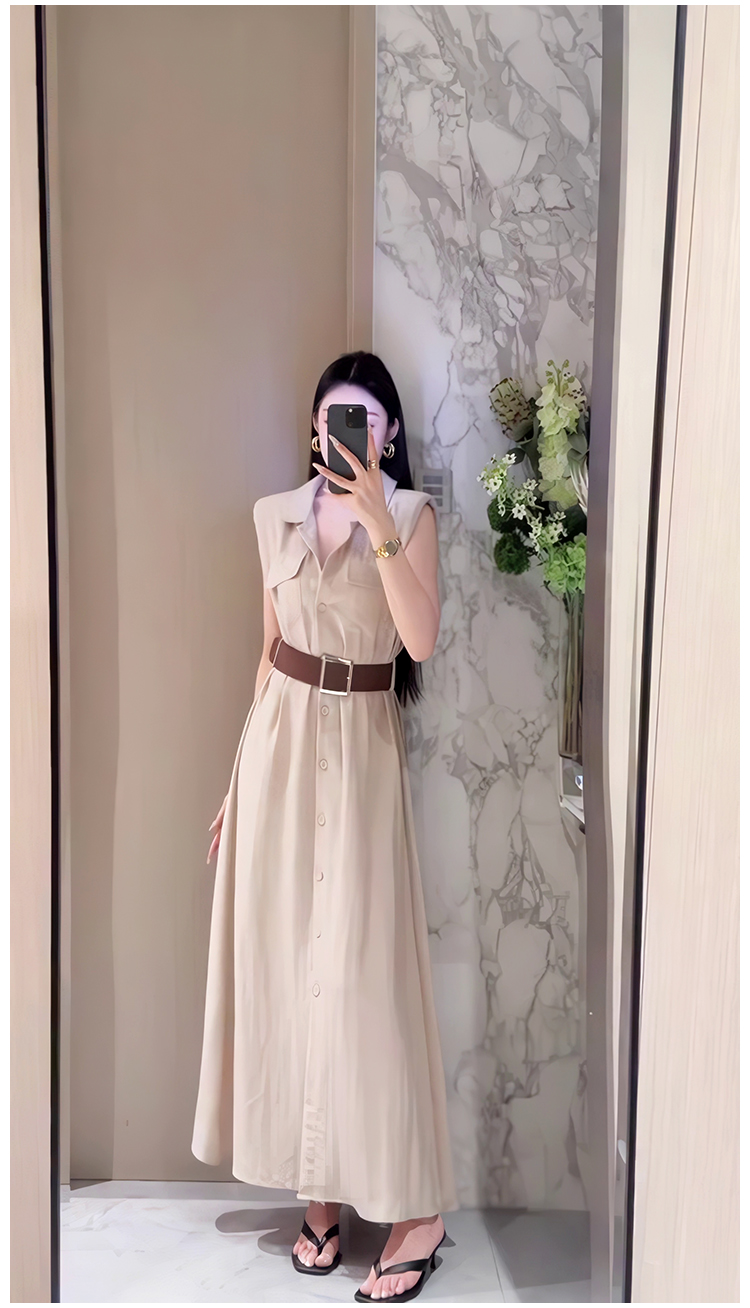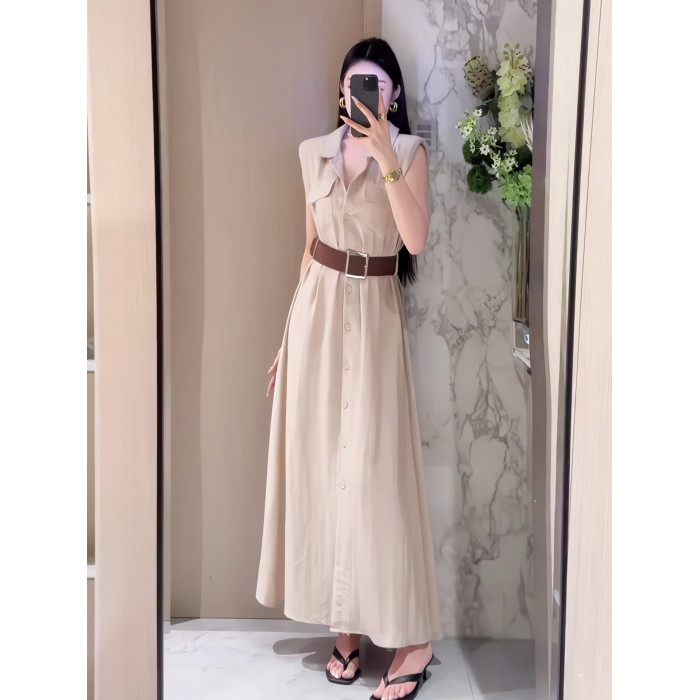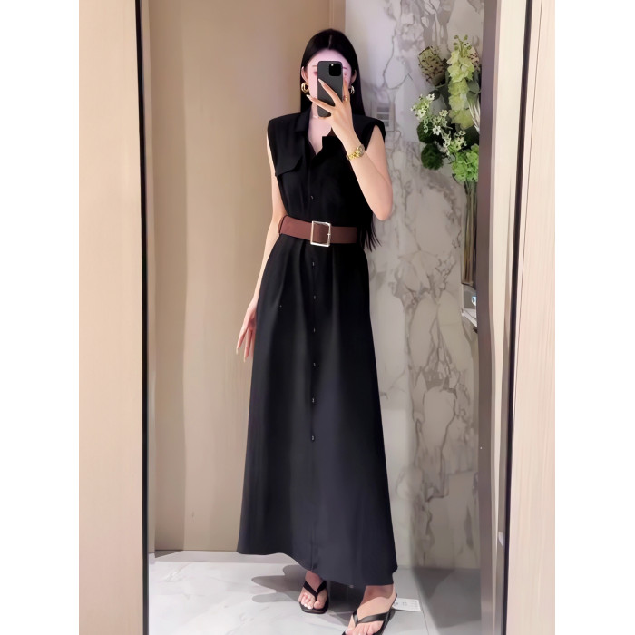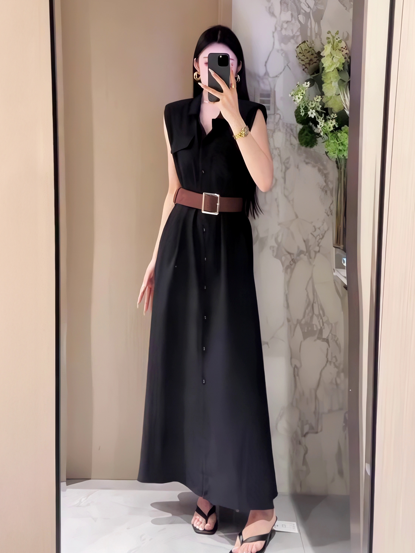 復古翻領無袖紐釦設計連衣裙女夏裝新款氣質通勤純色收腰顯瘦長裙