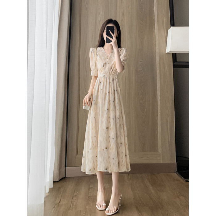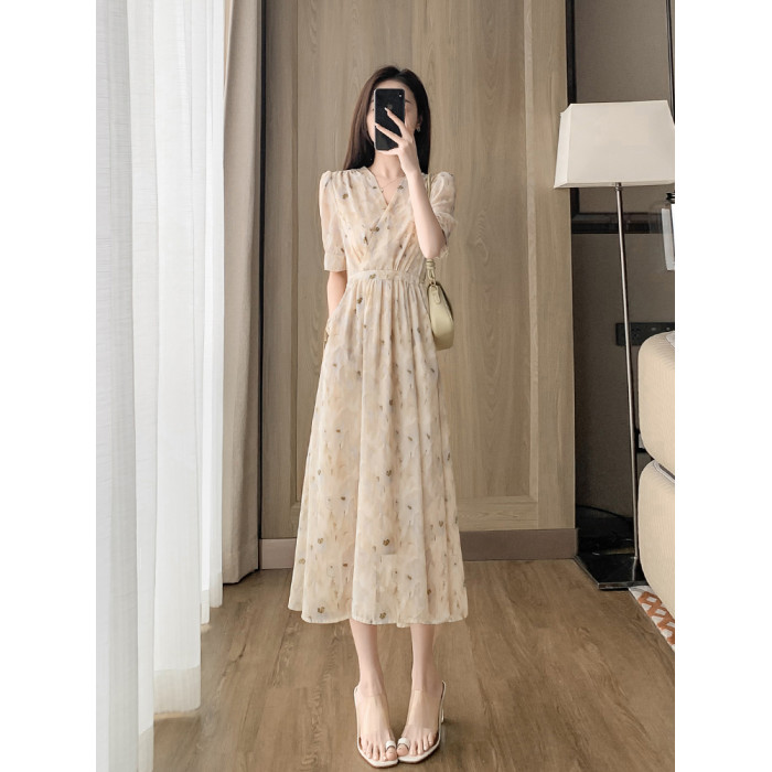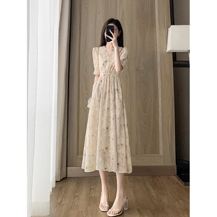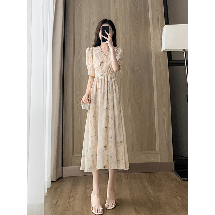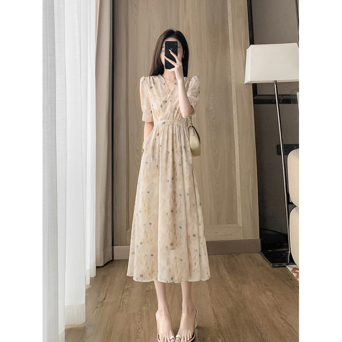 茶歇法式雪紡碎花連衣裙女2025新款夏季氣質v領收腰中長款a字裙子
