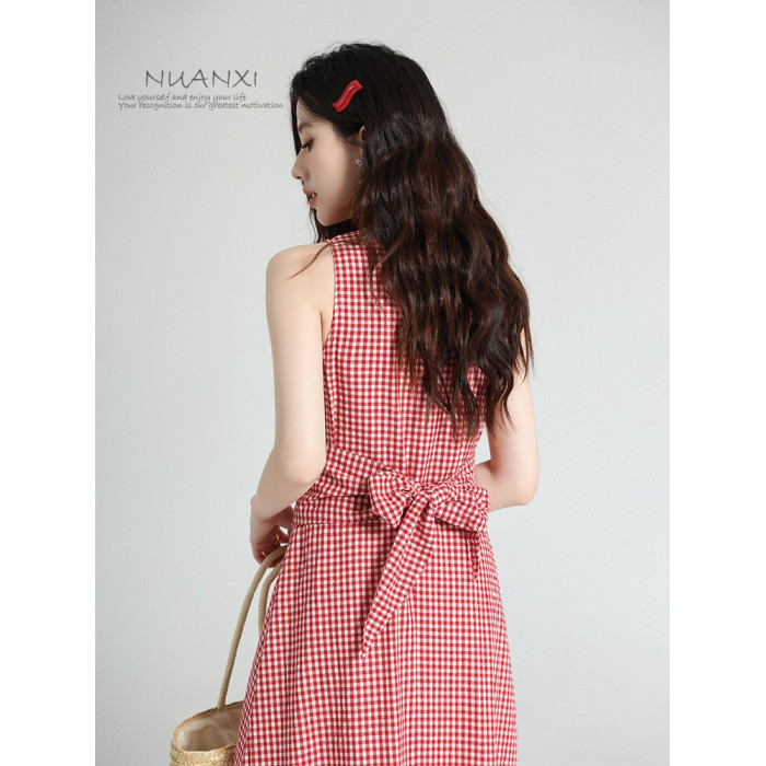 暖兮NUANXI法式氣質紅色格子掛脖連衣裙女2025夏新款收腰顯瘦長裙