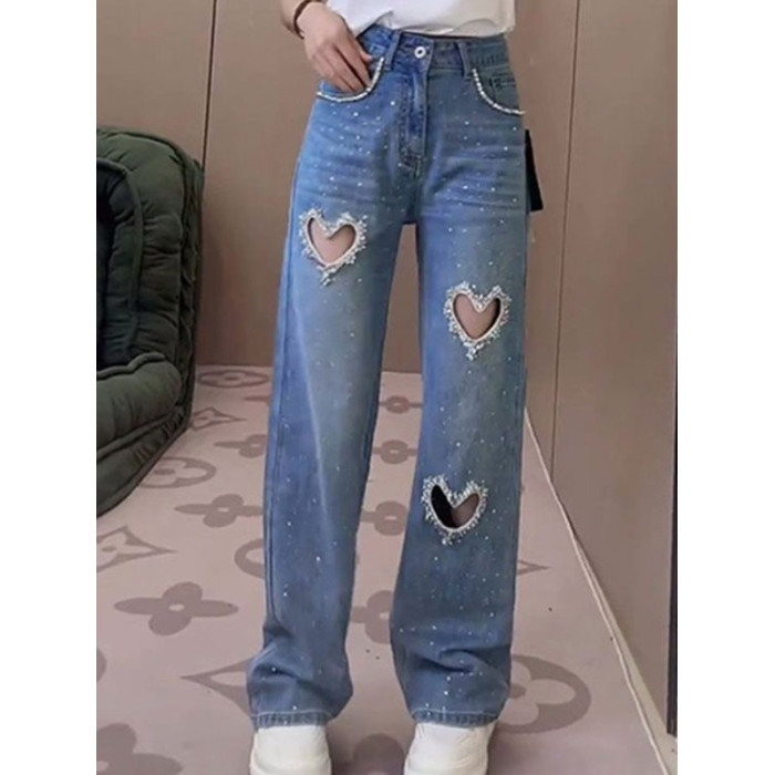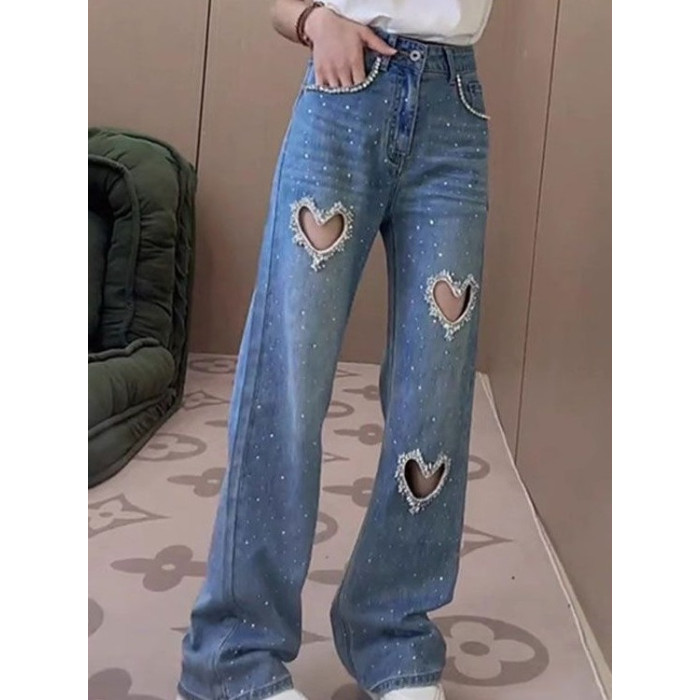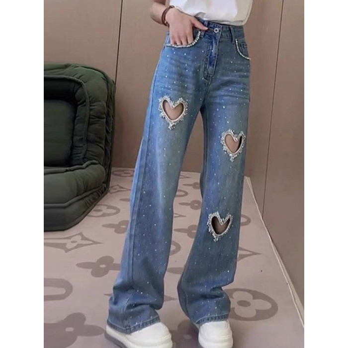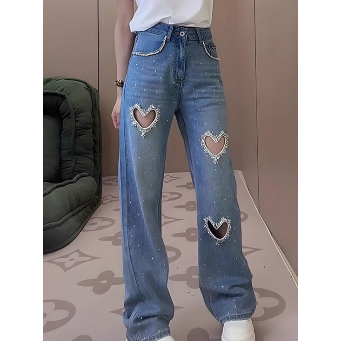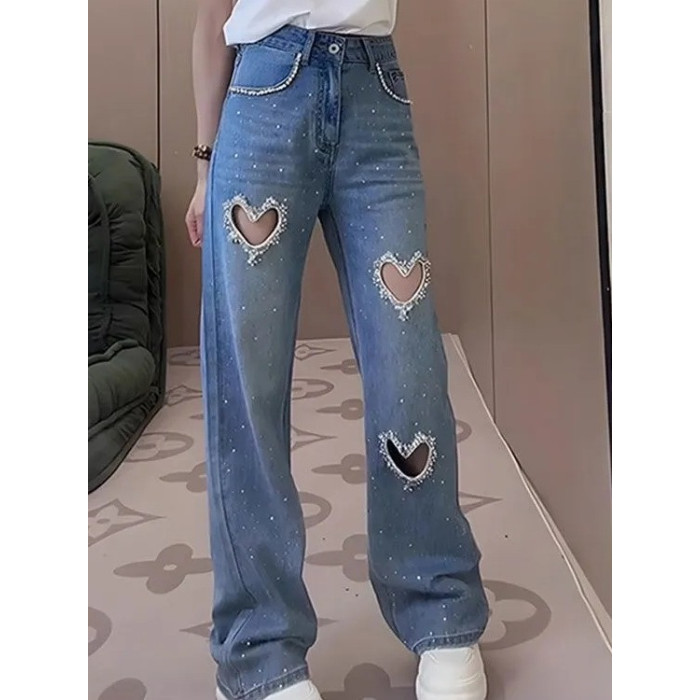 韓系重工鑲鑽釘珠鏤空愛心破洞牛仔褲女2025年夏季直筒濶腿褲長褲