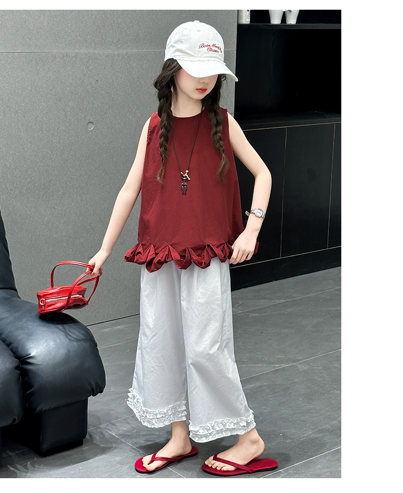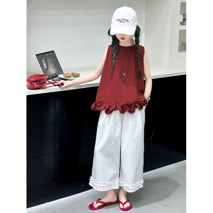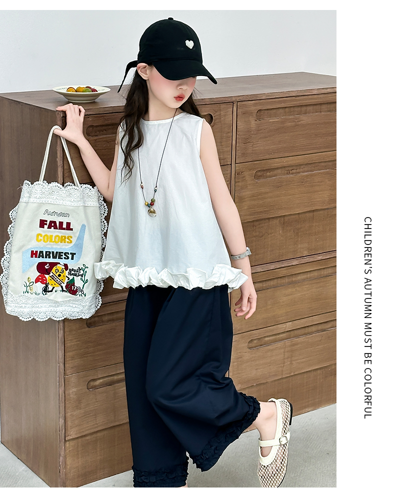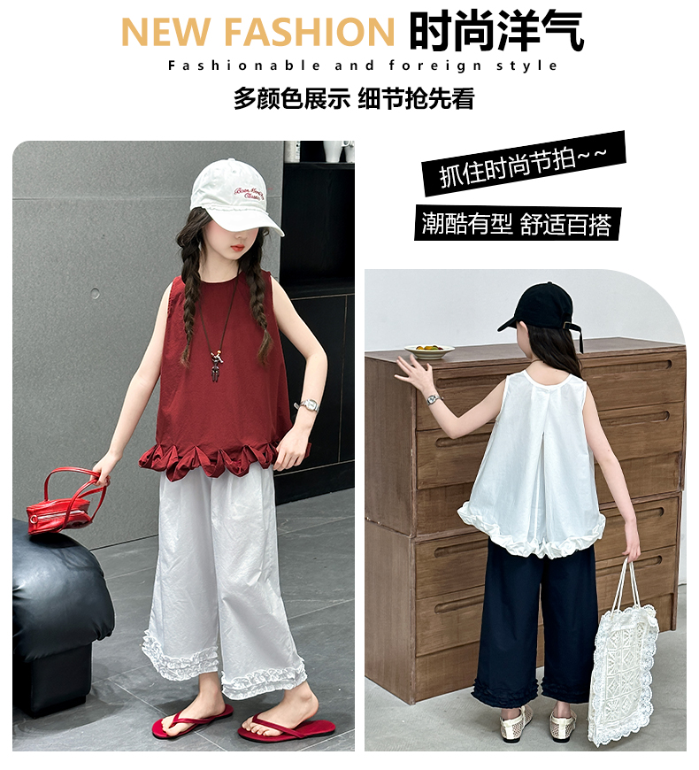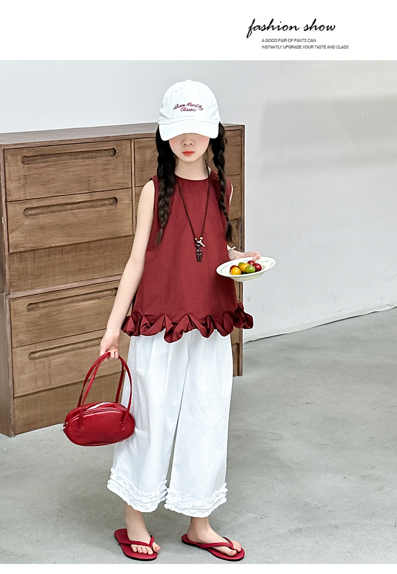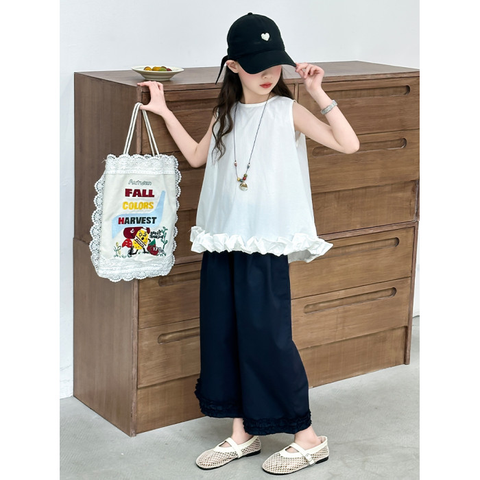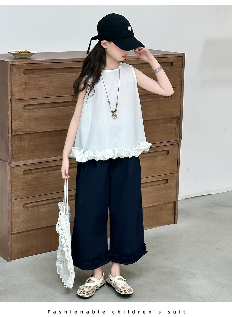 女童褲子夏季薄款洋氣寬松木耳花邊濶腿褲時髦娃娃衫九分褲兩件套