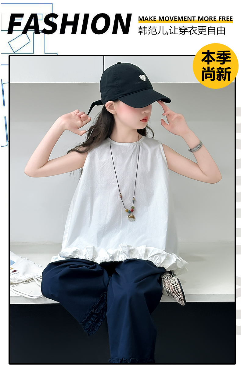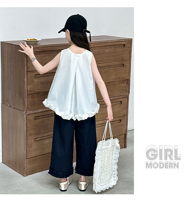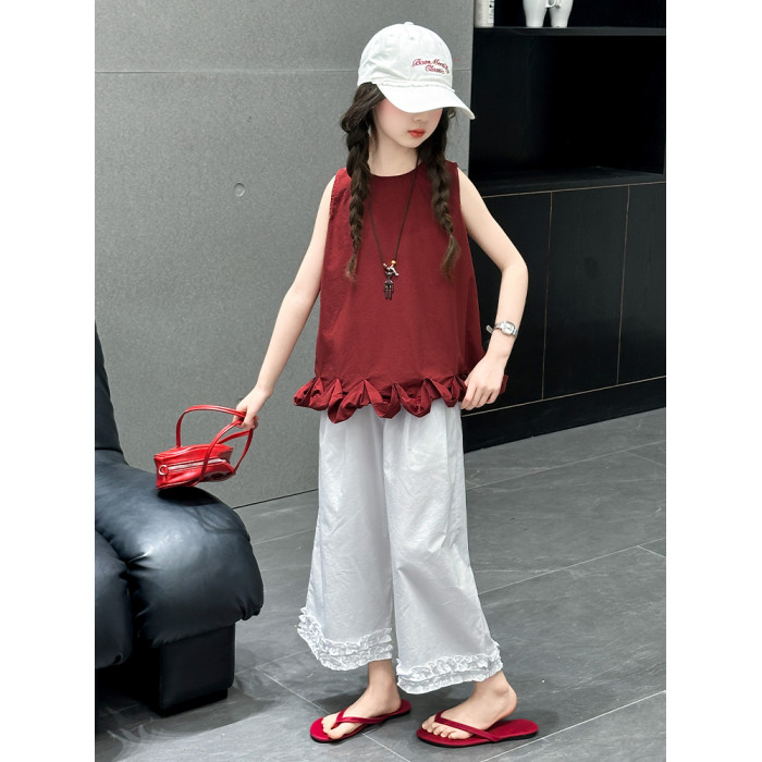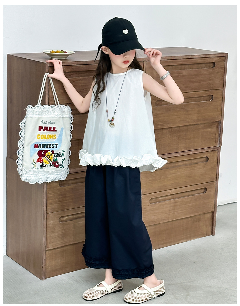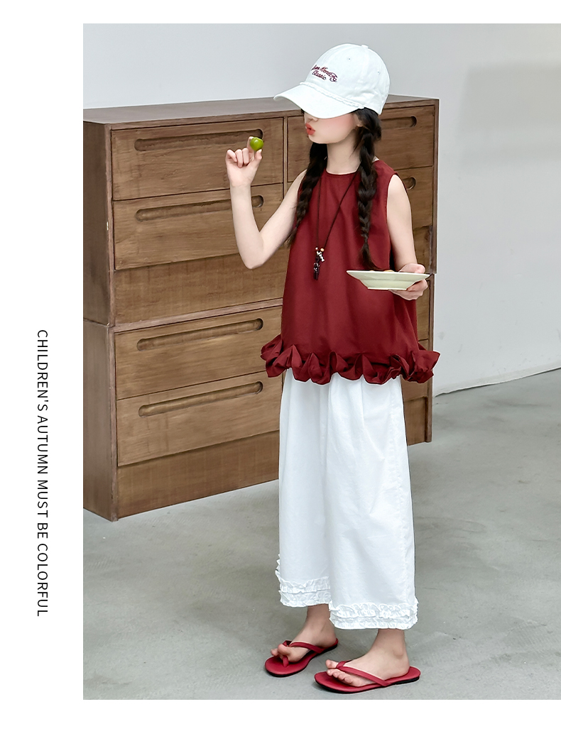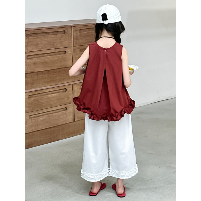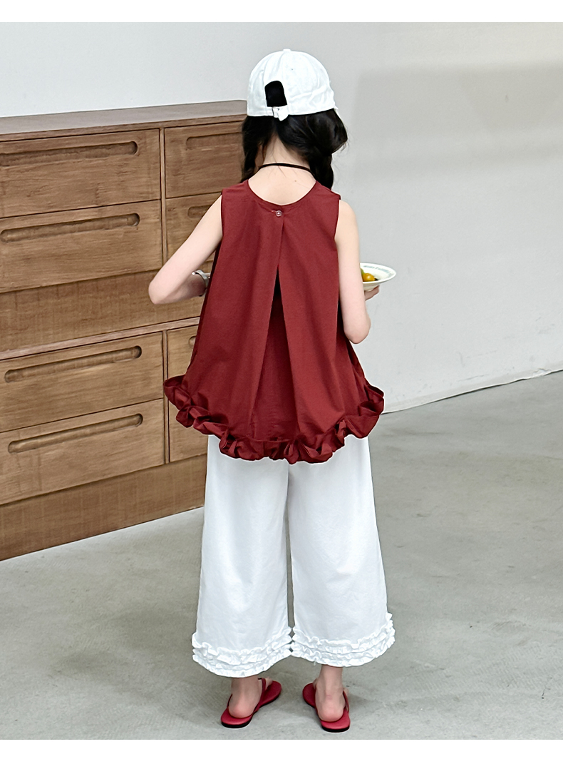 女童褲子夏季薄款洋氣寬松木耳花邊濶腿褲時髦娃娃衫九分褲兩件套