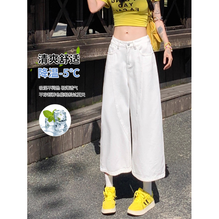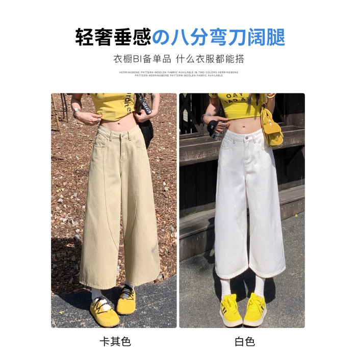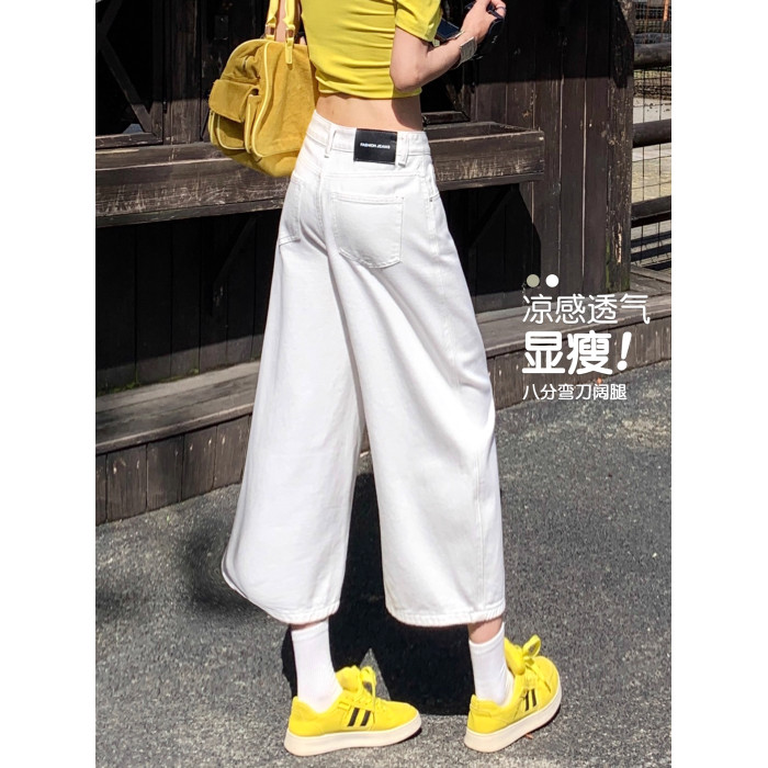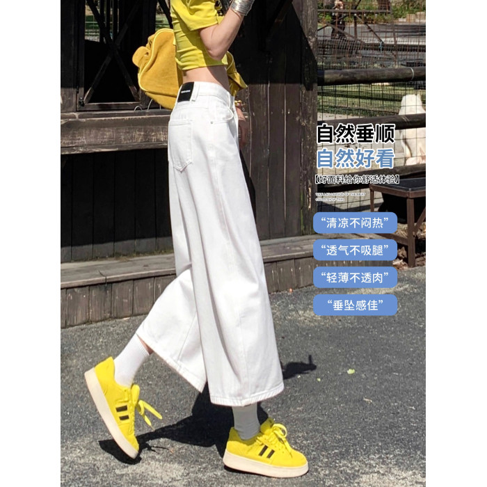 高級白色牛仔褲女夏季薄款高腰垂感寬松窄版小個子直筒彎刀濶腿褲