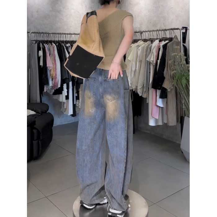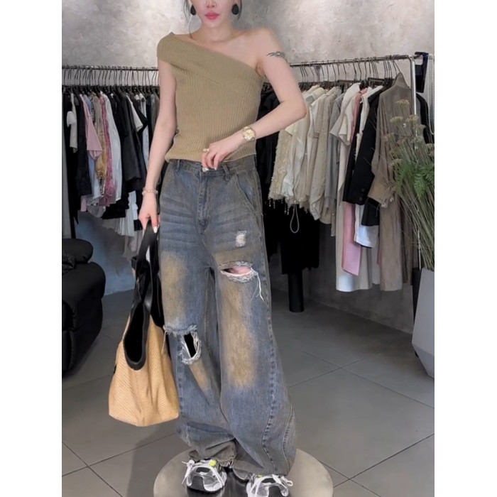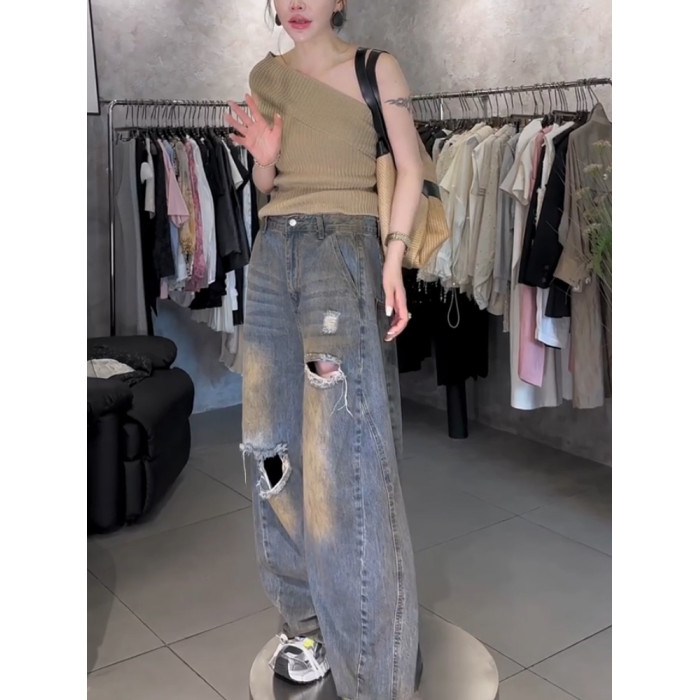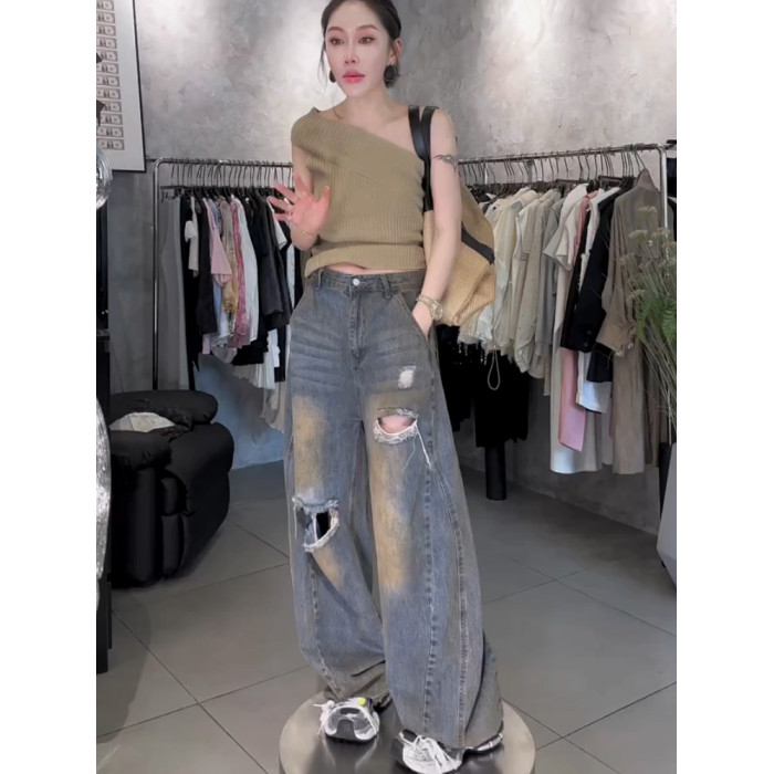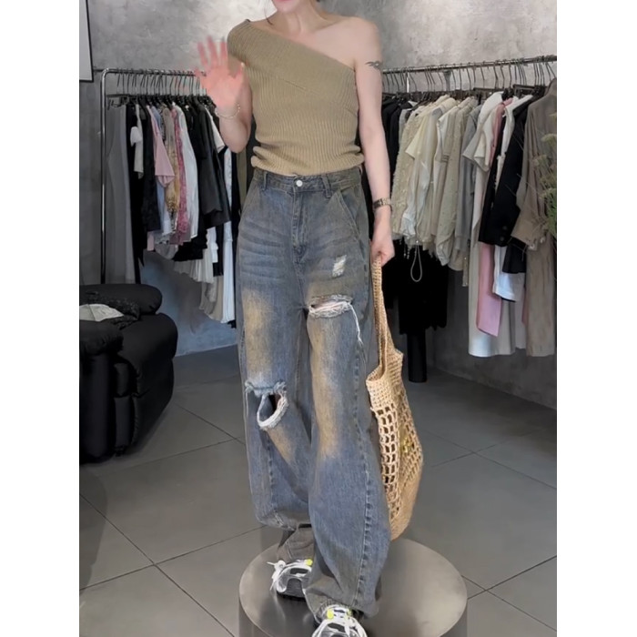 廢土風破洞牛仔褲女夏季新款高腰顯瘦寬松直筒褲潮流百搭濶腿褲