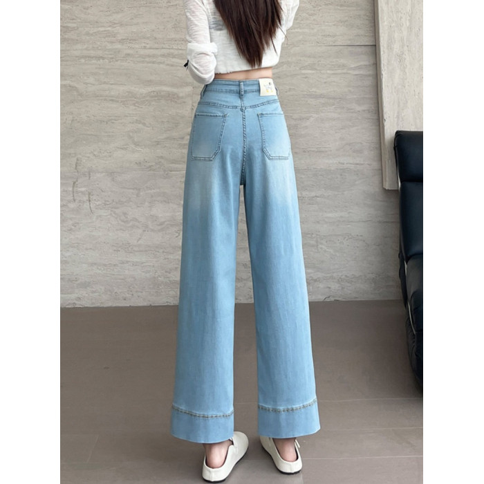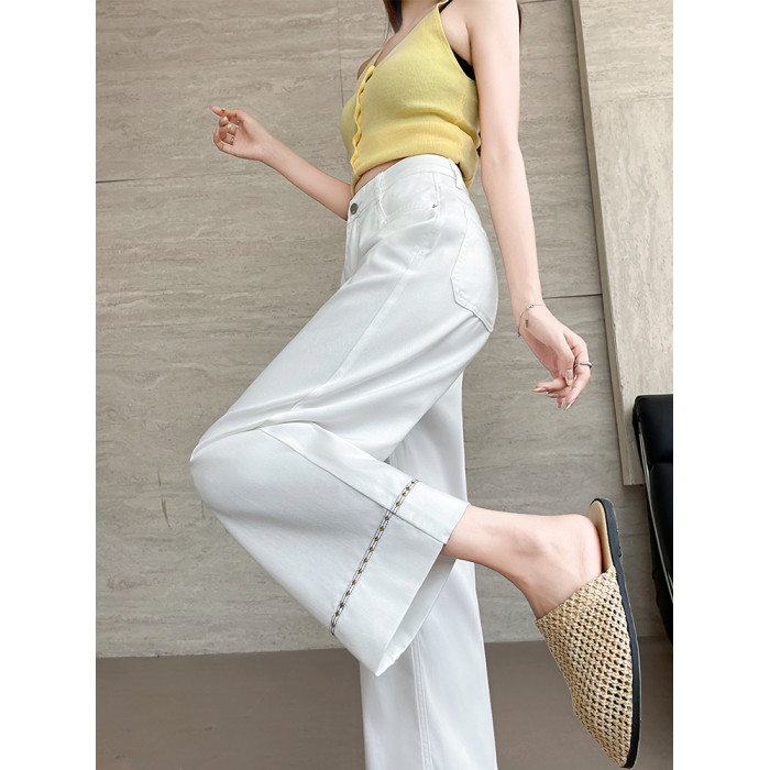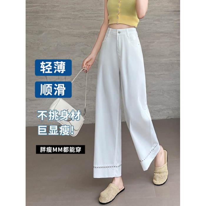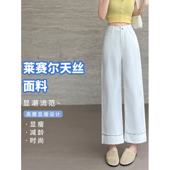 mjae白色天絲刺綉九分牛仔褲女夏季2025薄款小個子高腰直筒濶腿褲