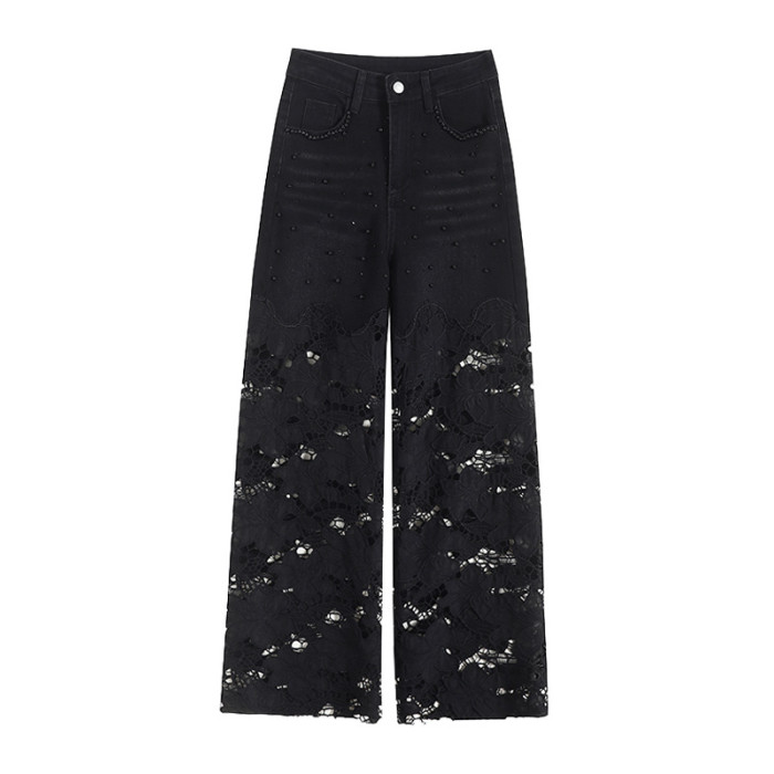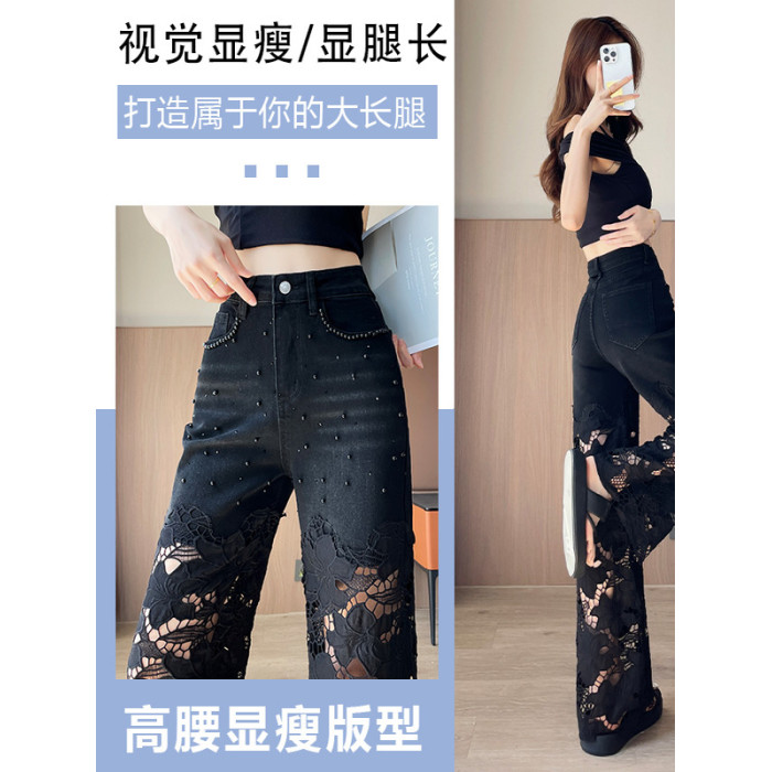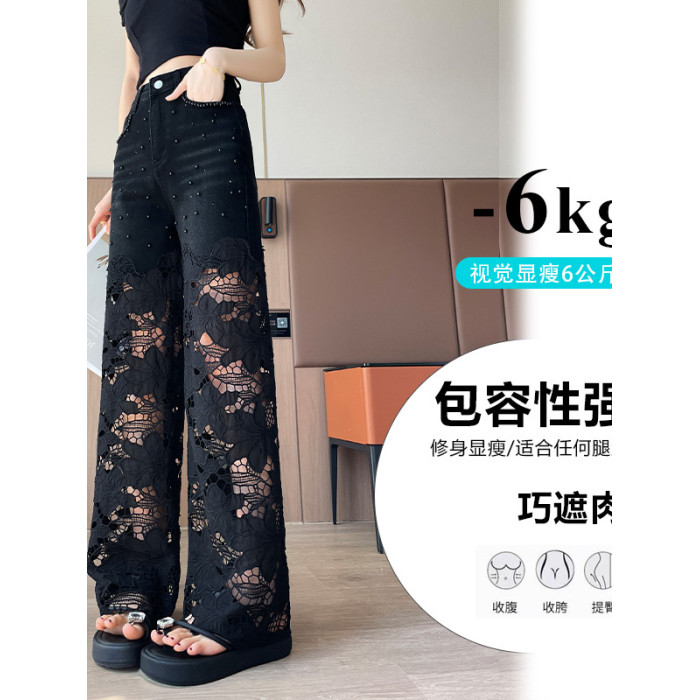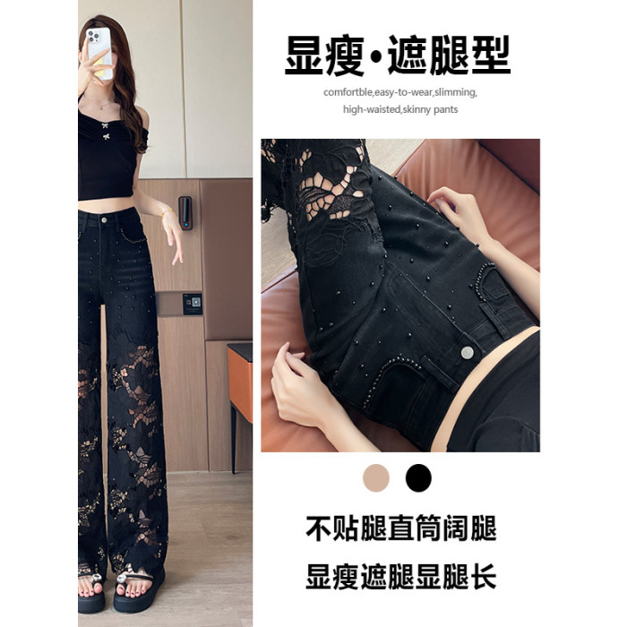 隅見丨重工蕾絲鏤空釘珠牛仔褲女夏季薄款2025新款高腰直筒濶腿褲