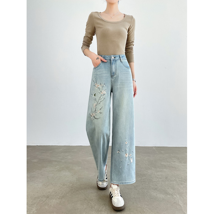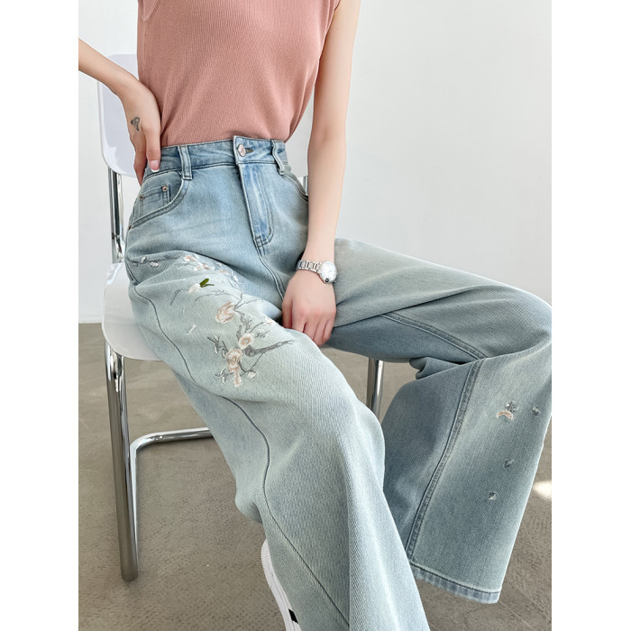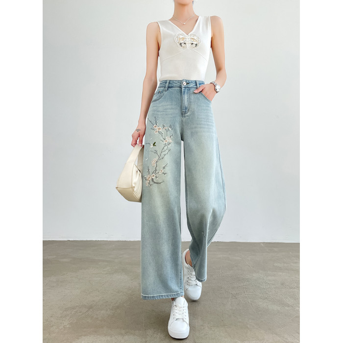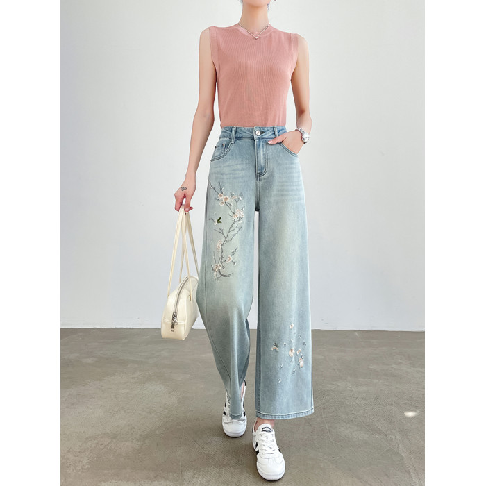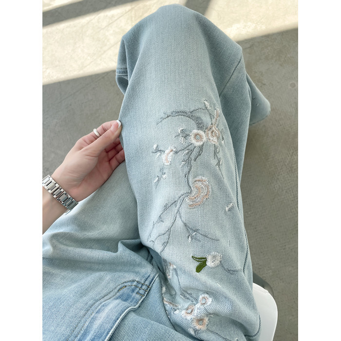 高級新中式刺綉牛仔褲女夏薄款國風小個子九分直筒顯瘦綉花濶腿褲