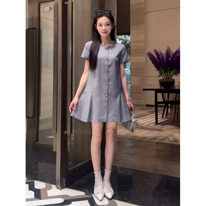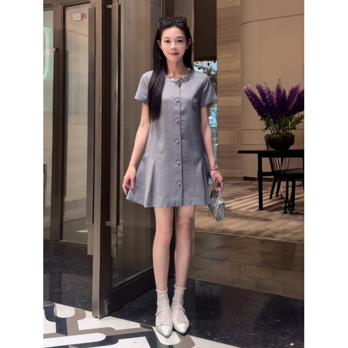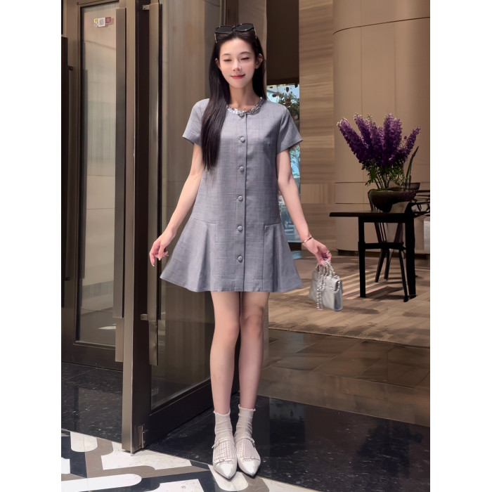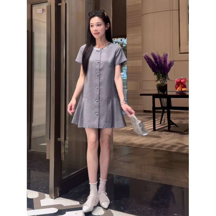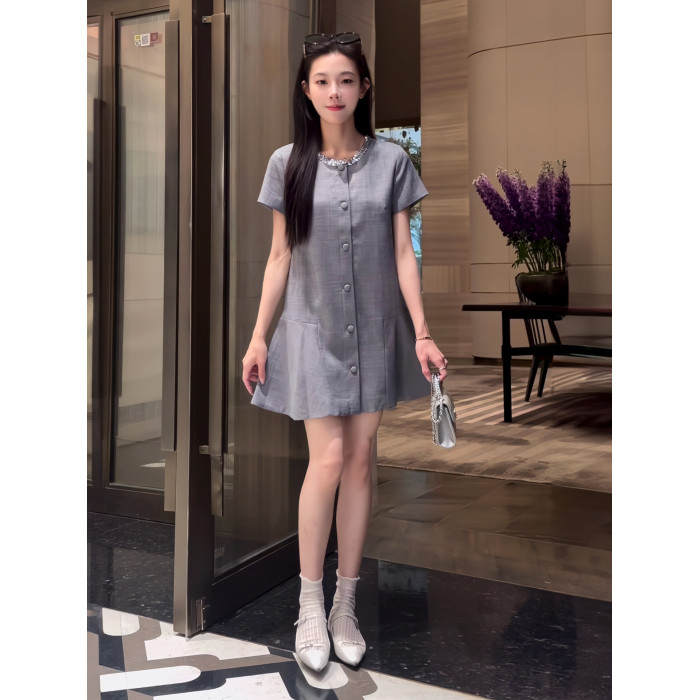 2025新款夏季氣質亮片領口韓系小香風連衣裙灰色單排釦顯瘦連衣裙