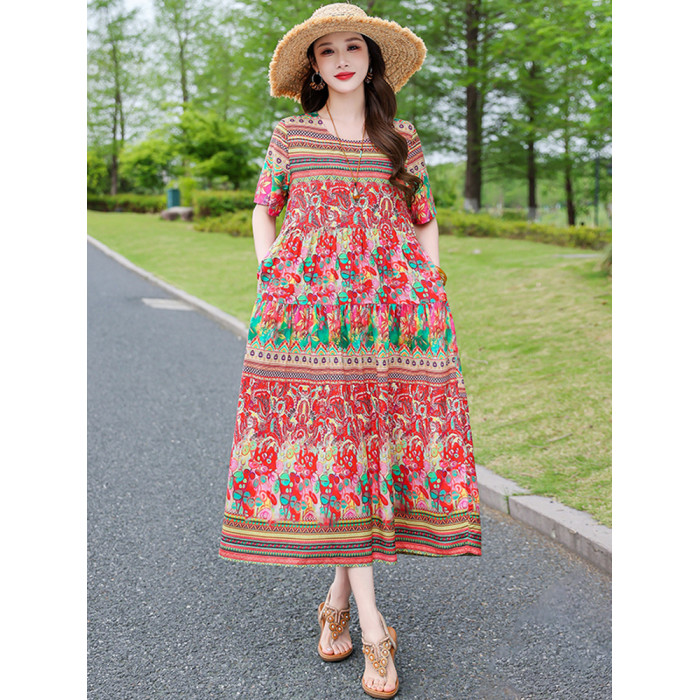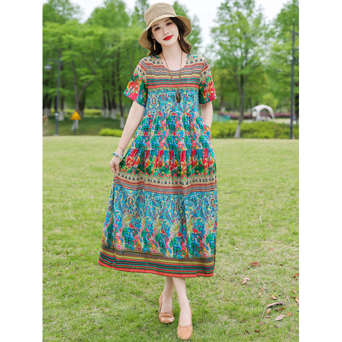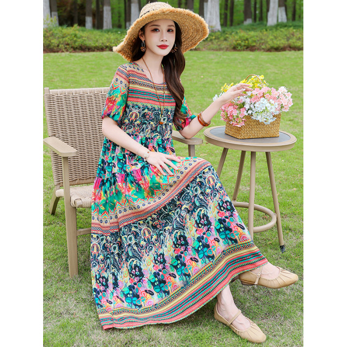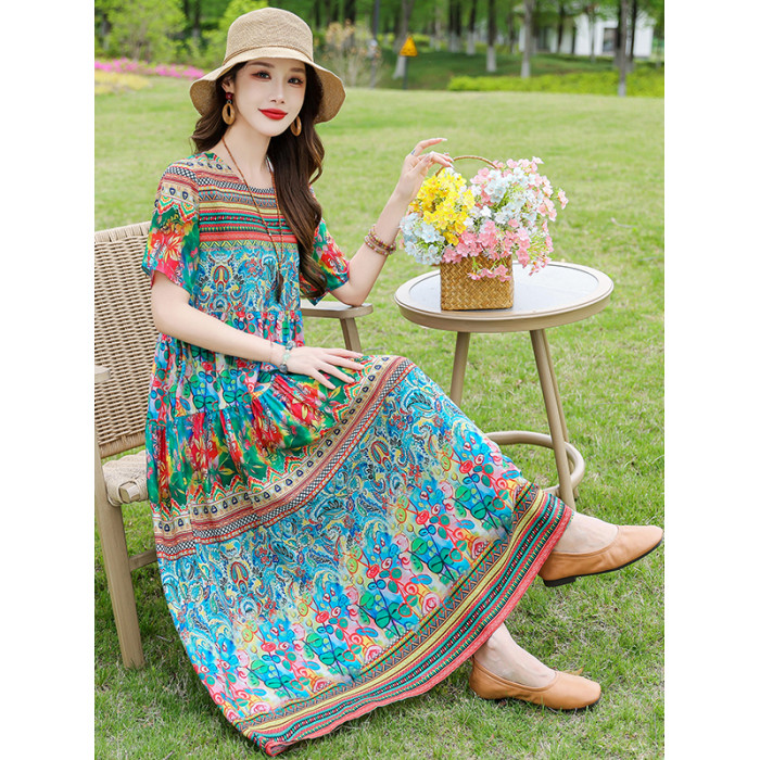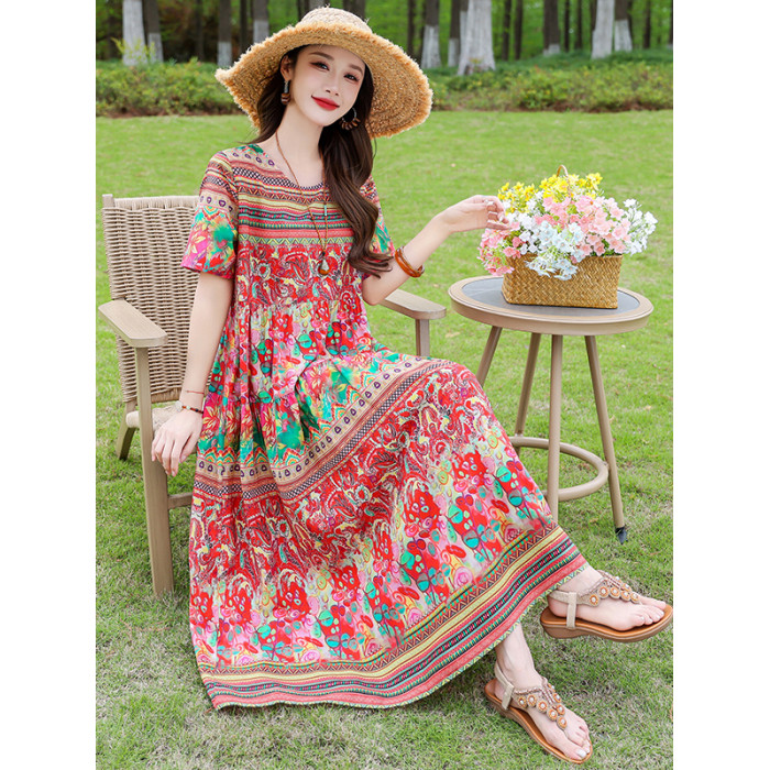民族風2025新款夏季高級進口棉綢連衣裙雲南大理旅遊度假碎花裙子
