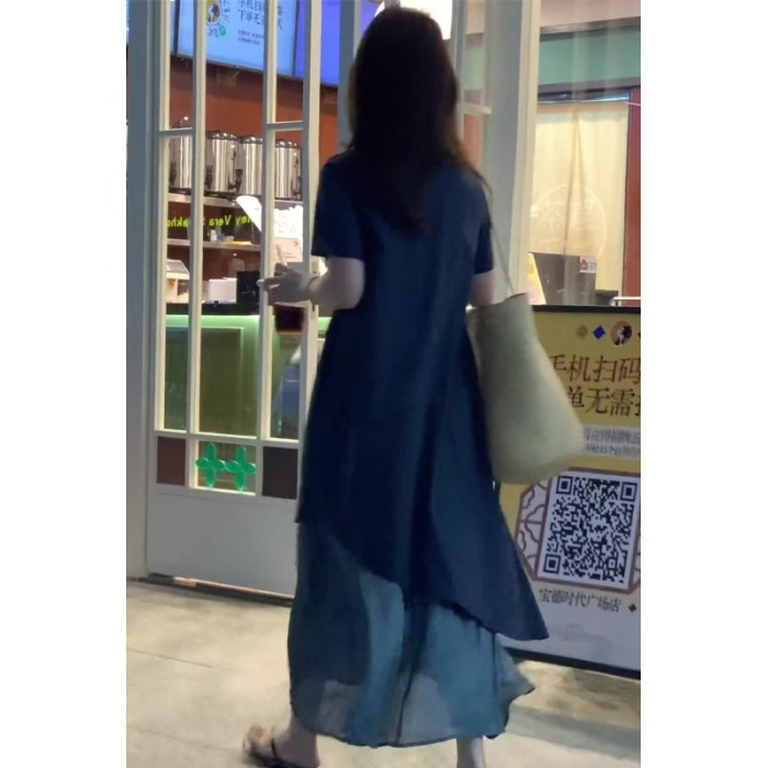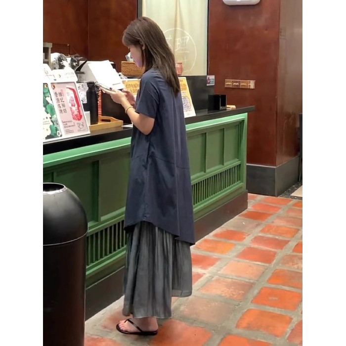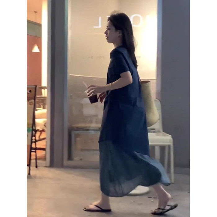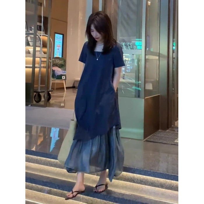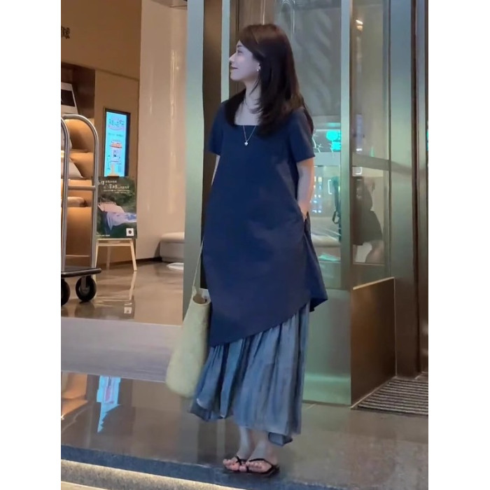 歐洲站夏季2025新款小衆設計感不規則連衣裙方領氣質方領過膝長裙