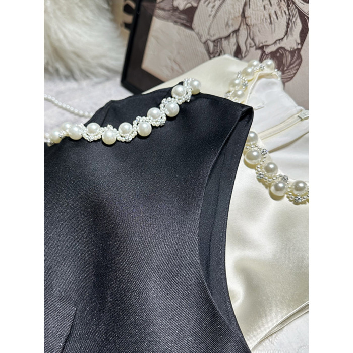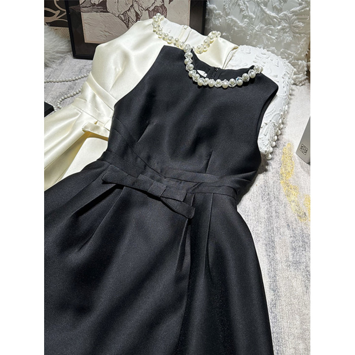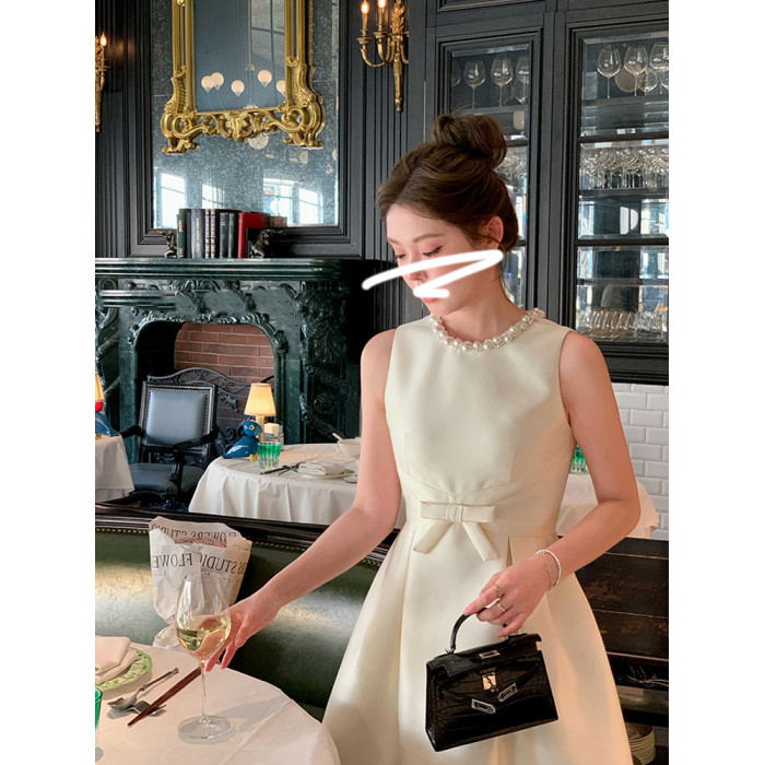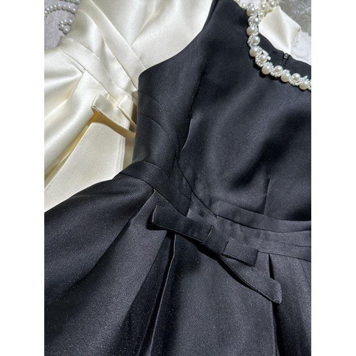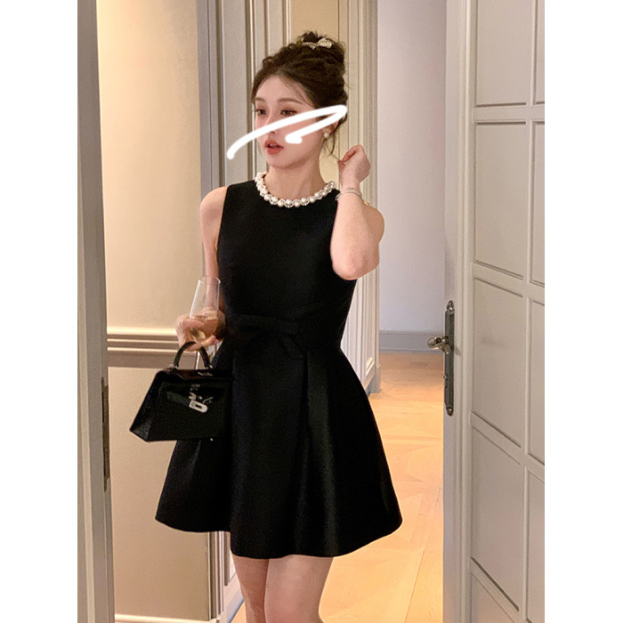FFmiss◆高級感蝴蝶結珍珠收腰連衣裙女夏名媛無袖釘珠聚會小黑裙
