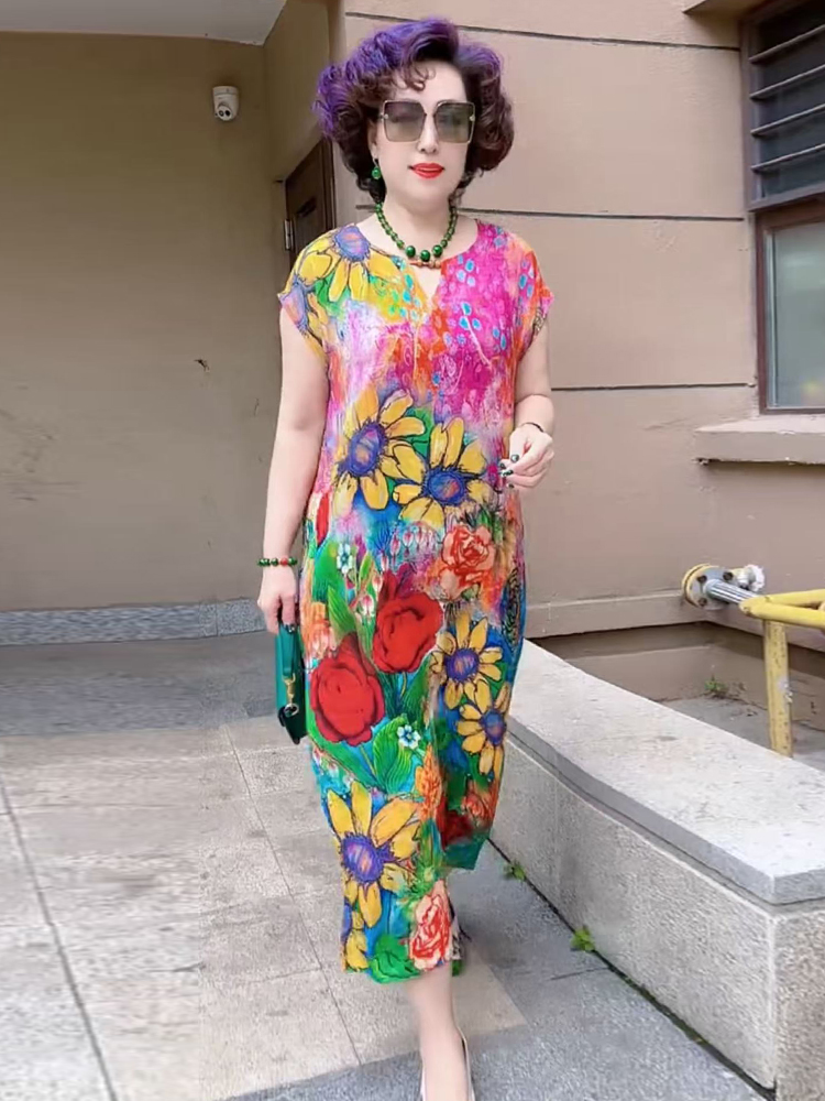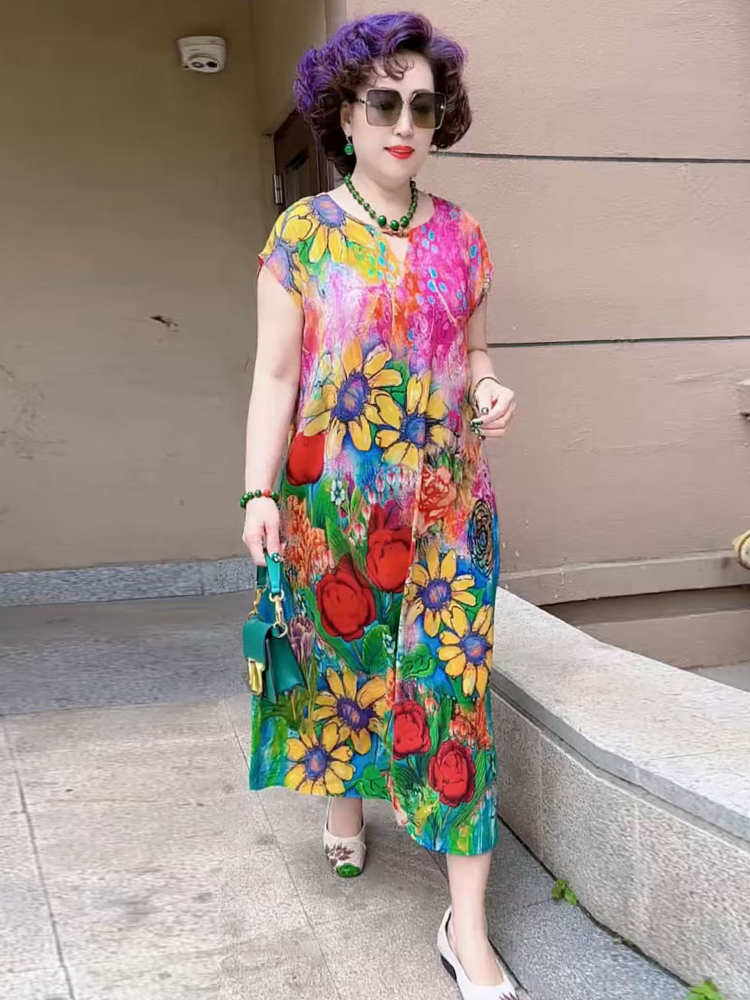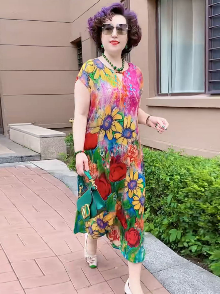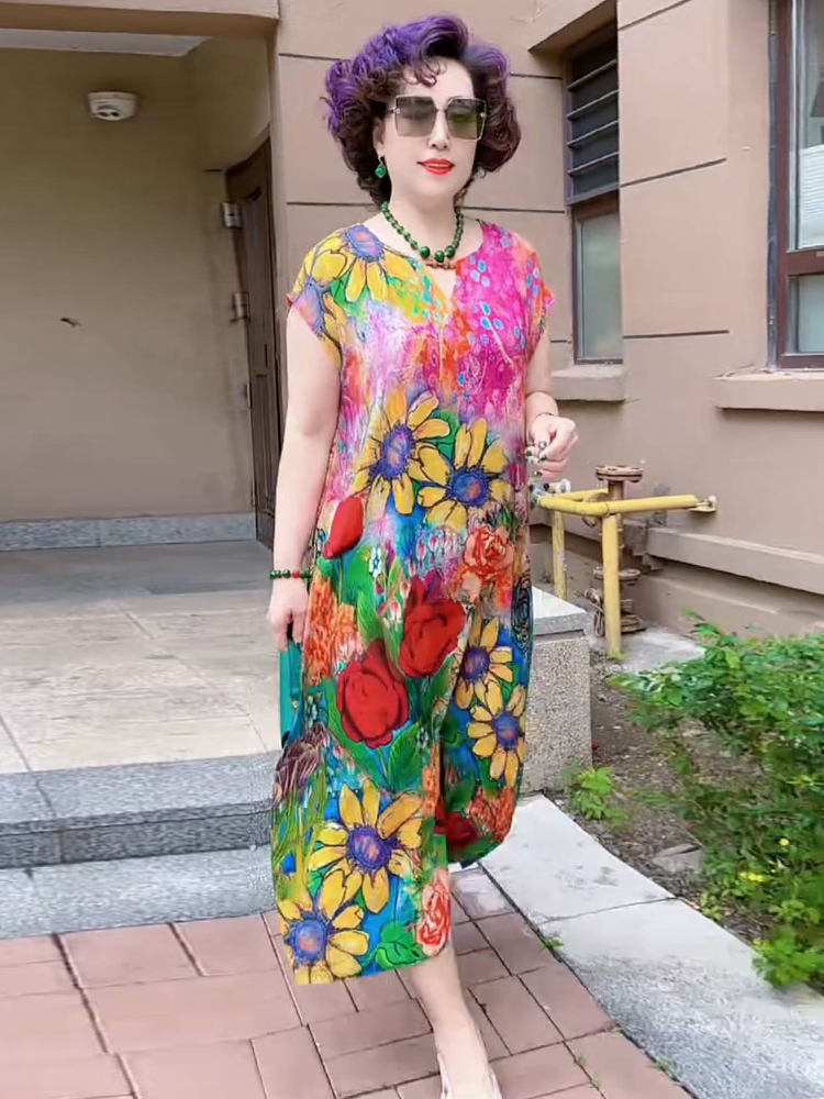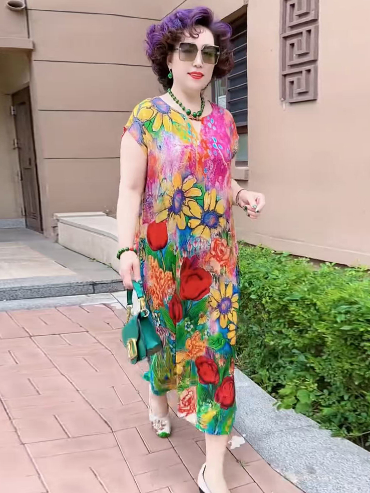 2025夏季新款時尚雙縐連衣裙氣質洋氣媽媽減齡寬松大碼花色長裙子