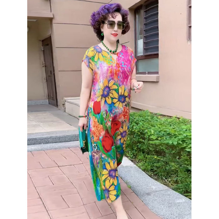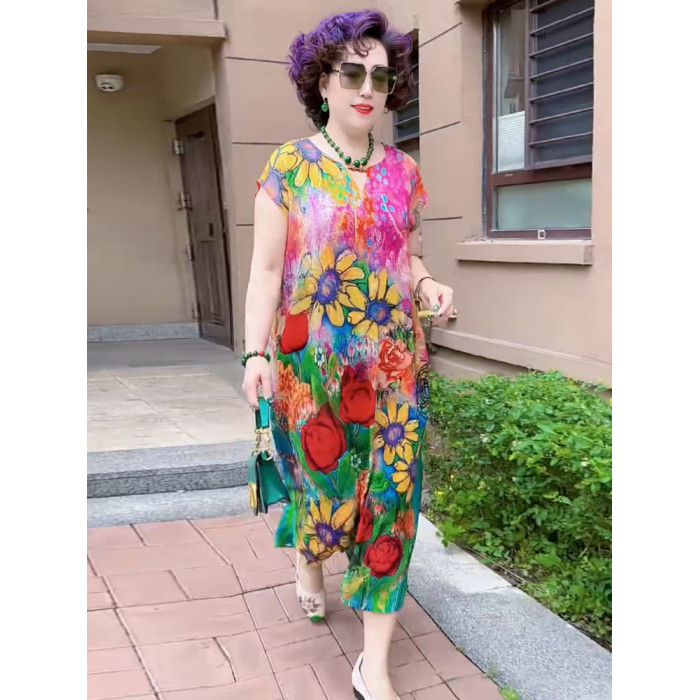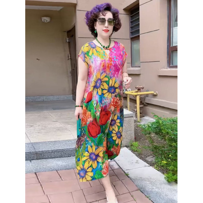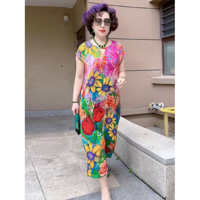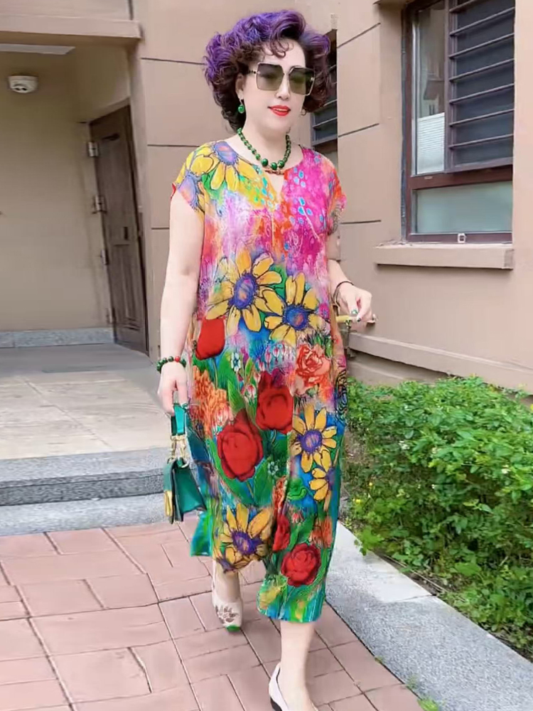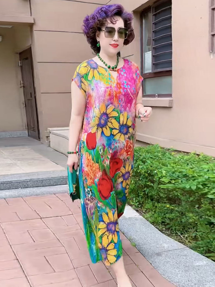 2025夏季新款時尚雙縐連衣裙氣質洋氣媽媽減齡寬松大碼花色長裙子