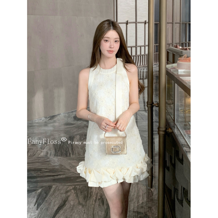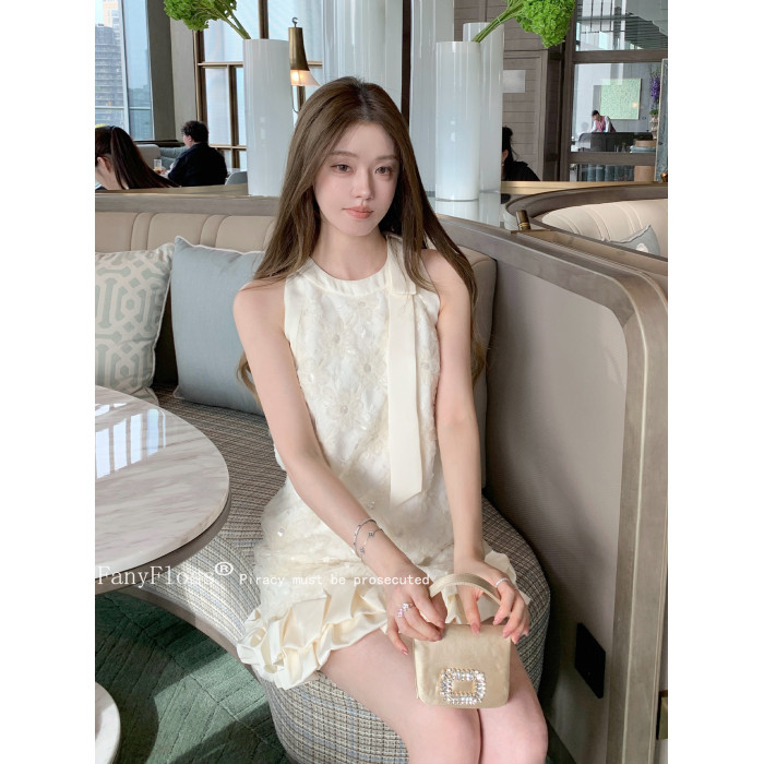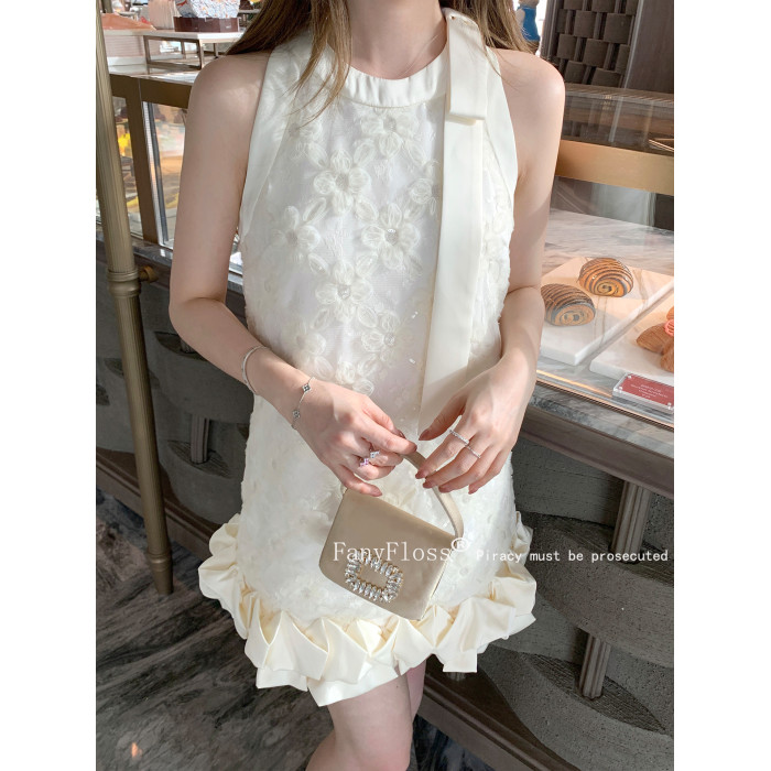 FanyFloss法式網紗亮片掛脖荷葉邊連衣裙女重工釘鑽無袖系帶短裙