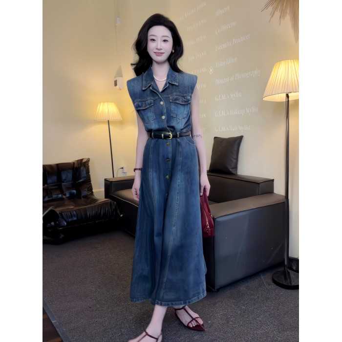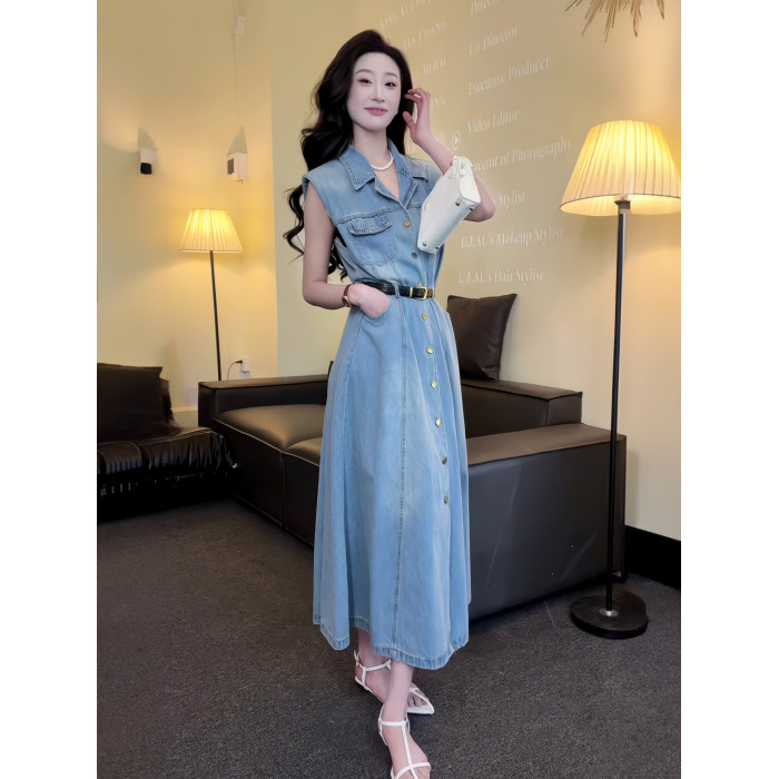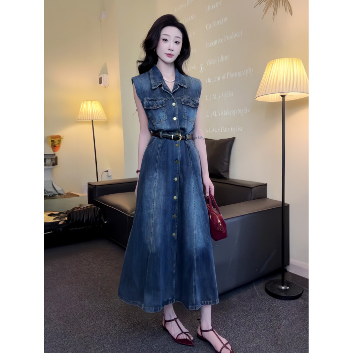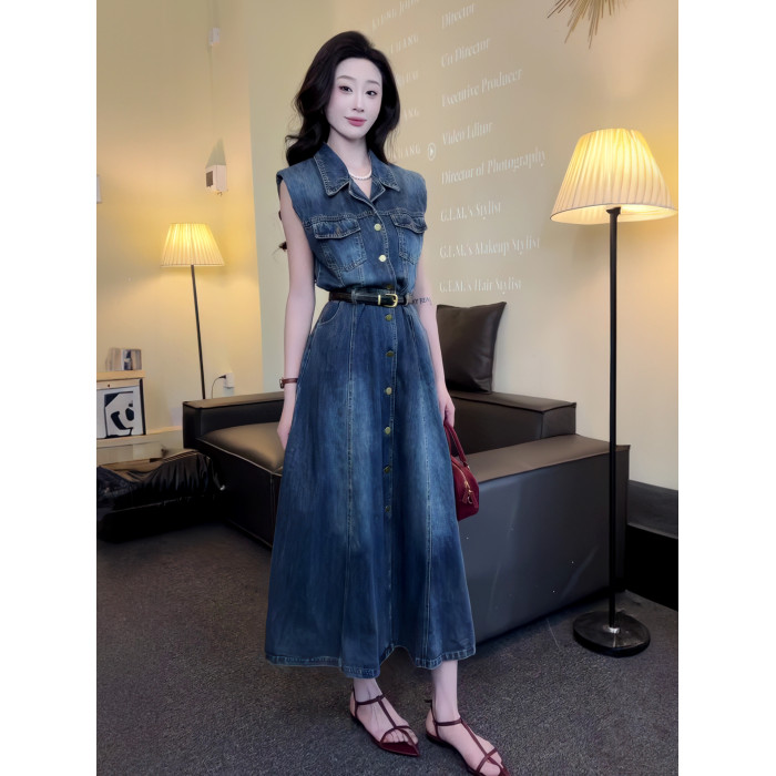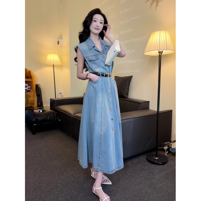 氣質翻領單排釦無袖牛仔連衣裙女2025夏季新款收腰顯瘦背心長裙子