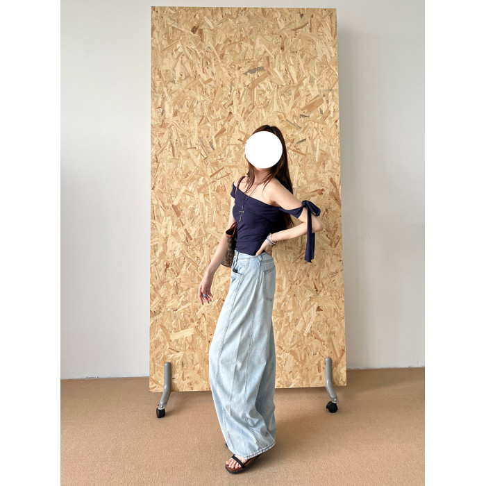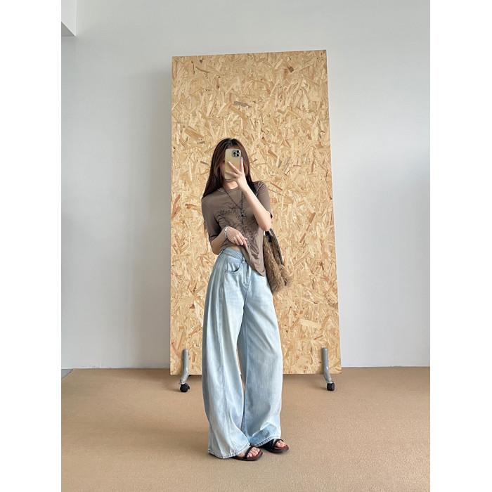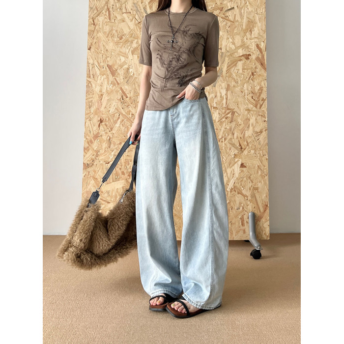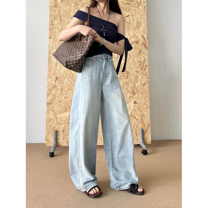 fuccykee美式復古水洗淺藍彎刀高腰牛仔褲女夏季薄款寬松濶腿褲