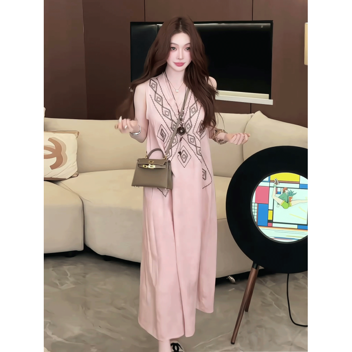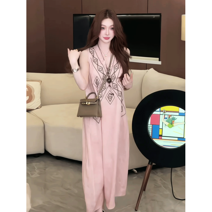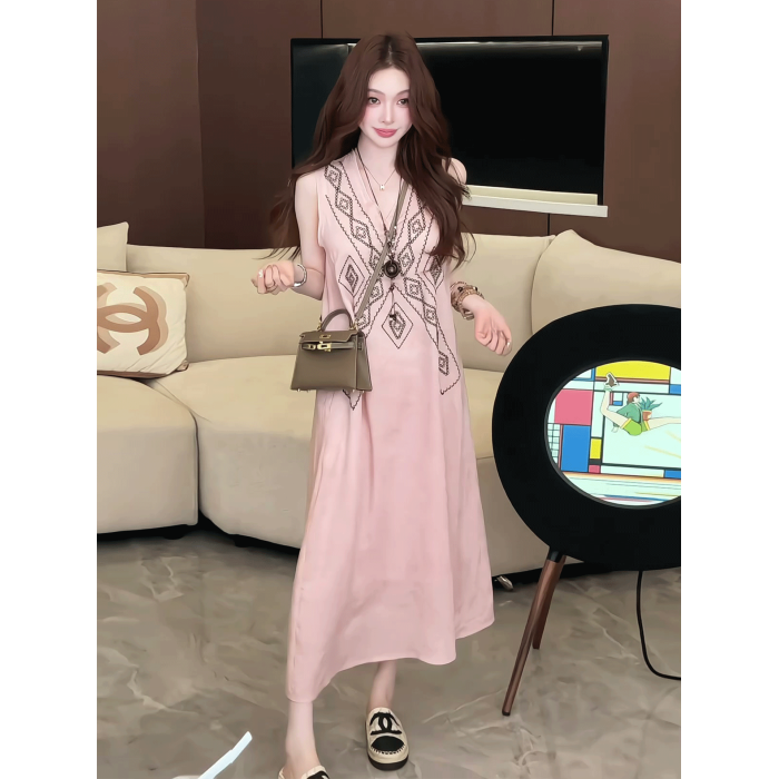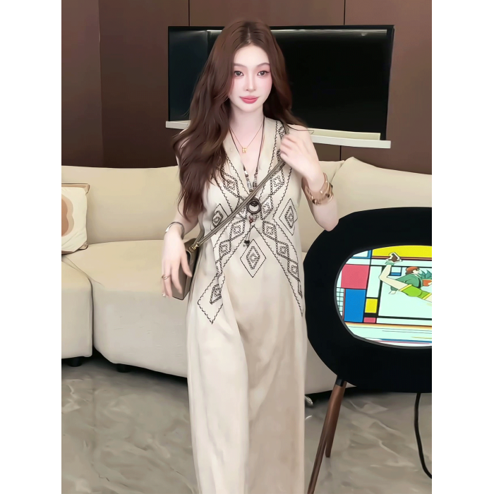海邊度假風印花無袖連衣裙女裝2025夏季新款法式復古寬松顯瘦長裙